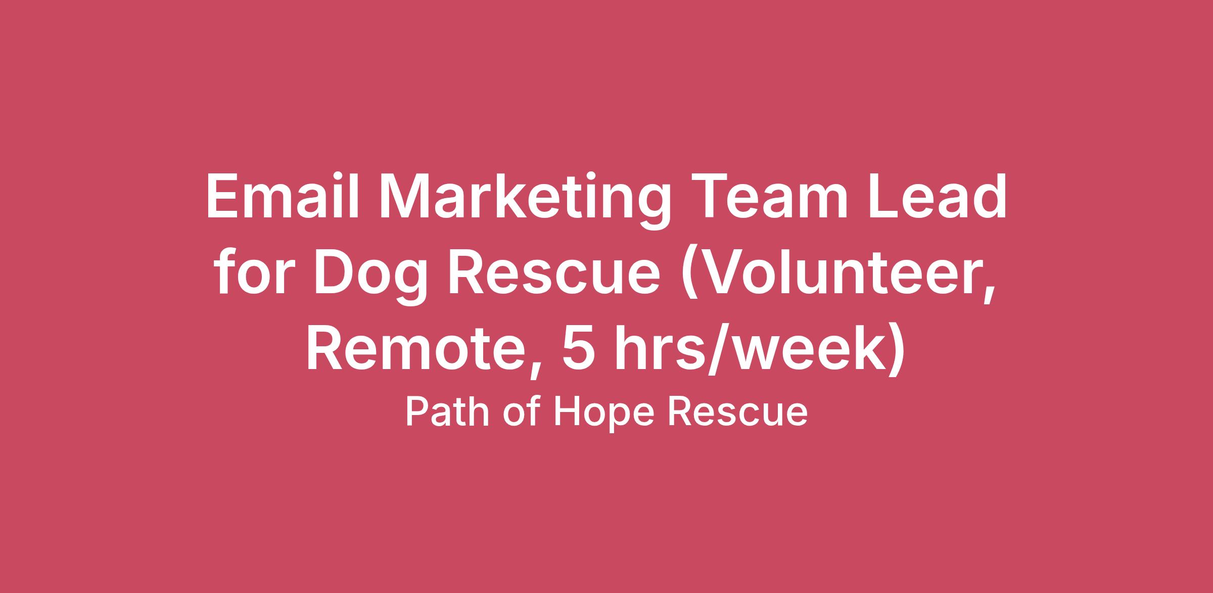Updated/Reviewed 04.08.26 Email Marketing Pack Leader Job Industry: Charity / Social Services / Non- Profit Organization Position Name: Email Marketing Team Lead for Dog Rescue - Volunteer (Unpaid) Job Location: Spokane, Washington, United States Job Type: Part TimeOffice Setting: Fully RemoteRemote: YesCompensation: VolunteerHours Per Week: 5 (flexible) Role Mission The Email Pack Leader oversees a team of Email Marketers in the planning, delegation and execution of email campaigns. They will provide guidance on content development, segmentation strategies, and campaign timing. They will lead, mentor and train their team in an online/remote environment, collaborating with other leaders and departments within the Rescue to execute email campaigns that align with our brand tone, goals and messaging. What Winning Looks LikeKey Results Area #1 - Campaign Strategy and Execution Oversee and delegate the planning and execution of email campaigns, ensuring alignment with the rescue's mission, goals, and audience needs.Develop and implement targeted messaging strategies based on audience segmentation to increase engagement and conversions (adoptions, donations, volunteering).Ensure timely delivery of campaigns around key events, fundraising drives, and adoption promotions, while maintaining a consistent communication calendar. Key Results Area #2 - Performance Analysis and Optimization Regularly monitor and analyze key metrics (open rates, click-through rates, conversions) to assess the performance of email and text campaigns.Identify trends and areas for improvement, refining messaging, content, and delivery strategies based on data-driven insights.A/B tests different messaging, formats, and sending times to continuously improve engagement and effectiveness. Key Results Area #3 - Team Leadership and Collaboration Lead and mentor the Email Marketers, ensuring they are well-supported, trained, and aligned with the rescue's communication strategy and brand tone.Foster a collaborative environment where team members can share ideas and innovate, while ensuring consistency in tone and messaging. Coordinate with other teams, such as Social Media, Creative, and Web, to ensure cohesive branding and messaging across all channels. Needed Skills Leadership experience in a remote environmentEmail marketing experienceStrong written communicationAbility to pull information from several sources and departments and create a cohesive project assignmentWilling to improve processes and create standardization Unique Company Culture and Mission Our Mission At Path of Hope Rescue we save pregnant dogs and puppies from high kill shelters in the Southern United States. Our Spokane, Washington based Rescue strives to decrease the euthanasia rate of high risk dogs in the southern United States by transporting pregnant dogs and puppies to the Pacific Northwest to find adoptive homes. We do not have a kennel or building location and are 100% foster based. We currently have two paid employees and rely heavily on volunteers and fosters as we work to build out our paid staff roles. Our Vision.Eliminating euthanasia of dogs in the South by decreasing the amount of dogs breeding unchecked and becoming the number one 'dog destination' in Spokane by capitalizing on Spokane's love of Rescue Dogs. Core Values: Transparency - sharing the good with the bad Community - dog loving people who treat each other well Integrity - doing what you say will do Golden Rule - treating others how you would want to be treated Our Company Culture We are freedom loving American Patriots who love dogs, love freedom and love Jesus.No NGO status here, we don't take a single penny from the government. We are 100% funded by small donors and our adoption program, with a few small private grants here and there. We built this organization from the ground up in 2018 with $87. We are built tough and believe that hard work pays off. We're about rolling up our sleeves and taking responsibility for our own actions. We don't do drama. There are no victims here and the system isn't out to get you, the only thing standing in your way is you and your attitude. We reward merit, not DEI or pronouns. We don't bend to the cultural rot out there. At the core of who we are, we love dogs. At PHR you will find people who recognize your dog before they recognize you. Where it's normal for your dog to have his own Instagram and people who expect to be invited to your dog's birthday party. We are focused on building a strong, positive community, one dog and one person at a time. We know dogs are family and should be treated that way. And we are driven by a shared passion to make sure every dog who isn't being loved, finds their way to a family. We care for each other and have created a community of people who love making a difference in this world.