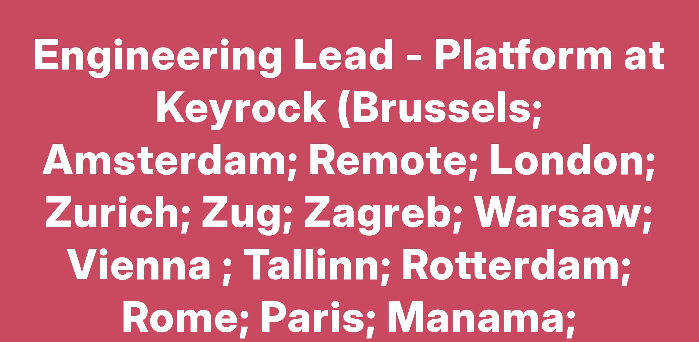 Engineering Lead - Platform at Keyrock (Brussels; Amsterdam; Remote; London; Zurich; Zug; Zagreb; Warsaw; Vienna ; Tallinn; Rotterdam; Rome; Paris; Manama; Luxembourg; Lisbon; London; Geneva; Frankfurt; Eindhoven; Dublin; Copenhagen; Budape)