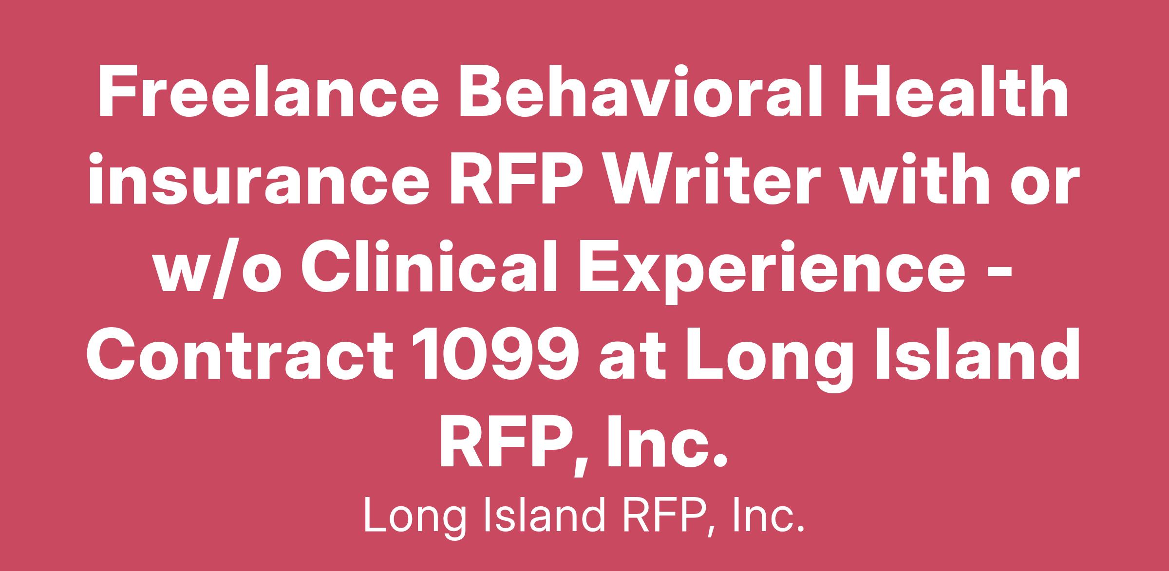 We are looking for remote freelance/1099 independent contractor Behavioral Health insurance writers, located within the United States to help with developing high-quality proposal-ready narratives in response to Behavioral Health RFPs. Applications will not be considered if you do not have specific Behavioral Health RFP/ Proposal Writing experience.