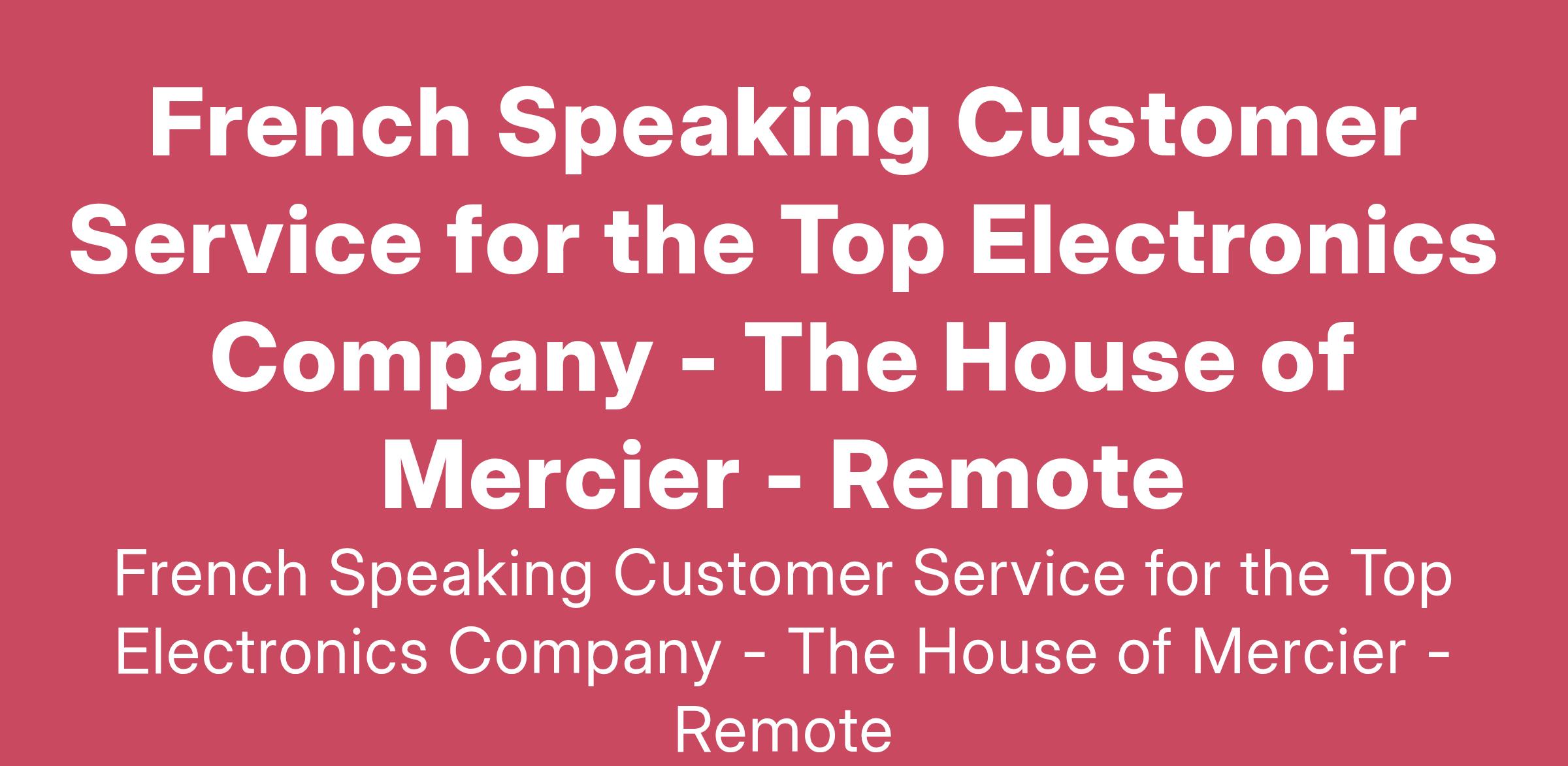 The House of Mercier is an innovative recruitment agency dedicated to matching talented individuals with exciting career opportunities across the world. We are currently seeking a French Speaking Customer Service Representative to join the team of a top electronics company known for its cutting-edge technology and commitment to excellence. In this dynamic role, you will be the first point of contact for French-speaking customers, providing them with the support and guidance they need to enhance their experience with our client’s products. You will play an essential role in ensuring customer satisfaction by addressing inquiries, resolving issues, and delivering exceptional service. This is an excellent opportunity for individuals who are passionate about consumer services and are eager to represent a leading brand in the electronics industry. If you thrive in a fast-paced environment and enjoy helping others, this position could be the perfect fit for you. Join us at The House of Mercier, where we connect talent with opportunity and take the next step in your career while helping customers find their best solutions in the world of electronics.