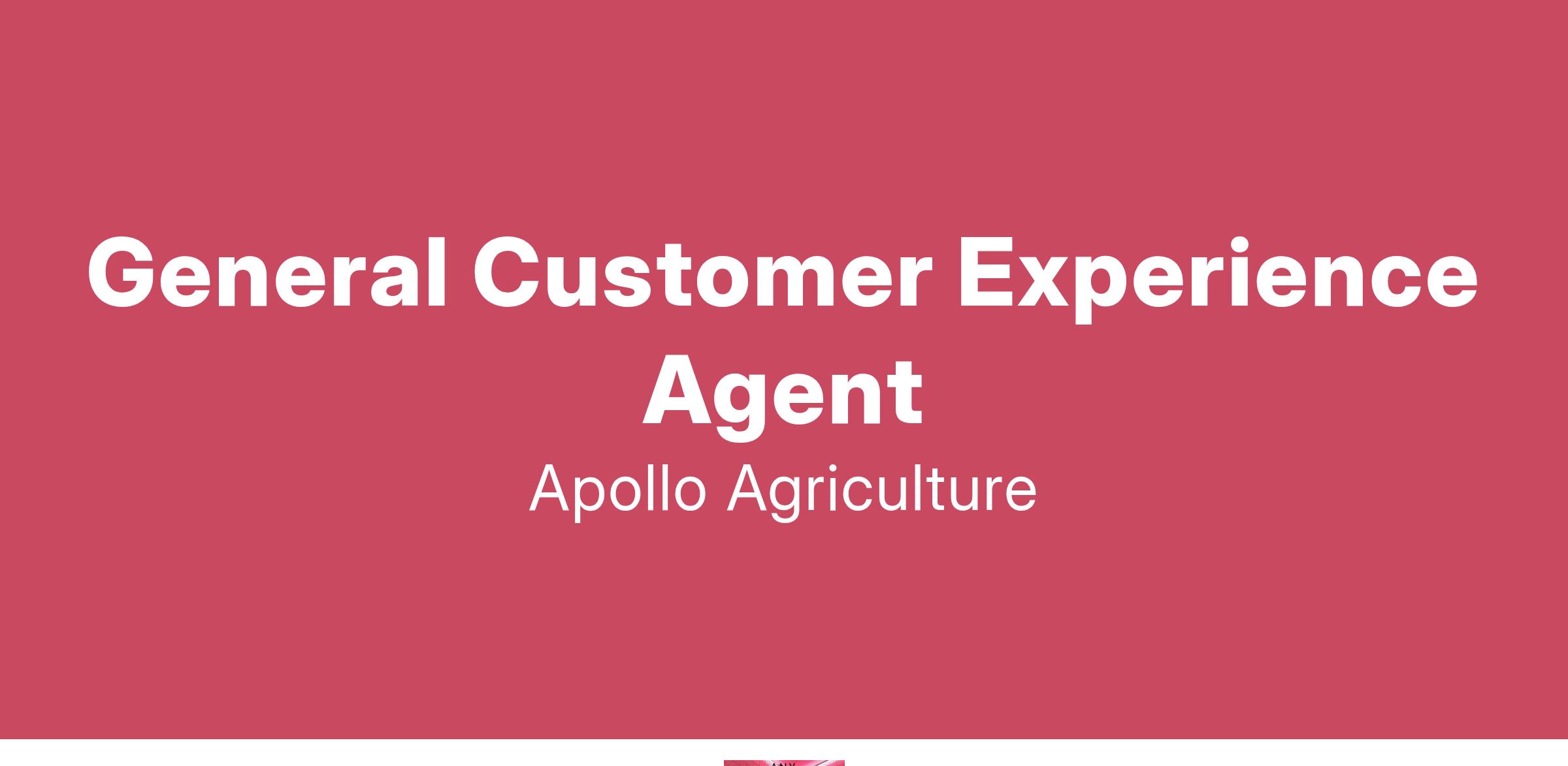 We are seeking experienced call center executives to join out team as General Customer Experience agents. The General Customer Experience Agent is a key member of Apollo Agricultureâs General Agent Pool, working within the dynamic General Customer Support Workstream. This role involves handling customer inquiries, conducting outbound calls, and ensuring excellent service delivery. Agents are allocated to different queues based on work volume, and assignments can change frequently, even hourly, to meet the demands of a fast-paced call center environment.