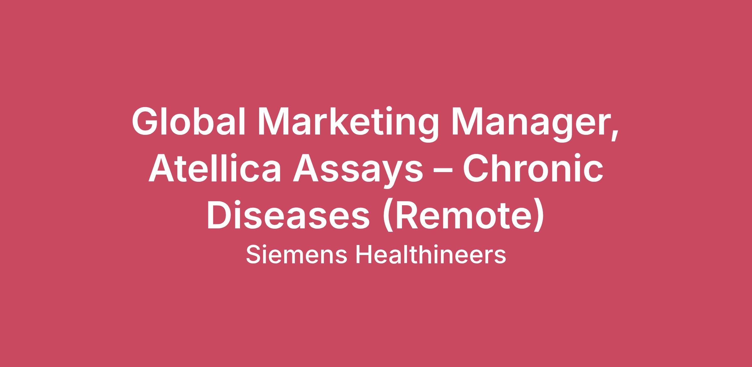 Join us in pioneering breakthroughs in healthcare. For everyone. Everywhere. Sustainably.Our inspiring and caring environment forms a global community that celebrates diversity and individuality. We encourage you to step beyond your comfort zone, offering resources and flexibility to foster your professional and personal growth, all while valuing your unique contributions.Manages and defines the product(s), solution(s) and/or service(s) assigned and drives their business performance across the whole product lifecycle.Global Marketing Manager, Atellica Assays – Chronic DiseaseSiemens Healthineers is a global leader in medical technology, dedicated to improving patient outcomes through innovative solutions in laboratory diagnostics.Our Diagnostics portfolio includes a comprehensive range of in-vitro diagnostic products and services, supporting healthcare providers across diverse clinical settings, from centralized reference and hospital laboratories to emergency departments, and physician offices. We serve a broad range of diagnostics disciplines, including immunochemistry, hematology, coagulation, urinalysis, and blood gas analysis.At Siemens Healthineers, our mission is to empower healthcare professionals with accurate, timely, and actionable insights that support better clinical decisions and ultimately improve patient care. As part of our expanding Global Marketing Organization, we are seeking a Global Marketing Manager for Atellica assays – Chronic Disease portfolio. In this role, you will play a critical role in defining, developing, and commercializing our Core Laboratory Solutions (CLS) offerings that impact patient outcomes globally. If you are passionate about shaping the future of diagnostics and thrive in a cross-functional, fast-paced environment, this is your opportunity to drive innovation and deliver meaningful value to our customers around the world.Your role:* End to End Chronic Disease Portfolio Ownership: Own the full lifecycle of the Chronic Disease product portfolio, from product definition and strategic planning to launch, positioning, and post-launch marketing. Develop and execute go-to-market strategies and integrated campaigns to drive commercial success. Ensure cross-functional alignment (R&D, zone marketing, sales, regulatory, clinical, etc.) to deliver differentiated, customer-focused solutions. * Customer and Market Insights: Serve as a Chronic Disease subject matter expert across stakeholder groups including laboratorians, hospital administrators, and ministries of health. Gather and interpret market dynamics and customer insights to shape portfolio strategy and inform product innovation.* Competitive Selling Strategies: Monitor and analyze competitive offerings. Develop positioning, messaging, and sales enablement tools that clearly differentiate our products and demonstrate added value to customers.* Product Definition & Development: Translate customer needs into well-defined product requirements and design inputs. Leverage voice-of-customer research, zone input, and market analysis to guide development teams and ensure market-relevant product delivery. Your expertise:Required:5+ years of progressive marketing and/or product management experience in the in-vitro diagnostics (IVD) or core laboratory diagnostics space.Proven end-to-end experience including market research, product definition, NPD support, launch planning, campaign execution, sales enablement, and training development.Preferred:Clinical Chemistry or Immunoassay background.MBA or advanced degree in Business, Life Sciences, Engineering, or related discipline.Global or international experience strongly preferred.Key Attributes:Customer-Centric: Passion for transforming insights into action.Collaborative: Strong cross-functional team player with influencing skills.Communicative: Excellent written and verbal communication skills tailored to diverse audiences.Curious: Deep curiosity for market trends, customer behavior, and unmet needs.Organized: Strong project management and prioritization skills.Additional InformationWork Environment: RemoteTravel: Up to 10%Who we are: We are a team of more than 72,000 highly dedicated Healthineers in more than 70 countries. As a leader in medical technology, we constantly push the boundaries to create better outcomes and experiences for patients, no matter where they live or what health issues they are facing. Our portfolio is crucial for clinical decision-making and treatment pathways.How we work: When you join Siemens Healthineers, you become one in a global team of scientists, clinicians, developers, researchers, professionals, and skilled specialists, who believe in each individual’s potential to contribute with diverse ideas. We are from different backgrounds, cultures, religions, political and/or sexual orientations, and work together, to fight the world’s most threatening diseases and enable access to care, united by one purpose: to pioneer breakthroughs in healthcare. For everyone. Everywhere. Sustainably.To find out more about Siemens Healthineers businesses, please visit our company page here.The base pay range for this position is:$131,910 - $181,379Factors which may affect starting pay within this range may include geography/market, skills, education, experience, and other qualifications of the successful candidate.If this is a commission eligible position the commission eligibility will be in accordance with the terms of the Company's plan. Commissions are based on individual performance and/or company performance. The Company offers the following benefits for this position, subject to applicable eligibility requirements: medical insurance, dental insurance, vision insurance, 401(k) retirement plan. life insurance, long-term and short-term disability insurance, paid parking/public transportation, paid time off, paid sick and safe time.Equal Employment Opportunity Statement: Siemens Healthineers is an Equal Opportunity and Affirmative Action E