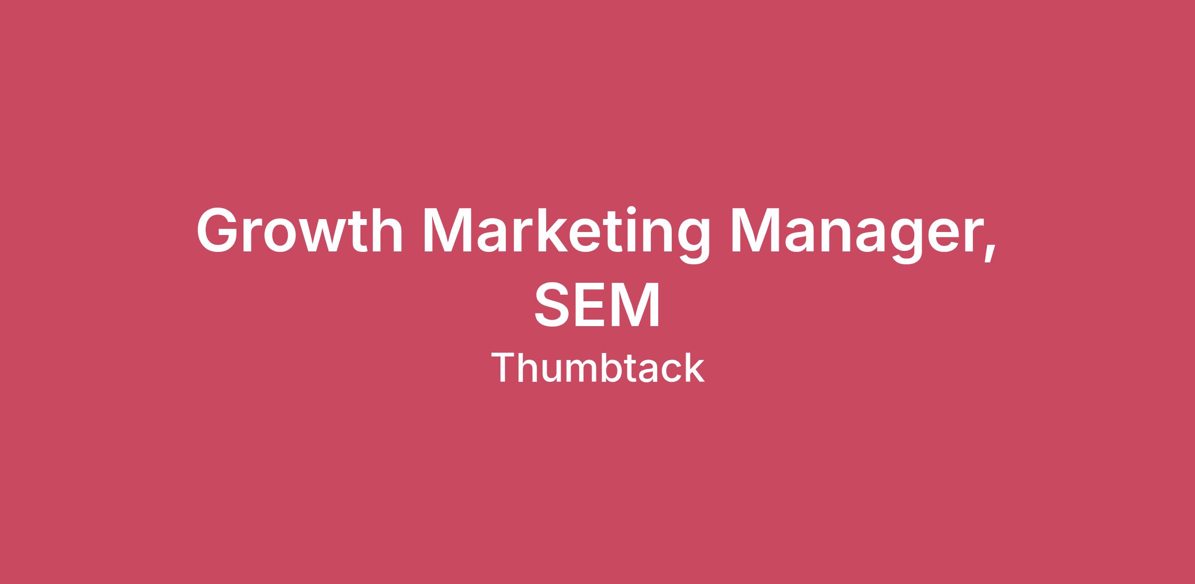 Thumbtack helps millions of people confidently care for their homes. Thumbtack is the one app you need to take care of and improve your home — from personalized guidance to AI tools and a best-in-class hiring experience. Every day in every county of the U.S., people turn to Thumbtack to complete urgent repairs, seasonal maintenance and bigger improvements. We help homeowners know which projects to do, when to do them and who to hire from our growing community of 300,000 local service businesses. If making an impact inspires you, join us. Imagine what we’ll build together.About the Growth Marketing Team We’re a team of digital marketers that create engaging campaigns across channels and we work closely with cross-functional partners (Brand, Product, Engineering, and Data Science) to drive growth on both sides of Thumbtack’s marketplace. We are nimble, and innovative and our team’s mission is to help customers solve their home care needs by discovering and using Thumbtack’s platform. About the Role As Thumbtack strives to build a branded destination for home management services, we need to meet new customers where they are. The Growth Marketing Manager, SEM will support Thumbtack’s efforts to capture customer demand for local services, while working with Data Science to calculate lifetime value targets, partnering with Engineering to build data pipelines that support bid automation and new tools for ad creation at scale, and collaborating with the larger Growth Marketing team to build effective full-funnel marketing programs. What you'll do Execute & improve Thumbtack’s paid search strategy, identifying new opportunities for customer and pro growth Manage, optimize, and grow the SEM program across Google and Microsoft, adhering to KPIs Develop experimentation roadmap for ad copy, keywords, bidding and more Partner with cross-functional data science, analytics, and engineering teams to build automation and scalable tools Own the tracking, attribution, and measurement of performance metrics (iROAS, incrementally, lift, etc.) using a combination of in-house and third-party data In order to be successful, you must bring 8+ years experience in paid digital advertising, with a proven track record of improving and scaling ad programs with specific conversion volume and efficiency goals Demonstrated experience improving performance of SEM campaigns through testing, optimization, automation, and creative Ability to manage relationships with a large portfolio of ad vendors and partners Ability to define and execute on a 6-12 month roadmap with aggressive milestones Experience with TROAS + LTV bidding Strong data analytics skills (pivot tables, vlookups, basic modeling) Strong fluency with generative AI and automation tools and a track record of integrating them into day to day SEM execution and analysis Expected salary ranges For candidates living in Ontario and British Columbia, the expected salary range for the role is currently $97,800.00 - $126,500.00. Actual offered salaries will vary and will be based on various factors, such as calibrated job level, qualifications, skills, competencies, and proficiency for the role. Note: Thumbtack uses AI tools to support our resume screening process. However, our Recruiting team’s expertise and judgment guide hiring decisions. #LI-RemoteThumbtack embraces diversity. We are proud to be an equal opportunity workplace and do not discriminate on the basis of sex, race, color, age, pregnancy, sexual orientation, gender identity or expression, religion, national origin, ancestry, citizenship, marital status, military or veteran status, genetic information, disability status, or any other characteristic protected by federal, provincial, state, or local law. We also will consider for employment qualified applicants with arrest and conviction records, consistent with applicable law. Thumbtack is committed to working with and providing reasonable accommodation to individuals with disabilities. If you would like to request a reasonable accommodation for a medical condition or disability during any part of the application process, please contact: recruitingops@thumbtack.com. If you are a California resident, please review information regarding your rights under California privacy laws contained in Thumbtack’s Privacy policy available at https://www.thumbtack.com/privacy/. We put as much craftsmanship into candidate safety as we do into the hiring experience itself. While scammers may try to impersonate our team, we’ll never ask you for money, banking info, or SSNs during hiring. Check out our blueprint on how to spot the fakes.