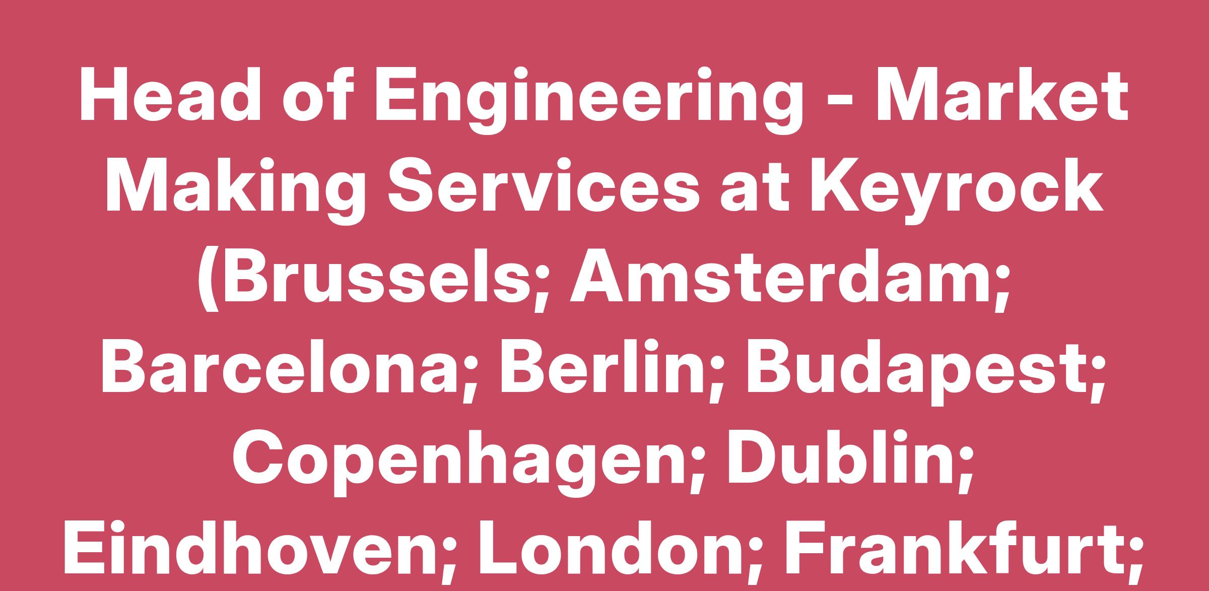 Head of Engineering - Market Making Services at Keyrock (Brussels; Amsterdam; Barcelona; Berlin; Budapest; Copenhagen; Dublin; Eindhoven; London; Frankfurt; Geneva; Lisbon; Luxembourg; Zurich; Zug; Zagreb; Warsaw; Vienna ; Rotterdam; Rome; Paris)
