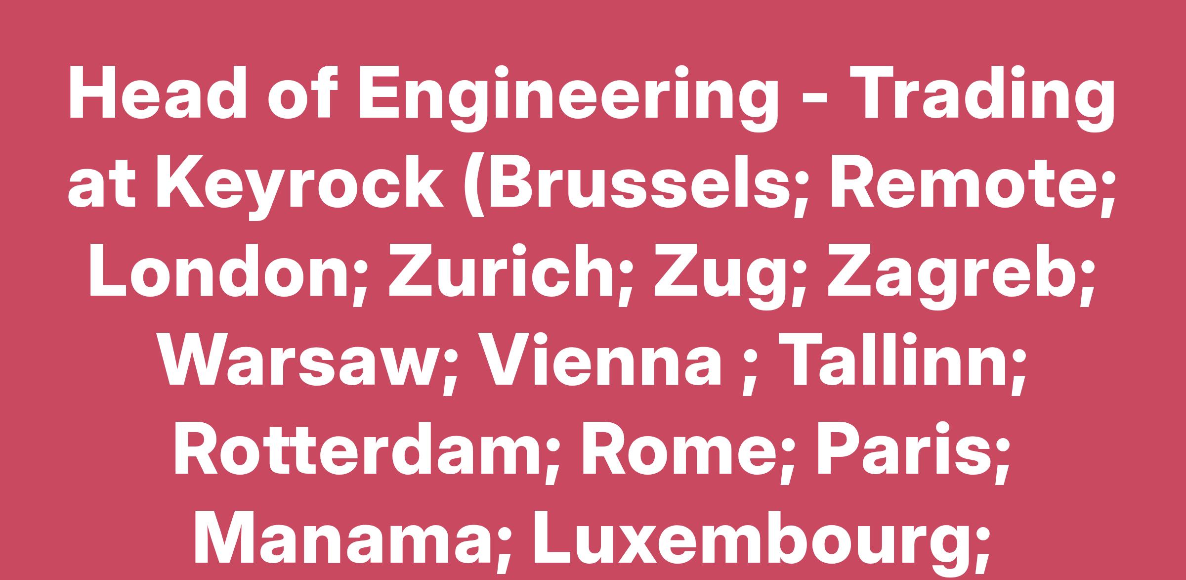 Head of Engineering - Trading at Keyrock (Brussels; Remote; London; Zurich; Zug; Zagreb; Warsaw; Vienna ; Tallinn; Rotterdam; Rome; Paris; Manama; Luxembourg; London; Lisbon; Johannesburg; Ghent; Geneva; Frankfurt; Eindhoven; Dublin; Copenhag)