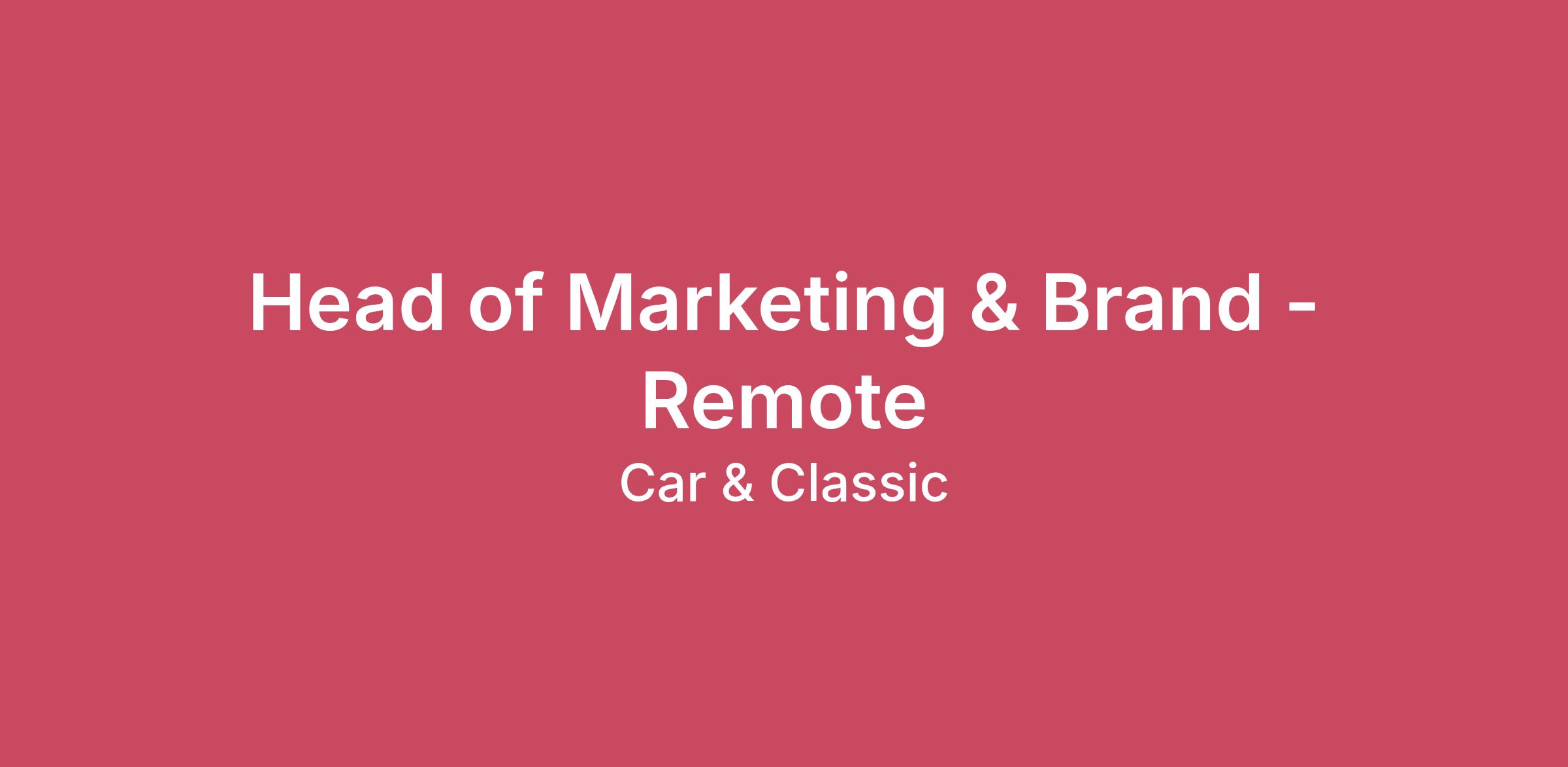 About youYou’re a marketing & brand leader who understands that great brands are built through trust, community and cultural credibility, not just campaigns. You care about how stories land, how tone evolves, and how brands earn long-term loyalty from passionate audiences.You enjoy shaping positioning and narrative, working closely with creators and communities, and ensuring the brand feels authentic rather than manufactured. You’re confident making creative decisions, setting standards, and protecting brand integrity even when trade-offs exist.You are a strategic and hands-on marketing leader who builds marketing systems that drive real outcomes. You have experience bringing together brand, campaigns, content, PR, and channels into one cohesive system. You care about clarity, consistency, and quality, and you are comfortable operating as both a leader and an individual contributor when needed.About the roleWorking directly with our CEO, the Head of Marketing & Brand owns Car & Classic’s brand narrative, positioning, and cultural relevance. This role defines what the brand stands for, how it expresses itself, and how it builds long-term trust and desirability with enthusiasts.This is a player-coach role. You will define strategy and direction, but also contribute directly to the execution of shaping campaigns, writing and refining messaging, and improving output across channels.The role is responsible for aligning all external activity (campaigns, content, PR, creators and product launches) into one clear, consistent, and compelling narrative that drives growth.About us www.carandclassic.comCar & Classic is one of the largest automotive marketplaces in the world. Launched in 2005 but under new, VC-backed ownership since 2018 and on an exciting double-digit growth journey to bring classic vehicle transactions online.Our culture is incredibly important to us. We’re lucky enough to have built the team from scratch with a focus on enjoying the day-to-day, diversity, inclusion and high performance. We’re a fully remote team of builders, dreamers, and petrolheads using tech to connect enthusiasts with the machines that move them. If you’re driven by passion and curious about shaping the future of classic motoring online, you’ll fit right in.We’re looking for a Head of Marketing & Brand who has good, relevant experience and wants to make their mark in a rapid-growth business where they can make a real difference whilst enjoying the environment and culture.Role and responsibilities: Marketing system ownership: Ensure all external output (brand, campaigns, CRM, PR, content, social, partnerships) is aligned, consistent, and strategically coherent Brand positioning & voice: Define and evolve positioning and tone of voice, maintaining consistency across markets and channels Campaign leadership: Plan and deliver integrated campaigns and launches across all channels Content, PR & partnerships: Build and oversee a high-quality engine across creators, media, and partnerships Cross-functional alignment: Work closely with Product, CRM, Sales, and Design to ensure joined-up user journeys and messaging Marketing operations: Introduce clear planning, prioritisation, and execution frameworks (roadmaps, timelines, ownership) Market expansion: Support launches in new markets with strong brand clarity and consistent execution Hands-on leadership: Contribute directly to briefs, messaging, and campaign development in a lean environmentThe skills, attributes and experience you must have: Automotive or enthusiast interest: Genuine interest in cars and/or bikes, with motivation to engage with the community and audience Brand & marketing leadership: Proven experience leading brand and marketing in a high-growth environment Integrated marketing: Experience delivering cross-channel strategies that connect brand to commercial outcomes Strategic thinking: Ability to translate positioning into effective campaigns and execution Execution & delivery: Strong track record of delivering campaigns, launches, and projects to a high standard Organisation & ownership: Ability to manage multiple priorities, timelines, and stakeholders effectively✍ Communication & narrative: Strong ability to shape messaging, storytelling, and positioning Hands-on capability: Comfortable contributing directly to work in a lean teamThe skills, attributes and experience it would be nice to have: Marketplace experience: Experience working in a two-sided platform or marketplace Start-up/Scale-up experience: Experience working within a high-growth start-up or scale-up environment Content & PR exposure: Experience working with creators, media, or partnerships International expansion: Experience launching or scaling in new markets Community-led brands: Exposure to enthusiast or community-driven productsThis role probably isn’t for you if: You prefer highly structured environments with narrow ownership You are not comfortable working across multiple marketing disciplines You prefer to stay fully strategic and avoid hands-on contribution You do not have an interest in cars, bikes, or enthusiast communitiesWhat do you get (remuneration & benefits)? Competitive & benchmarked base salary Generous stock options scheme All the equipment you need to get the job done Flexible working - work where and when you want to get the job done Access to free counselling, therapy and mental health support via Spill Professional development allowance Life cover Smart Health Generous parental leave 33 days holiday (including bank holidays) Ability to make your mark on a fast-growing start-upOur application processOnce you decide to apply you’ll be presented with a series of questions. The answers to the questions are the difference between your application being progressed or not. Please do give them your time and effort when answering.We want to hear from you, not AI. Using AI to write your answers will mean that your application will be rejected.Car & Cla