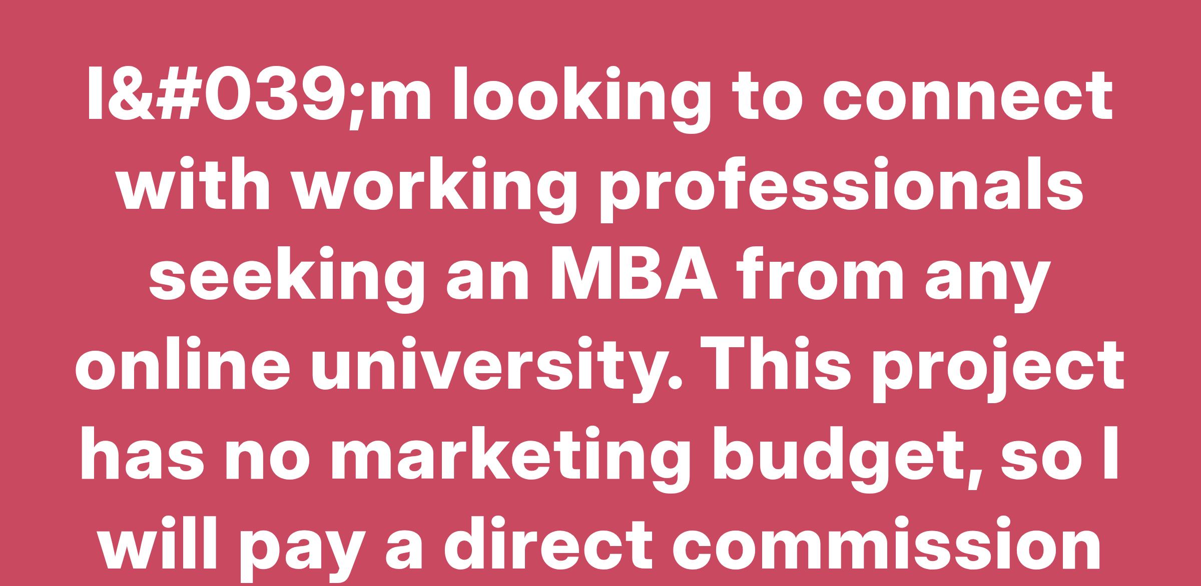 I'm looking to connect with working professionals seeking an MBA from any online university. This project has no marketing budget, so I will pay a direct commission on enrollment only. Ideal candidates... (Budget: ₹12500 - ₹37500 INR, Jobs: Business Writing, Marketing, Report Writing, Research, Research Writing)