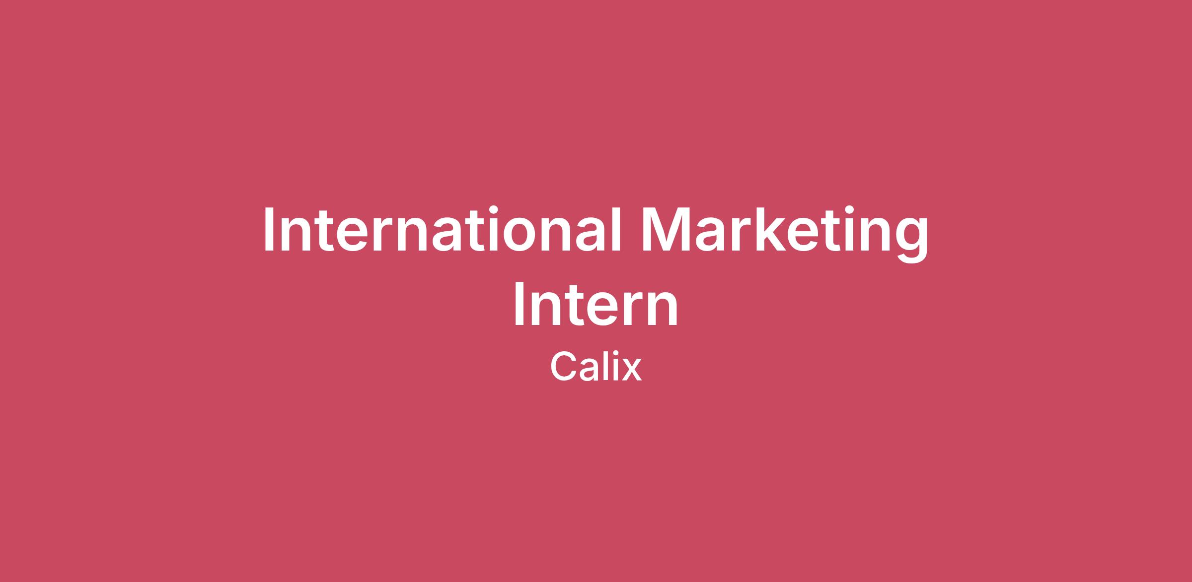This is a full time, remote Summer Internship that can be based anywhere in the United States or Canada. Calix is looking for an aspiring Business, Marketing, Communications or MBA student who is passionate about sales, international marketing and market research to join us for the Summer.In this role you will be part of a unique and award-winning internship program within the company. The program provides the opportunity to learn new skills through training and on the job learning. This position will be supporting our international Tier 1 – Tier 3 marketing and sales efforts across EMEA. The International Marketing Associate will lead their own project, working cross-functionally across Calix Events, Marketing Operations, and Success teams to support content development, data analysis and market research. This role offers a unique opportunity to support multiple international markets, collaborating with regional teams to develop localized marketing materials, competitive insights, and go-to-market strategies. The duration of the internship is expected to be 90 days.Responsibilities and Duties:Work with the Calix Marketing Team to understand the Calix value proposition.Conduct market research and competitive analysis to support international marketing strategies. Attend meetings and interact with the International Sales Team as required. Qualifications:Enrolled in an accredited university and working towards a Business, Marketing, Communications or Sales degree.Microsoft Office software experience (Outlook, Word, Excel, PowerPoint). Excel and data entry experience required.6sense certified and Gong proficiency required.Salesforce.com or Customer Relationship Management (CRM) experience preferred.Comfortable with technology and learning new applications and platforms.Strong analytical and research skills with the ability to interpret market trends.Excellent project management and organizational skills.Strong writing skills (German a plus).Familiarity with international markets and cultural nuances a plus.Ability to work independently, take initiative, and adapt in a fast-paced environment.Able to work for the complete summer break (May - August or June - September).Preference will be given to applicants who are currently in their Junior or Senior year of college with prior work experience.#LI-RemoteThe base pay range for this position varies based on the geographic location. More information about the pay range specific to candidate location and other factors will be shared during the recruitment process. Individual pay is determined based on location of residence and multiple factors, including job-related knowledge, skills and experience.San Francisco Bay Area:23.00 - 29.90 USD HourlySelect US Metros and States:20.00 - 26.00 USD HourlyOther US Locations:18.00 - 23.40 USD HourlyFor information on our benefits click here.