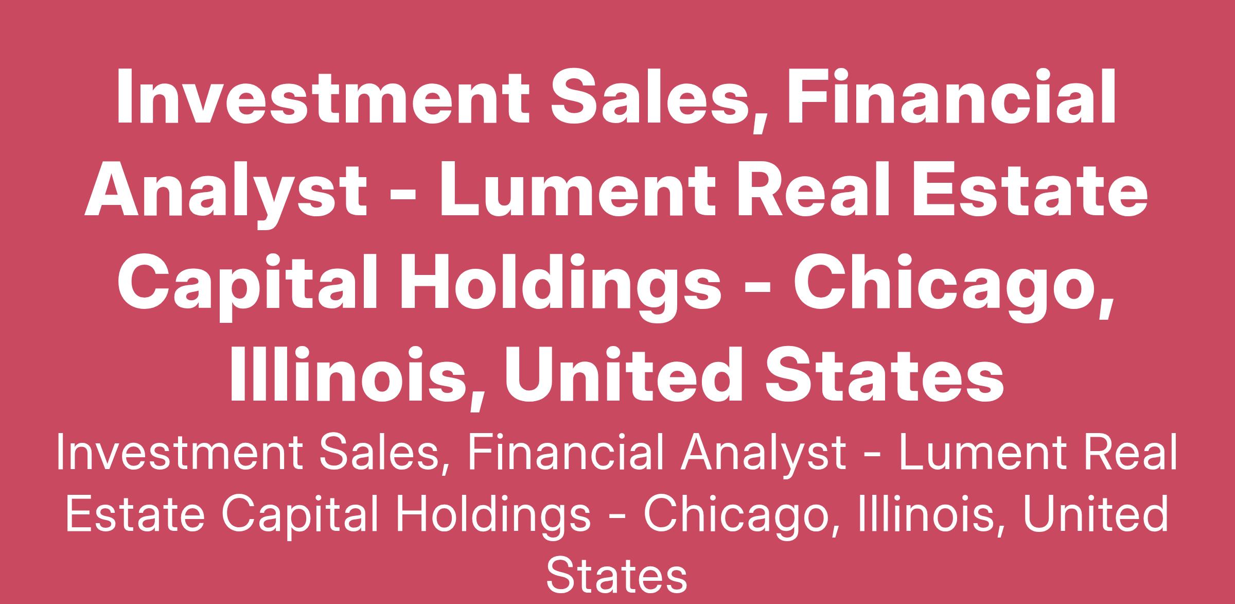 The Investment Sales Financial Analyst is focused exclusively on the sale of commercial real estate transactions. This position will have the opportunity to be involved in every stage of a transaction, including underwriting, market research, property tours, and preparation of offering memorandums, marketing, and term sheet negotiation, closing and client meetings/events. Will work in a high-energy, team-focused environment.