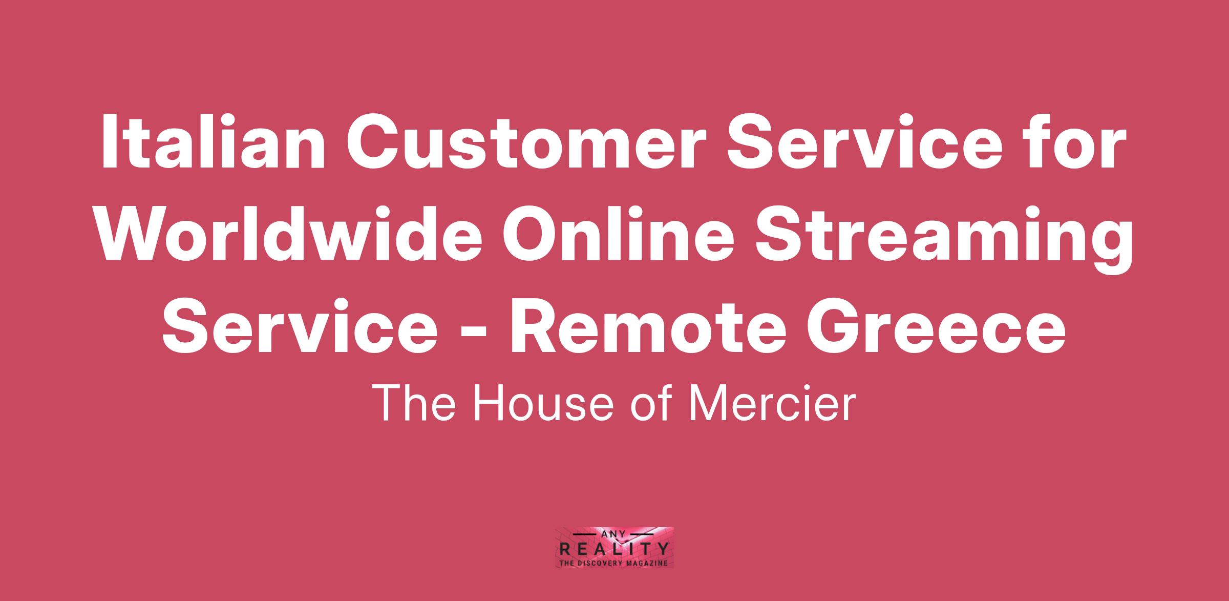 The House of Mercier is an innovative recruitment agency dedicated to matching talented individuals with exciting career opportunities across the world. We are currently seeking a passionate and dedicated Italian Customer Service representative to join a globally recognized online streaming service. This remote position offers the flexibility to work from anywhere in Greece while providing exceptional customer support to users from around the globe. As a key member of our customer service team, you will play a vital role in ensuring that our Italian-speaking customers have a seamless experience while enjoying our streaming services. Your role will involve addressing inquiries, resolving issues, and providing high-quality support to enhance customer satisfaction. You will have the opportunity to interact with a diverse range of clients and contribute to the overall success of the service. If you are fluent in Italian, have a strong customer service background, and are passionate about the entertainment industry, we’d love to hear from you! Our collaborative work culture, commitment to professional development, and focus on results make The House of Mercier the perfect place to elevate your career in consumer services at a world-leading streaming platform.
