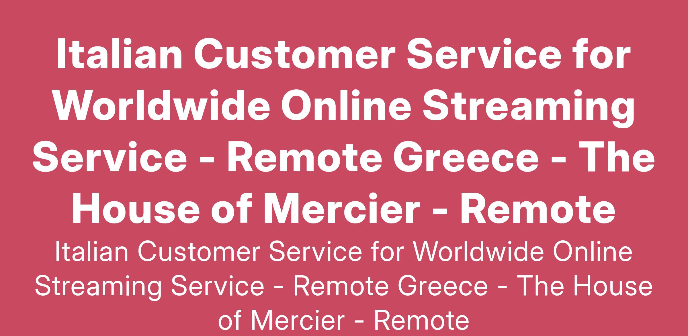 The House of Mercier is an innovative recruitment agency dedicated to matching talented individuals with exciting career opportunities across the world. We are currently seeking a passionate and dedicated Italian Customer Service representative to join a globally recognized online streaming service. This remote position offers the flexibility to work from anywhere in Greece while providing exceptional customer support to users from around the globe. As a key member of our customer service team, you will play a vital role in ensuring that our Italian-speaking customers have a seamless experience while enjoying our streaming services. Your role will involve addressing inquiries, resolving issues, and providing high-quality support to enhance customer satisfaction. You will have the opportunity to interact with a diverse range of clients and contribute to the overall success of the service. If you are fluent in Italian, have a strong customer service background, and are passionate about the entertainment industry, we’d love to hear from you! Our collaborative work culture, commitment to professional development, and focus on results make The House of Mercier the perfect place to elevate your career in consumer services at a world-leading streaming platform.