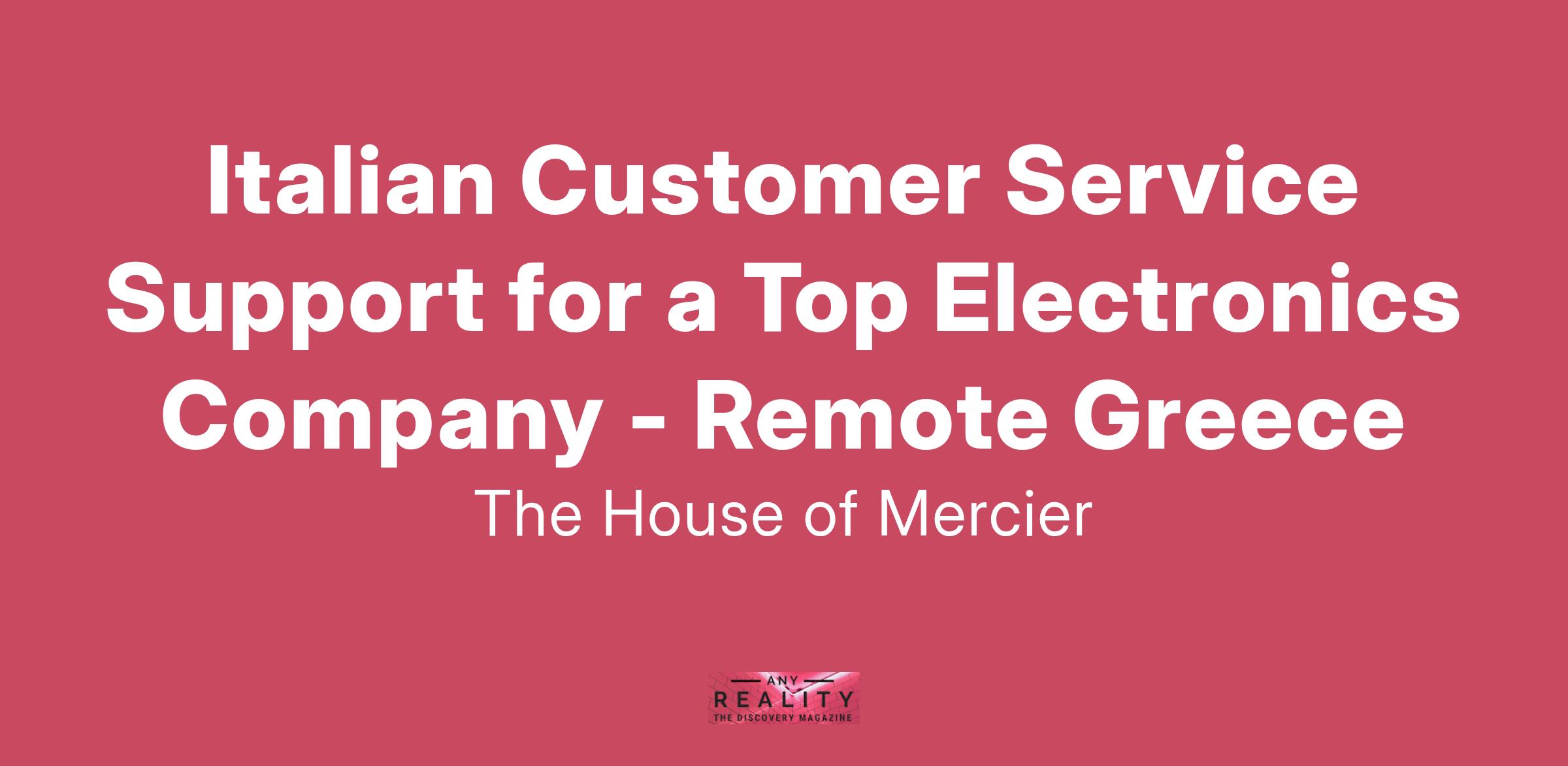 The House of Mercier is an innovative recruitment agency dedicated to matching talented individuals with exciting career opportunities across the world. We are currently seeking an enthusiastic and dedicated individual for the role of Italian Customer Service Representative for a leading electronics company, offering the convenience of a remote work environment based in Greece. This position is ideal for individuals who thrive in a fast-paced setting and possess a strong passion for technology and customer support. As part of our recruitment, you will join a prestigious brand within the consumer services industry. You will be the bridge between the company and its customers, ensuring that their inquiries and issues are resolved efficiently and effectively. The ideal candidate will be committed to delivering the highest level of customer satisfaction while having the flexibility to work from the comfort of their own home. If you are fluent in Italian and have a knack for problem-solving with a friendly demeanor, this opportunity could be the perfect fit for you. Join us in providing exceptional service and support as we redefine the customer service experience in the electronics sector.