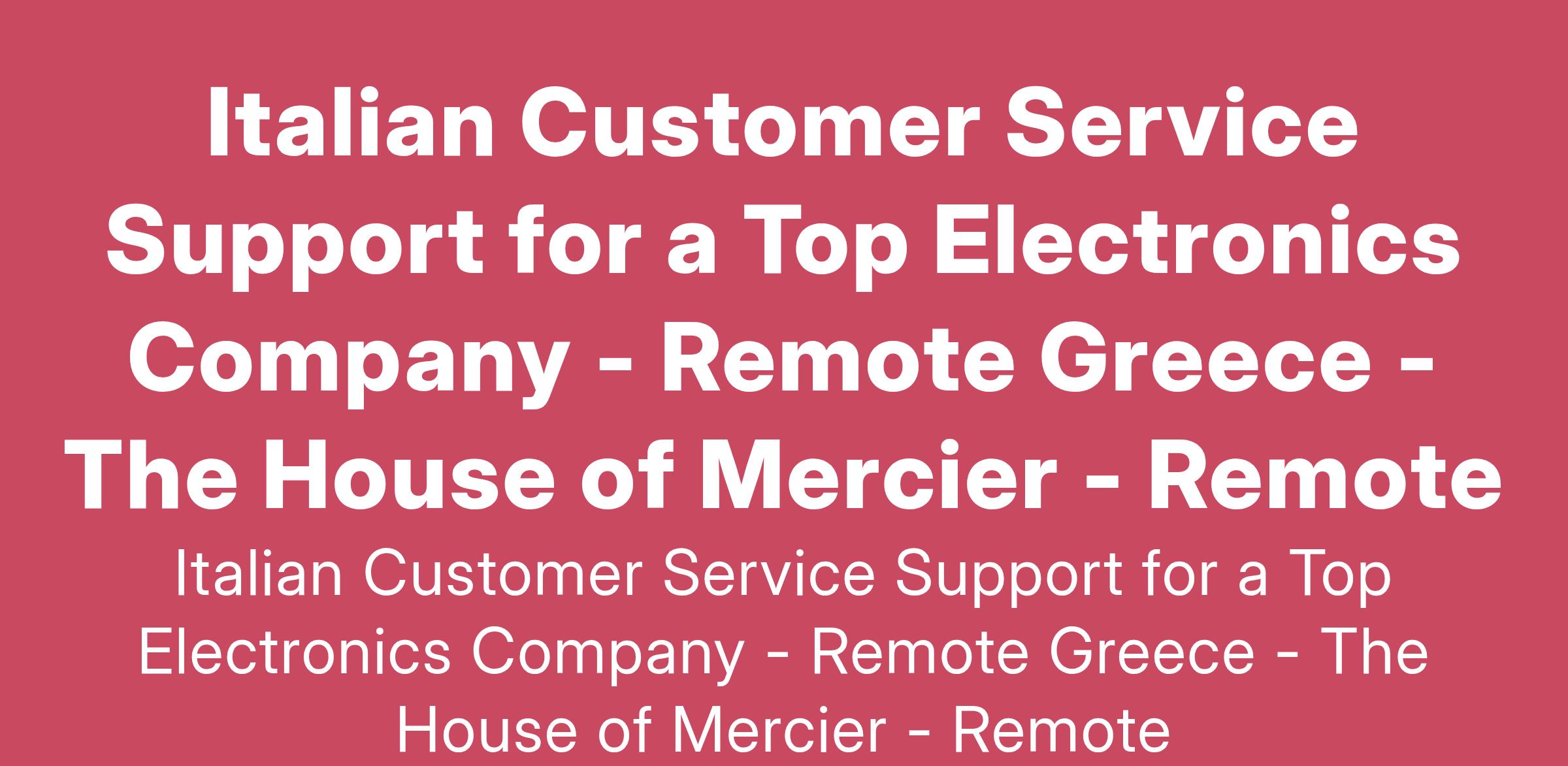 The House of Mercier is an innovative recruitment agency dedicated to matching talented individuals with exciting career opportunities across the world. We are currently seeking an enthusiastic and dedicated individual for the role of Italian Customer Service Representative for a leading electronics company, offering the convenience of a remote work environment based in Greece. This position is ideal for individuals who thrive in a fast-paced setting and possess a strong passion for technology and customer support. As part of our recruitment, you will join a prestigious brand within the consumer services industry. You will be the bridge between the company and its customers, ensuring that their inquiries and issues are resolved efficiently and effectively. The ideal candidate will be committed to delivering the highest level of customer satisfaction while having the flexibility to work from the comfort of their own home. If you are fluent in Italian and have a knack for problem-solving with a friendly demeanor, this opportunity could be the perfect fit for you. Join us in providing exceptional service and support as we redefine the customer service experience in the electronics sector.