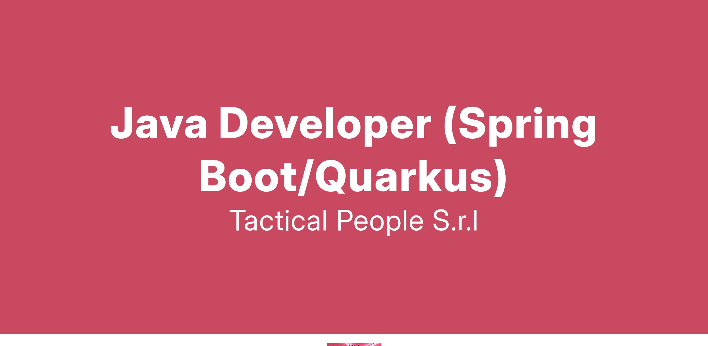 Unisciti a TACTICAL PEOPLE: Innovazione, Persone e Crescita nel Cuore della Digital Transformation Da oltre 20 anni, TACTICAL PEOPLE si posiziona come leader nel mercato ICT, guidando con passione e competenza i nostri clienti di medie e grandi dimensioni attraverso il dinamico percorso della digital transformation. La nostra mission è chiara: non solo abbracciare il cambiamento tecnologico, ma guidarlo, creando soluzioni all'avanguardia che plasmino il futuro digitale. In TACTICAL PEOPLE, crediamo fortemente nel mettere le persone al centro di ogni nostra iniziativa. Le persone sono il cuore pulsante della nostra azienda; il loro benessere, la loro crescita e il loro sviluppo sono la nostra priorità. Ci impegniamo a condividere le strategie aziendali con trasparenza e a fornire formazione e supporto a ogni livello, garantendo che ogni membro del team sia equipaggiato per eccellere e innovare. Stiamo cercando individui che condividano la nostra visione, che siano guidati dalla passione per la tecnologia e che desiderino essere protagonisti nella costruzione di un futuro digitale più luminoso. Se sei pronto a far parte di una squadra che valorizza il talento, incoraggia la crescita personale e professionale e lavora in prima linea nel settore della digital transformation, TACTICAL PEOPLE è il posto giusto per te. Posizione Aperta: Java Developer (Spring Boot/Quarkus) Sede: Remoto Descrizione del ruolo: Il candidato ideale deve avere almeno 2-4 anni di esperienza nello sviluppo di applicazioni Java (Spring Boot e Quarkus). Cosa offriamo: Inserimento immediato in una Tech Community giovane e dinamica. TACTICAL LEARNING HUB, con corsi di aggiornamento e formazione. Il presente annuncio è rivolto ad entrambi i sessi, ai sensi delle leggi 903/77 e 125/91, e a persone di tutte le età e tutte le nazionalità, ai sensi dei decreti legislativi 215/03 e 216/03. I curricula dovranno pervenire completi di dicitura che autorizza il trattamento dei propri dati: “Si autorizza al trattamento dei dati personali ai sensi del D. Lgs. 196/2003.