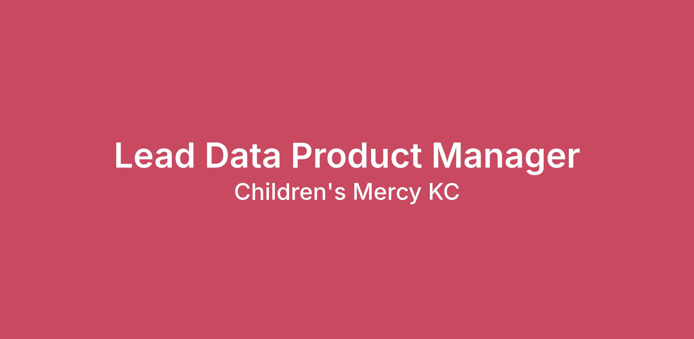 Thanks for your interest in Children's Mercy! Do you envision finding a meaningful role with an inclusive and compassionate team? At Children’s Mercy, we believe in making a difference in the lives of all children and shining a light of hope to the patients and families we serve. Our employees make the difference, which is why we have been recognized by U.S. News & World Report as a top pediatric hospital, for eleven consecutive years. Children’s Mercy is in the heart of Kansas City – a metro abounding in cultural experiences, vibrant communities and thriving businesses. This is where our patients and families live, work and play. This is a community that has embraced our hospital and we strive to say thanks by giving back. As a leader in children’s health, we engage in meaningful programs and partnerships throughout the region so that we can improve the lives of children beyond the walls of our hospital. Overview The role of Lead Data Product Manager at Children's Mercy Hospital will use the power of data to bring about incalculable value to our patients, their families, and our community. For this role, the key to delivering value is contingent upon the ability to capture, process, safeguard, and analyze internal data. The Lead Data Product Manager will use advanced analytical methods and technologies, including artificial intelligence in all its myriad forms to meet the data needs of the organization. The Lead Data Product Manager will establish a product management function for the Data Intelligence team. This pivotal role will serve as the primary coordinator and point of contact for new and ongoing Data & Analytics work streams, ensuring continuous delivery of the right work and alignment with higher level objectives. The Lead Data Product Manager will be a leader and a guide for the Data Intelligence team and will work with colleagues and collaborators to build impactful data-driven experiences across the business. At Children’s Mercy, we are committed to ensuring that everyone feels welcomed within our walls. A successful candidate for this position will join us as we strive to create a workplace that reflects the community we serve, as well as our core values of kindness, curiosity, inclusion, team and integrity. Additionally, it’s important to us that we remain transparent with all potential job candidates. Because we value the safety of the patients and families we serve, as well as the Children’s Mercy staff, we want to let you know that the seasonal influenza vaccine is a condition of employment for all employees in our organization. New employees must be willing to be vaccinated if found non-immune to measles, mumps, rubella (MMR) and chicken pox (varicella) and/or without evidence of tetanus, diphtheria, acellular pertussis (Tdap) vaccination since 2005. If you are selected for this position, you will be asked to supply your immunization records as proof of vaccination. If you and have any concerns about receiving these vaccines, medical and/or religious exemptions can be further discussed with Human Resources. Responsibilities Engage with stakeholders to produce solution roadmaps in alignment with the strategic objectives of Children's Mercy as well as our enterprise data strategy.Devise and lead our project intake and prioritization framework to consistently identify and deliver the "right work".Partner with Data Intelligence in establishing the Product Management function at Children's Mercy by demonstrating and promoting the proper standards, practices, and procedures. Qualifications Bachelor's Degree in related field and 7 or more years' experience with data platforms, data management, analytics, machine learning, and/or data visualization if no direct Product Management experience. Benefits at Children's Mercy The benefits plans at Children’s Mercy are one of many reasons we are recognized as one of the best places to work in Kansas City. Our plans are designed to meet the changing needs of our employees and their families. Learn more about Children’s Mercy benefits. Starting Pay Our pay ranges are market competitive. Remote Work/Work from Home This is an intermittent remote position, which means that the person hired will work with his or her manager to determine a schedule that includes both at home and on-site hours at a Children’s Mercy location. The incumbent must live in the Kansas City metro area. EEO Employer/Disabled/Vet Children’s Mercy hires individuals based on their job skills, expertise and ability to maintain professional relationships with fellow employees, patients, parents and visitors. A personal interview, formal education and training, previous work experience, references and a criminal background investigation are all factors used to select the best candidates. The hospital does not discriminate against prospective or current employees based on the race, color, religion, sex, national origin, age, disability, creed, genetic information, sexual orientation, gender identity or expression, ancestry or veteran status. A drug screen will be performed upon hire. Children’s Mercy is smoke and tobacco free. CM is committed to creating a workforce that supports the diverse backgrounds of our patients and families. We know that our greatest strengths come from the people who make up our team, so we hire great people from a wide variety of backgrounds, not just because it’s the right thing to do, but because it makes our hospital stronger and our patient care more compassionate. If you share our values and our enthusiasm for service, you will find a home at CM. In recruiting for our team, we welcome the unique contributions that you can bring, including education, ideas, culture, and beliefs.