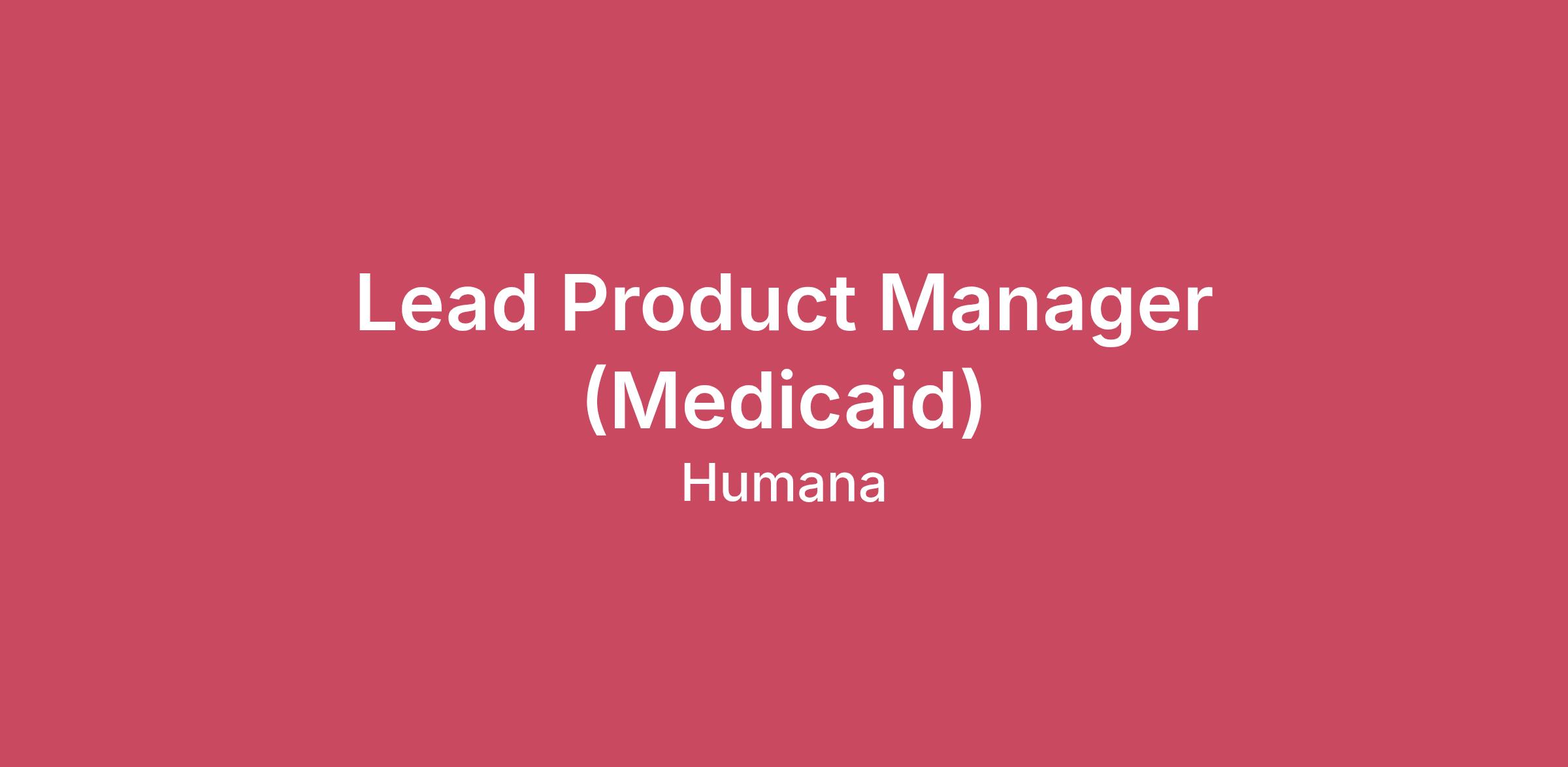 Become a part of our caring community and help us put health first Humana is seeking a highly skilled Lead Product Manager to own and advance the intake process and facilitate key Lean Portfolio Management (LPM) ceremonies for the Medicaid portfolio. The Lead Product Manager will be responsible for optimizing intake workflows, driving cross-functional collaboration, and managing vital meetings such as the Medicaid Triage and Product Standup.Oversee, maintain, and continuously improve the Medicaid intake process, ensuring requests are efficiently captured, prioritized, and assigned in accordance with Agility Enablement Hub Lean-Agile Center of Excellence (AEH LACE) guidelines.Serve as the primary facilitator for Medicaid Product Standup and Medicaid Triage meetings, ensuring effective communication, clear action items, and alignment with portfolio goals.Collaborate with stakeholders across business, technology, and product teams to ensure transparency and accountability in intake and triage activities.Monitor and report on intake process performance, identifying opportunities for automation and efficiency based on stakeholder feedback and Key Performance Indicators (KPIs).Support continuous prioritization efforts, aligning new work requests with ongoing initiatives and strategic objectives using Lean Portfolio Management (LPM) principles.Leverage tools such as Jira Align and Azure DevOps (ADO) to track requests, manage Kanban boards, and report on Key Performance Indicators (KPIs).Ensure compliance with established portfolio management standards and lead process improvement initiatives.Foster a culture of collaboration and excellence within the Medicaid product team and with cross-functional partners.Use your skills to make an impact Required Qualifications:Bachelor’s degree in business, technology, or a related field.Minimum five (5) years of product management experience, with demonstrated success managing intake or triage processes in a portfolio or agile environment.Two (2) or more years of experience leading change management initiatives in a matrixed environment. Proven experience leading meetings and ceremonies in an LPM or SAFe context.Proficiency with Jira Align, ADO, and other portfolio management tools.Strong leadership, analytical, communication, and organizational abilities.Preferred QualificationsMaster’s degree in business, technology or a related field.Knowledge of Lean Portfolio Management and Medicaid program operations is highly desirable.Leading SAFe (SA) certification.SAFe Product Owner/Product Manager certification.Additional InformationWorkstyle: This is a remote position.Travel: This role may require up to 10% travel for onsite meetings, which could include locations outside your state of residence.Typical Workdays and Hours: Monday – Friday; 8:00am – 5:00pm Eastern Standard Time (EST).WAH Internet StatementTo ensure Home or Hybrid Home/Office employees’ ability to work effectively, the self-provided internet service of Home or Hybrid Home/Office employees must meet the following criteria:At minimum, a download speed of 25 Mbps and an upload speed of 10 Mbps is required; wireless, wired cable or DSL connection is suggested.Satellite, cellular and microwave connection can be used only if approved by leadership.Employees who live and work from Home in the state of California, Illinois, Montana, or South Dakota will be provided a bi-weekly payment for their internet expense.Humana will provide Home or Hybrid Home/Office employees with telephone equipment appropriate to meet the business requirements for their position/job.Work from a dedicated space lacking ongoing interruptions to protect member PHI / HIPAA information.Interview FormatAs part of our hiring process for this opportunity, we will be using an interviewing technology called HireVue to enhance our hiring and decision-making ability. HireVue allows us to quickly connect and gain valuable information from you pertaining to your relevant skills and experience at a time that is best for your schedule.Travel: While this is a remote position, occasional travel to Humana's offices for training or meetings may be required.Scheduled Weekly Hours40Pay RangeThe compensation range below reflects a good faith estimate of starting base pay for full time (40 hours per week) employment at the time of posting. The pay range may be higher or lower based on geographic location and individual pay will vary based on demonstrated job related skills, knowledge, experience, education, certifications, etc. $126,300 - $173,700 per year This job is eligible for a bonus incentive plan. This incentive opportunity is based upon company and/or individual performance.Description of BenefitsHumana, Inc. and its affiliated subsidiaries (collectively, “Humana”) offers competitive benefits that support whole-person well-being. Associate benefits are designed to encourage personal wellness and smart healthcare decisions for you and your family while also knowing your life extends outside of work. Among our benefits, Humana provides medical, dental and vision benefits, 401(k) retirement savings plan, time off (including paid time off, company and personal holidays, volunteer time off, paid parental and caregiver leave), short-term and long-term disability, life insurance and many other opportunities.Application Deadline: 04-11-2026About us Humana Inc. (NYSE: HUM) is committed to putting health first – for our teammates, our customers and our company. Through our Humana insurance services and CenterWell healthcare services, we make it easier for the millions of people we serve to achieve their best health – delivering the care and service they need, when they need it. These efforts are leading to a better quality of life for people with Medicare, Medicaid, families, individuals, military service personnel, and communities at large.Equal Opportunity EmployerIt is the policy of Humana not to discriminate against any employee or 