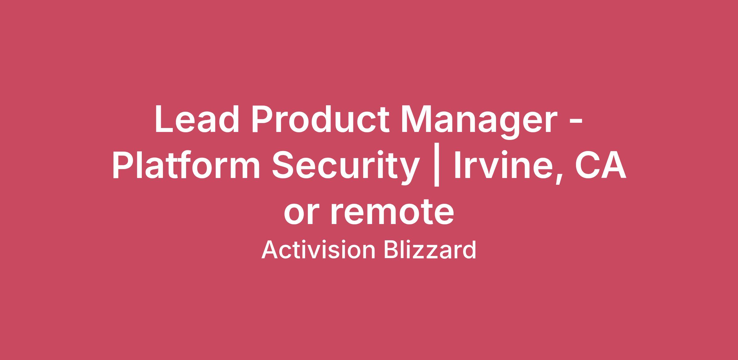 Team Name:Battle.net & Online ProductsJob Title:Lead Product Manager - Platform Security | Irvine, CA or remoteRequisition ID:R026763Job Description:The Platform Security team at Blizzard is seeking a seasoned Lead Product Manager of Platform Security to drive the strategy, execution, and delivery of security initiatives across the Blizzard gaming ecosystem. You will lead product and project managers, align platform security capabilities with business and player‑experience needs, and guide multi‑team execution across engineering, data science, operations, and game teams. The team you’ll lead safeguards our players, creators, and partners by building secure, reliable, and player‑trust–focused platform services, including anti‑fraud, anti‑cheat, account security, application security, and player‑interaction systems. This role requires a rare blend of product leadership, program management discipline, and production sensibility, balancing long‑term strategy with hands‑on coordination across multiple teams to support live games. This role is anticipated to be a hybrid work position, with some on-site and some remote work. The home studio for this role is in Irvine, CA. However, we understand each person’s circumstances may be unique and will work with you to explore other possible options, including remote work arrangements. Responsibilities: Leadership & Strategy Lead and mentor product managers and project managers, driving clarity, collaboration, and performance. Define and evolve the Platform Security product portfolio strategy. Align cross‑functional teams around a unified security vision and player‑trust objectives. Own portfolio prioritization, resource planning, and investment decisions. Communicate strategy, risks, and recommendations to senior leadership. Product Development Drive product requirements, roadmaps, and success metrics grounded in player trust and safety needs. Champion SDLC and product best practices across Platform Security. Balance proactive innovation with rapid iteration for live services. Lead product discovery informed by player/developer research and threat landscape insights. Program & Production Excellence Oversee cross‑functional program execution with clear milestones, risk management, and dependency tracking. Ensure delivery is technically sound, game‑team friendly, and well‑integrated into player experiences. Maintain operational rhythms, including roadmap reviews, communication standards, and delivery frameworks. Serve as an escalation point for cross‑team blockers. Minimum Requirements: 10+ years in product management, program management, or production within games, security, or platform services. Proven leadership in managing product managers and project managers. Strong understanding of SDLC, product development, and program management methodologies. Track record delivering security, trust & safety, or platform features in complex technical ecosystems. Exceptional cross‑functional communication skills. Experience influencing senior leadership and driving multi‑year strategy across multiple teams. Gaming or entertainment industry experience strongly preferred. Bonus Points: Experience working directly with game teams or integrating services into live‑service/multiplayer titles. Experience launching technical products end‑to‑end (discovery → launch → iteration). Familiarity with anti‑cheat, anti‑fraud, threat intelligence, abuse prevention, or trust & safety systems. Knowledge of secure development practices, threat modeling, anti‑tamper, or obfuscation techniques. Technical proficiency (C++, Python, Go, etc.) for effective partnership with engineering. Your Platform Best known for iconic video game universes including Warcraft®, Overwatch®, Diablo®, and StarCraft®, Blizzard Entertainment, Inc. (www.blizzard.com), a division of Activision Blizzard, which was acquired by Microsoft (NASDAQ: MSFT), is a premier developer and publisher of entertainment experiences. Blizzard Entertainment has created some of the industry’s most critically acclaimed and genre-defining games over the last 30 years, with a track record that includes multiple Game of the Year awards. Blizzard Entertainment engages tens of millions of players around the world with titles available on PC via Battle.net®, Xbox, PlayStation, Nintendo Switch, iOS, and Android. Our World Activision Blizzard, Inc., is one of the world's largest and most successful interactive entertainment companies and is at the intersection of media, technology and entertainment. We are home to some of the most beloved entertainment franchises including Call of Duty®, World of Warcraft®, Overwatch®, Diablo®, Candy Crush™ and Bubble Witch™. Our combined entertainment network delights hundreds of millions of monthly active users in 196 countries, making us the largest gaming network on the planet! Our ability to build immersive and innovative worlds is only enhanced by diverse teams working in an inclusive environment. We aspire to have a culture where everyone can thrive in order to connect and engage the world through epic entertainment. We provide a suite of benefits that promote physical, emotional and financial well-being for ‘Every World’ - we’ve got our employees covered! The videogame industry and therefore our business is fast-paced and will continue to evolve. As such, the duties and responsibilities of this role may be changed as directed by the Company at any time to promote and support our business and relationships with industry partners. We love hearing from anyone who is enthusiastic about changing the games industry. Not sure you meet all qualifications? Let us decide! Research shows that women and members of other under-represented groups tend to not apply to jobs when they think they may not meet every qualification, when, in fact, they often do! We are committed to creating a diverse and inclusive environment and strongly enc