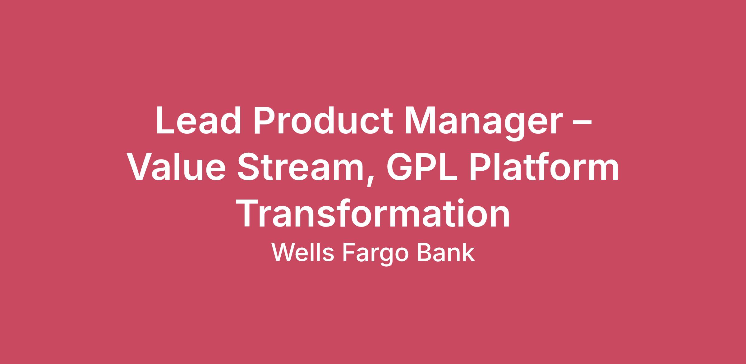 About this role: Wells Fargo is seeking a Lead Product Manager to support the Platform Transformation Value Stream team, driving strategic execution and product enablement across the Global Payments & Liquidity, Product & Platform organization. This team is focused on expanding core payments products, enhancing pricing discipline for deposits and fees, and modernizing payments platforms and architecture to build robust payment ecosystems.This role supports end‑to‑end value delivery across a defined Payments value stream by translating enterprise transformation objectives into coordinated execution and measurable outcomes. The Payments Value Stream role focuses on managing the flow of work from intake through delivery, ensuring priorities, dependencies, and delivery milestones are aligned across Product, Technology, Operations, Risk, and Delivery teams. The role operates within a complex, matrixed environment and works closely with value stream and delivery leadership to surface risks, manage dependencies, and maintain momentum against strategic objectives. Success requires strong execution discipline, systems thinking, and the ability to navigate ambiguity while driving consistent delivery outcomes.In this role, you will:Support end‑to‑end value delivery across a Payments value stream, contributing to planning, prioritization, sequencing, dependency management, and delivery tracking.Translate enterprise and business priorities into actionable value stream plans, aligning initiatives, releases, and workstreams to strategic objectives.Monitor value stream flow and delivery health, identifying bottlenecks, risks, and constraints and partnering with stakeholders to drive resolution.Coordinate cross‑functional execution across Product, Technology, Operations, Risk, and external partners to support integrated, end‑to‑end delivery.Participate in value stream–level planning and delivery forums (e.g., PI planning, release planning, execution reviews) to support alignment, readiness, and accountability.Communicate delivery status, risks, and dependencies clearly to stakeholders and leadership, translating complex execution dynamics into actionable insights.Track and manage dependencies and execution risks, escalating issues and supporting trade‑off decisions as needed.Contribute to continuous improvement of delivery practices, identifying opportunities to enhance planning, governance, processes, and ways of working.Required Qualifications:5+ years of Product Management, product owner, strategic planning, process management, change delivery experience, or equivalent demonstrated through one or a combination of the following: work experience, training, military experience, educationDesired Qualifications:Experience supporting payments transformation initiatives within large, complex organizations.Strong understanding of end‑to‑end payments lifecycles, platforms, and messaging flows.Proven ability to manage priorities and dependencies across multiple teams or workstreams.Experience supporting large‑scale transformation or migration programs.Familiarity with payment rails and messaging platforms such as ACH, FedNow, CHIPS, SWIFT, MT‑to‑MX, and ISO 20022.Excellent written and verbal communication skills, including PowerPoint development and executive‑ready storytelling.Strong organizational and prioritization skills with attention to detail.Ability to synthesize complex inputs from diverse stakeholders into clear actions and recommendations.Customer‑centric, outcome‑focused mindset with the ability to work independently, manage ambiguity, and meet delivery commitments.Job Expectations:This position offers a hybrid work scheduleThis position is not eligible for Visa SponsorshipSpecific compliance policies may apply regarding outside activities and/or personal investing; affected employees will be expected to provide information to the Wells Fargo Personal Account Dealing Team and abide by applicable policy requirements if hired. Information will be shared about expectations during the recruitment process.Pay Range Reflected is the base pay range offered for this position. Pay may vary depending on factors including but not limited to demonstrated examples of prior performance, skills, experience, or work location. Employees may also be eligible for incentive opportunities.$119,000.00 - $224,000.00Benefits Wells Fargo provides eligible employees with a comprehensive set of benefits, many of which are listed below. Visit Benefits - Wells Fargo Jobs for an overview of the following benefit plans and programs offered to employees.Health benefits401(k) PlanPaid time offDisability benefitsLife insurance, critical illness insurance, and accident insuranceParental leaveCritical caregiving leaveDiscounts and savingsCommuter benefitsTuition reimbursementScholarships for dependent childrenAdoption reimbursementPosting End Date:9 Apr 2026*Job posting may come down early due to volume of applicants.We Value Equal OpportunityWells Fargo is an equal opportunity employer. All qualified applicants will receive consideration for employment without regard to race, color, religion, sex, sexual orientation, gender identity, national origin, disability, status as a protected veteran, or any other legally protected characteristic.Employees support our focus on building strong customer relationships balanced with a strong risk mitigating and compliance-driven culture which firmly establishes those disciplines as critical to the success of our customers and company. They are accountable for execution of all applicable risk programs (Credit, Market, Financial Crimes, Operational, Regulatory Compliance), which includes effectively following and adhering to applicable Wells Fargo policies and procedures, appropriately fulfilling risk and compliance obligations, timely and effective escalation and remediation of issues, and making sound risk decisions. There is emphasis on proactive monitoring, gov