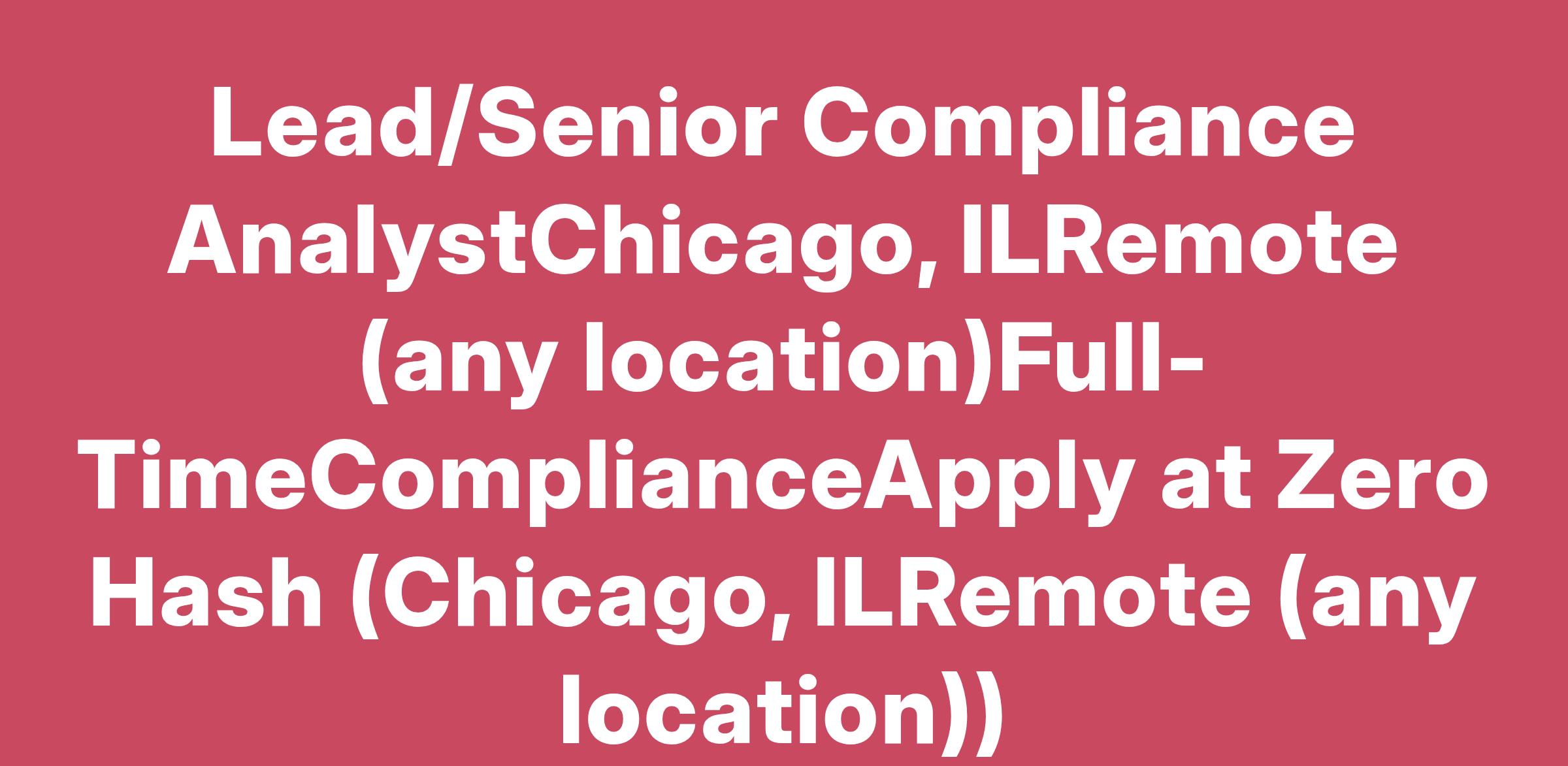 Lead/Senior Compliance AnalystChicago, ILRemote (any location)Full-TimeComplianceApply at Zero Hash (Chicago, ILRemote (any location))