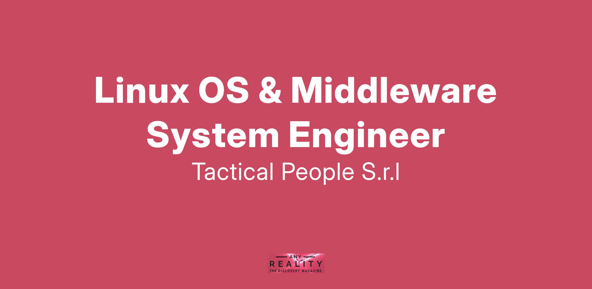 Unisciti a TACTICAL PEOPLE: Innovazione, Persone e Crescita nel Cuore della Digital Transformation Da oltre 20 anni, TACTICAL PEOPLE si posiziona come leader nel mercato ICT, guidando con passione e competenza i nostri clienti di medie e grandi dimensioni attraverso il dinamico percorso della digital transformation. La nostra mission è chiara: non solo abbracciare il cambiamento tecnologico, ma guidarlo, creando soluzioni all'avanguardia che plasmino il futuro digitale. In TACTICAL PEOPLE, crediamo fortemente nel mettere le persone al centro di ogni nostra iniziativa. Le persone sono il cuore pulsante della nostra azienda; il loro benessere, la loro crescita e il loro sviluppo sono la nostra priorità. Ci impegniamo a condividere le strategie aziendali con trasparenza e a fornire formazione e supporto a ogni livello, garantendo che ogni membro del team sia equipaggiato per eccellere e innovare. Stiamo cercando individui che condividano la nostra visione, che siano guidati dalla passione per la tecnologia e che desiderino essere protagonisti nella costruzione di un futuro digitale più luminoso. Se sei pronto a far parte di una squadra che valorizza il talento, incoraggia la crescita personale e professionale e lavora in prima linea nel settore della digital transformation, TACTICAL PEOPLE è il posto giusto per te. Posizione Aperta: Linux OS & Middleware System Engineer Sede: Remoto Descrizione del ruolo: Il candidato ideale deve avere almeno 3 anni di esperienza in ruoli simili. Cosa offriamo: Inserimento immediato in una Tech Community giovane e dinamica. TACTICAL LEARNING HUB, con corsi di aggiornamento e formazione. Il presente annuncio è rivolto ad entrambi i sessi, ai sensi delle leggi 903/77 e 125/91, e a persone di tutte le età e tutte le nazionalità, ai sensi dei decreti legislativi 215/03 e 216/03. I curricula dovranno pervenire completi di dicitura che autorizza il trattamento dei propri dati: “Si autorizza al trattamento dei dati personali ai sensi del D. Lgs. 196/2003.