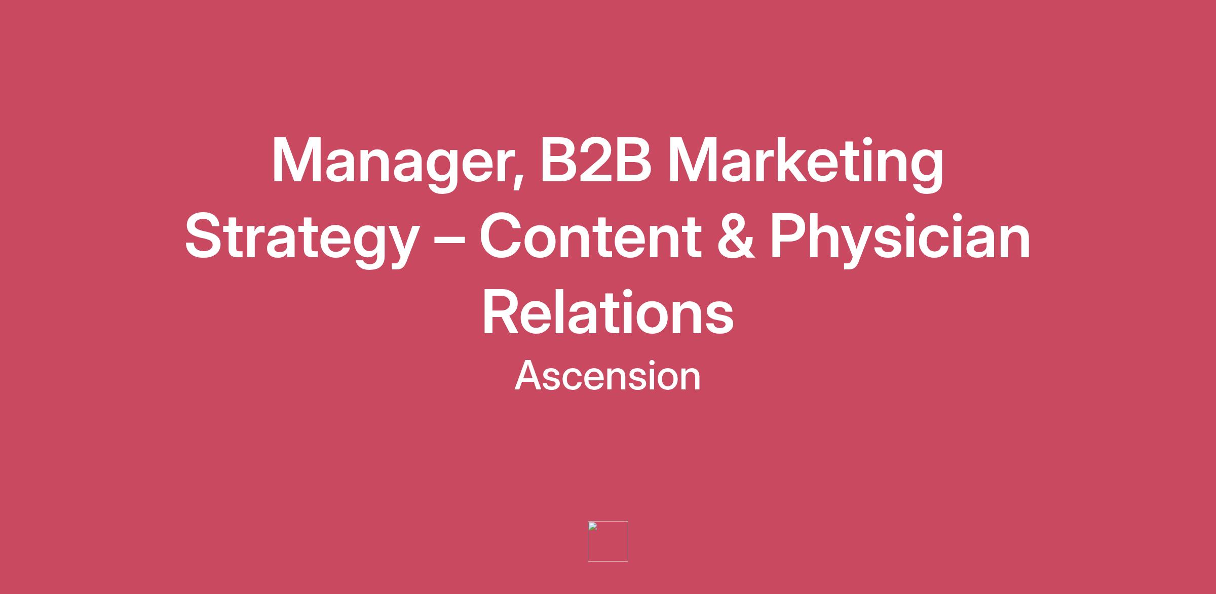 Details Department: Marketing, Strategy & Account ServicesSchedule: Full timeLocation: RemoteSalary: $110,240.00 - $153,668.00 per yearEligible for an annual bonus incentive Benefits Paid time off (PTO)Various health insurance options & wellness plansRetirement benefits including employer match plansLong-term & short-term disabilityEmployee assistance programs (EAP)Parental leave & adoption assistanceTuition reimbursementWays to give back to your community Benefit options and eligibility vary by position. Compensation varies based on factors including, but not limited to, experience, skills, education, performance, location and salary range at the time of the offer.Responsibilities The Manager of B2B Marketing Strategy (Content & Physician Relations) is responsible for developing content and messaging strategies that drive business growth. The role focuses on creating high-impact marketing materials and enablement tools for key stakeholders, including referring providers, employer partners and business development teams. The Manager partners closely with Physician Relations and Business Development to manage intake, planning and execution of marketing requests, ultimately supporting referral growth and strategic business priorities. Key Responsibilities:Content & Messaging StrategyDevelop and maintain strategic B2B messaging frameworks and value propositions tailored for referring physicians, employers and strategic partners. Spearhead the creation of high-impact content, materials and marketing campaigns that clearly articulate value and drive engagement across B2B audiences.Translate complex clinical and operational concepts into clear, compelling and actionable communications.Stakeholder Enablement & SupportServe as the primary liaison for intake, prioritization and strategic planning of marketing requests from Physician Relations and Business Development teams.Develop and manage relationship manager enablement tools (e.g. presentations, talking points, data sheets, collaterals) to support referral-focused marketing strategies and key business priorities.Collaborate directly with Physician Relationship Managers on materials for outreach, targeted events and strategic relationship-building efforts.Campaign Execution & PerformanceLead the execution of targeted B2B campaigns across relevant traditional and digital channels (omni-channel approach).Oversee the management of creative routing, revisions and coordination with internal Creative Services to ensure timely, compliant delivery.Monitor, analyze and report on campaign performance metrics to inform future strategy and optimize ROI.Cross-Functional CollaborationEnsure cohesive execution by collaborating closely with Creative Services, CRM, Digital, and service line marketing teams.Partner specifically with the Manager, B2B Marketing Strategy (Design, Digital & EMS) to pair strategic content with effective creative and digital delivery elements. Requirements Education:High School diploma equivalency with 3 years of cumulative experience OR Associate's degree/Bachelor's degree with 2 years of cumulative experience OR 7 years of applicable cumulative job specific experience required.3 years of leadership or management experience preferred.Additional Preferences Education: Bachelor’s degree in Marketing, Communications, Business, Healthcare Administration, or a related field.Experience: Minimum of 5 years of progressive experience in healthcare marketing, B2B marketing, business development, physician relations, or employer engagement/solutions. Communication and Content: Exceptional written and verbal communication skills with proven experience developing high-quality, professional content and messaging for physician audiences.Execution Skills: Demonstrated proficiency in marketing campaign and project management, with a track record of translating complex information into clear, compelling and actionable materials.Organizational Acumen: Proven ability to operate effectively and independently within highly-matrixed organizations and remote work environments. #GMDx #LI-RemoteWhy Join Our Team Ascension associates are key to our commitment of transforming healthcare and providing care to all, especially those most in need. Join us and help us drive impact through reimagining how we can deliver a people-centered healthcare experience and creating the solutions to do it. Explore career opportunities across our ministry locations and within our corporate headquarters. Ascension is a leading non-profit, faith-based national health system made up of over 134,000 associates and 2,600 sites of care, including more than 140 hospitals and 40 senior living communities in 19 states. Our Mission, Vision and Values encompass everything we do at Ascension. Every associate is empowered to give back, volunteer and make a positive impact in their community. Ascension careers are more than jobs; they are opportunities to enhance your life and the lives of the people around you.Equal Employment Opportunity Employer Ascension provides Equal Employment Opportunities (EEO) to all associates and applicants for employment without regard to race, color, religion, sex/gender, sexual orientation, gender identity or expression, pregnancy, childbirth, and related medical conditions, lactation, breastfeeding, national origin, citizenship, age, disability, genetic information, veteran status, marital status, all as defined by applicable law, and any other legally protected status or characteristic in accordance with applicable federal, state and local laws.For further information, view the EEO Know Your Rights (English) poster or EEO Know Your Rights (Spanish) poster.As a military friendly organization, Ascension promotes career flexibility and offers many benefits to help support the well-being of our military families, spouses, veterans and reservists. Our associates are empowered to apply their military experience and unique perspective to their civilian career wit