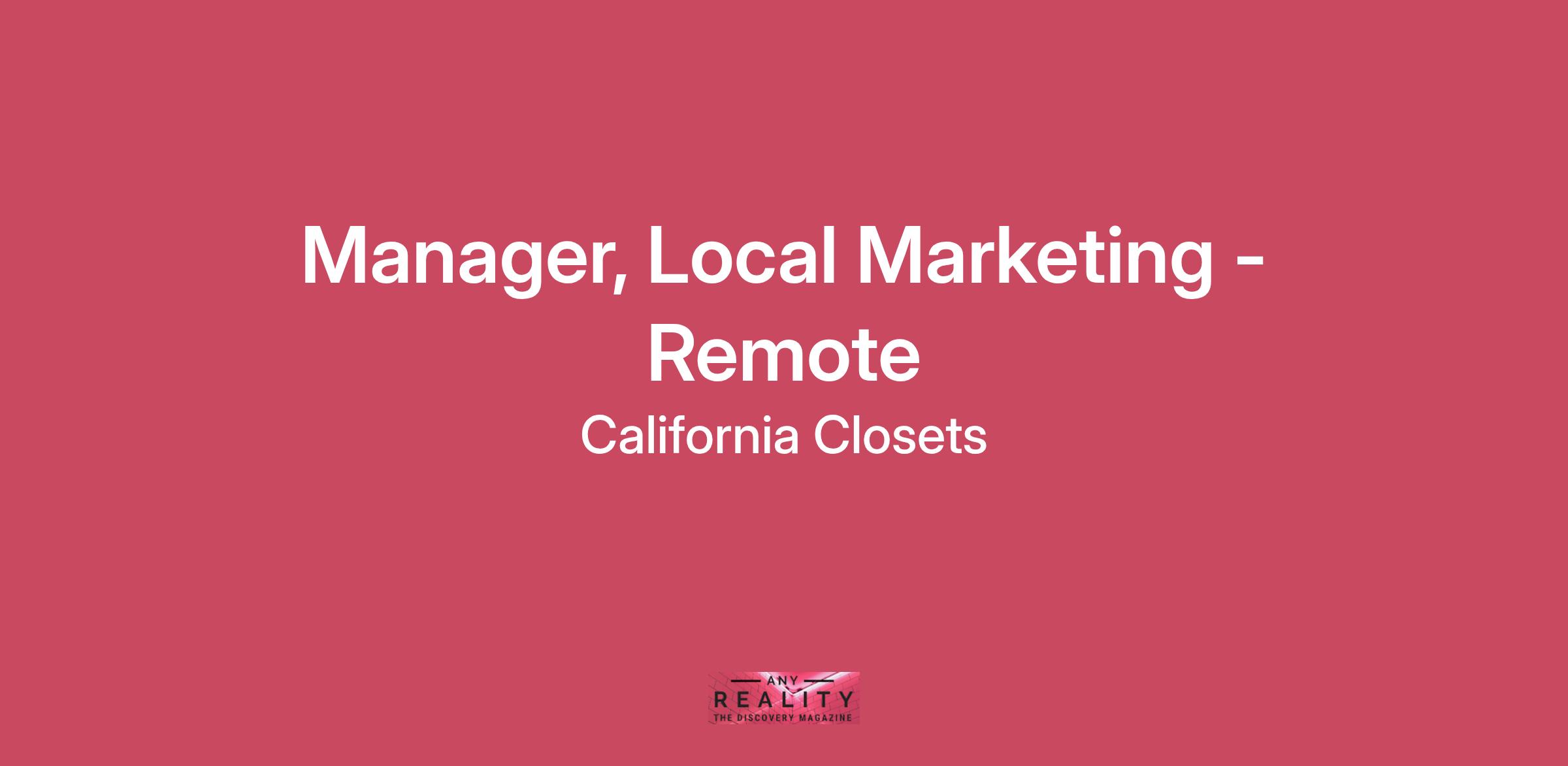 Company DescriptionFounded in 1978, California Closets has built a reputation as the leader and design authority in premium space management, delivering custom-designed organizational solutions and exceptional service. We believe home is more than just a place — it should be a source of creativity, comfort, and connection. From beautiful walk-in closets and entertainment centers to versatile pantries and home offices, we design custom storage solutions that add value to your life and home by making space for what belongs. Think of it as ‘practical magic.’ Job DescriptionThis role partners with the National Marketing Director in supporting operators to achieve their leads and marketing budget goals. In addition, the Marketing Manager will work closely with internal and external business partners to support the integration between national and local marketing to deliver on our Brand Experience and live the CREDO.ESSENTIAL FUNCTIONS Support National Marketing Director on local marketing activitiesDrive participation and execution of national marketing programs – including promotions, digital programs, direct mail and email campaigns, etc.Develop and maintain relationships with operators, engaging with them to improve their business performance. Potential for direct responsibility for locations. Responsible for the implementation of digital and other marketing campaigns, analyze and report on results and make recommendations to improve the performance of the campaigns. Analyzing social media channels, local web pages, other digital platforms and developing insights to share with operators to improve performance of the platforms. This includes onboarding and training local points of contact.Manage local contact information for website and online listings.Managing the correspondence to clients and operators for customer complaints through Customer CareAnalyze and ensure compliance with local marketing spending guidelines through quarterly audits for franchises.Produce and distribute monthly marketing newsletter.Generate, analyze and distribute reports for marketing campaign results.Qualifications3-5 years of experience in a marketing role focusing on local initiativesWebsite CMS experience, in particular, working with custom field data entry and various page templatesAbility to take out-of-the-box requests and work with business partners to find solutionsAbility to thrive in a fast-paced environmentEffective time management and organizational skillsTech savvy with the ability to quickly learn and apply various business systems (Social Media Platforms, Microsoft Office, etc)Additional InformationFind us on Facebook, YouTube, and InstagramWe are an equal opportunity employer. We E-Verify. All your information will be kept confidential according to EEO guidelines.