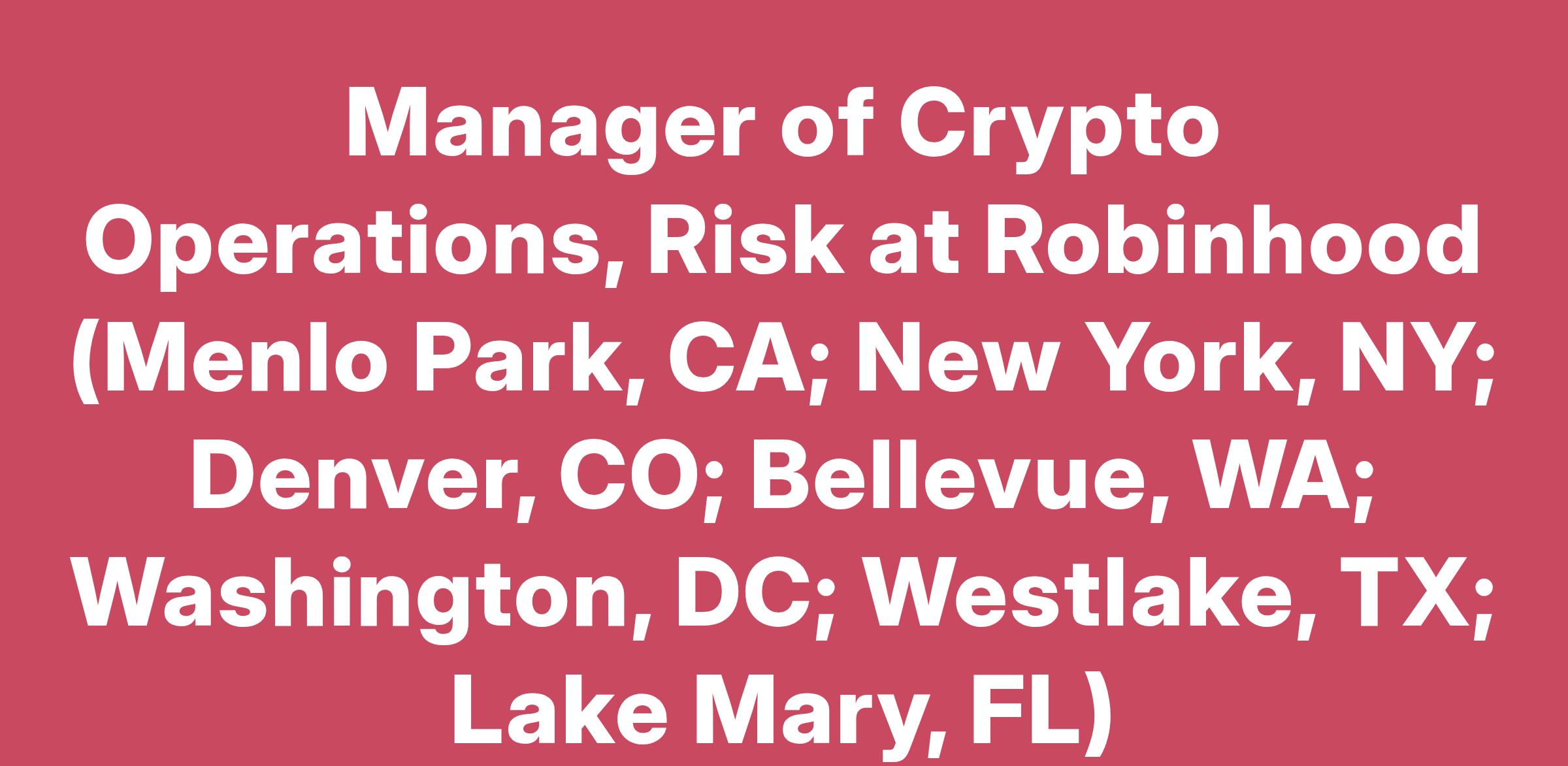 Manager of Crypto Operations, Risk at Robinhood (Menlo Park, CA; New York, NY; Denver, CO; Bellevue, WA; Washington, DC; Westlake, TX; Lake Mary, FL)