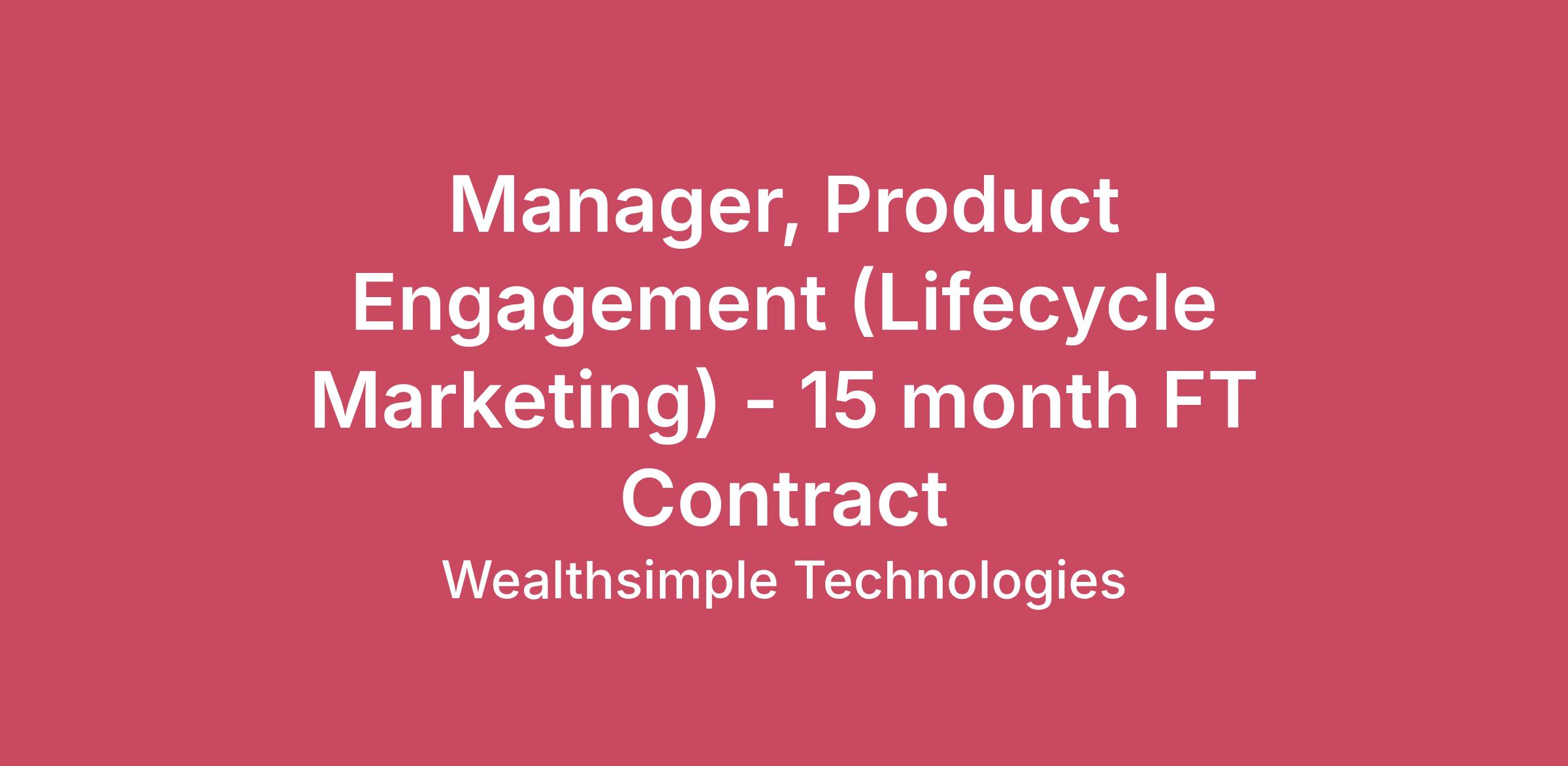 Build something people loveWealthsimple's mission is to help everyone achieve financial freedom – by making financial services simple, transparent, and low-cost. We're Canada's largest fintech, trusted by over 3 million clients with more than $100 billion in assets. We move fast, we own our work, and we care deeply about the people using our products. If that sounds like you, keep reading.We're proud of what we've built — and we're just getting started. Read our Culture Manual and learn more about how we work.About the Product Engagement (Lifecycle) TeamOur Product Engagement (PE) team's mission is to connect clients to value — ensuring every client discovers, learns, adopts, and grows with our products. We do that through smart, personalized lifecycle communications across email, push, SMS, and in-app, powered by behavioural data, rigorous experimentation, and an increasingly AI-native way of working. We embed deeply with our Product, PMM, Data Science, and Growth partners — we don't just service their requests, we shape their strategies.About the RoleWe're hiring a Manager, Product Engagement to play a critical role in executing and evolving our lifecycle programs during a key period of growth. This is a 15-month fixed-term contract, reporting to the Director, Product Engagement.In this role, you'll own end-to-end lifecycle strategy and campaign execution across our Self-directed Investing and Crypto domain, with a strong focus on driving cross-sell growth and product adoption. You'll serve as the lifecycle SME for your assigned area — embedding with product partners, managing a specialist, and bringing a data-driven, client-first perspective to everything you ship.The ideal candidate is both strategic and hands-on: someone who can identify high-impact opportunities, build a compelling business case, and see it through to execution and measurement — without waiting to be asked.In this role, you'll have the opportunity to:Own lifecycle strategy and execution for Self-directed Investing and Active Traders — serve as the dedicated SME for multiple key product areas, steward campaign performance end-to-end, and develop quarterly lifecycle strategies aligned to business objectives, product roadmaps, and cross-sell goals.Drive cross-sell and product adoption — independently identify high-intent behavioral signals, develop audience definitions using segmentation and propensity data, and ideate and experiment on tactics (promotions, triggers, journeys) that move clients to their next product.Manage and develop a Lifecycle Specialist — set clear expectations, provide direct and timely coaching on fundamentals and analytical skills, create stretch assignments, and address performance gaps proactively rather than avoiding them.Lead rigorous, incrementality-focused experimentation — design clean A/B tests with clear hypotheses, incremental success metrics, success metrics, and control groups; analyze results independently; translate results into clear business impact; share learnings cross-functionally; and advocate for killing underperforming programs and reinvesting that frequency budget elsewhere.Improve and evolve lifecycle infrastructure — design scalable, evergreen programs and partners to enhance instrumentation, automation, and personalization capabilities that unlock long-term growth.Embed with your product partners — join product team rituals, contribute a lifecycle perspective to planning and prioritization conversations, and raise lifecycle implications of product decisions before they become problems — not after.Work in an AI-native way — actively apply AI tools across the full campaign lifecycle (briefs, copy, segmentation logic, QA, reporting summaries), identify where AI reduces manual effort or improves quality in recurring workflows; comfort with MCP-connected tooling and AI-assisted workflows is an asset.What you'll bring:5+ years of experience in lifecycle marketing or marketing automation, with demonstrated ability to independently lead strategic initiatives from brief to measurement; supervisory experience requiredHands-on experience in Braze or an equivalent enterprise ESP/marketing automation platform; strong command of segmentation, dynamic content, multi-channel journey orchestration, and A/B testingSolid analytical skills — comfortable pulling and interpreting campaign performance data, sizing audiences, and structuring experiment results into clear, actionable recommendations for stakeholdersProven cross-functional collaboration skills — you earn trust with Product, PMM, and Data partners by showing up prepared, communicating proactively, and bringing lifecycle insight to the table earlyComfortable in a high-velocity environment, balancing multiple concurrent campaigns, product launches, and experiments across channels — prioritizing ruthlessly, adapting quickly when timelines or requirements shift, and maintaining execution quality under pressure.Demonstrated AI fluency in a marketing context — you regularly use AI tools to accelerate your work, apply good judgment about when and how to use them, and you take accountability for the output; experience with AI-assisted workflows (briefs, QA, reporting, segmentation) is a strong plus*For this specific role, passion/ knowledge or experience as an active trader is encouraged.Why Wealthsimple? Top-tier health benefits and life insurance Long-term group savings with employer match, through Wealthsimple for Business 20 vacation days, 4 wellness days, and unlimited sick and mental health days per year✈ 90 days away: work outside Canada for up to 90 days per year Employee resource groups, including Rainbow (2SLGBTQ), Women of WS, and Black at WS We are a hybrid team with over 1,500 employees across North America. The people are one of the best parts of working here: you'll collaborate with incredibly talented, curious, and driven teammates who are deeply committed to doing great work.ICYMITe