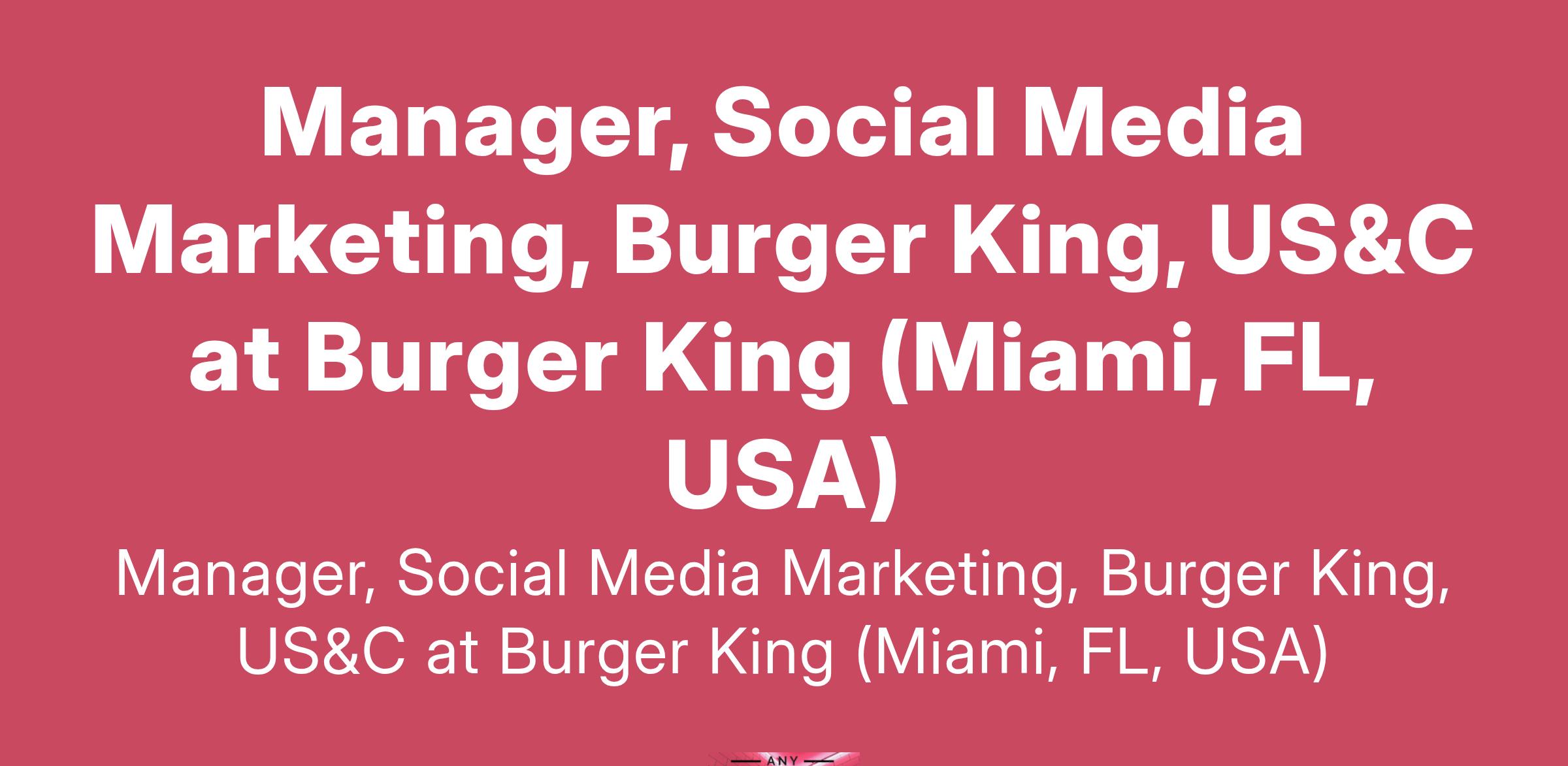 Manager, Social Media Marketing, Burger King, US&C at Burger King (Miami, FL, USA)