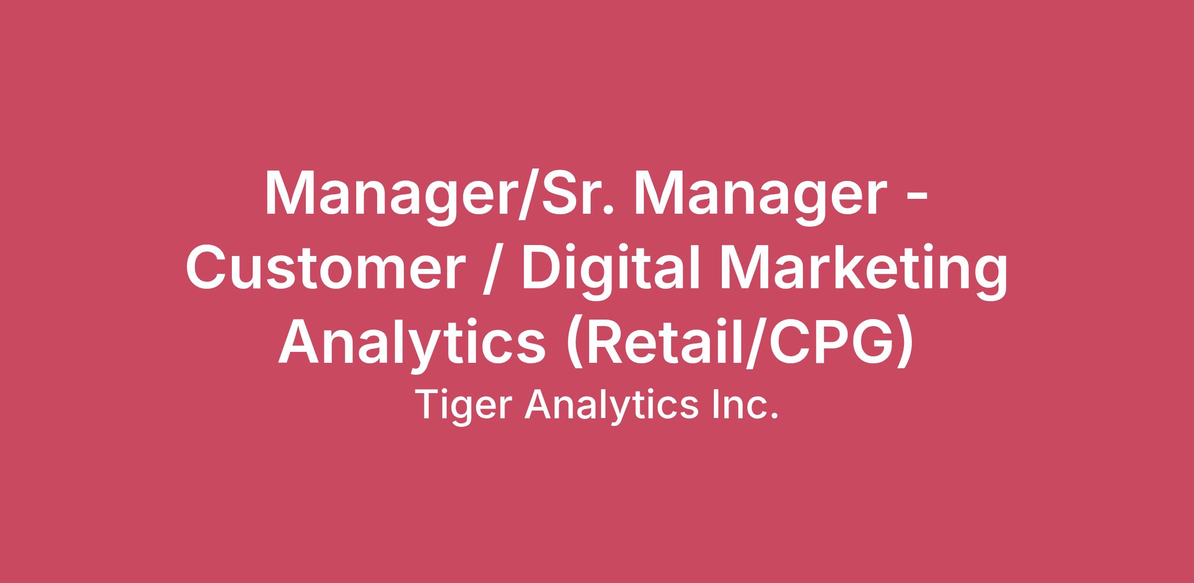 Tiger Analytics is an advanced analytics consulting firm. We are the trusted analytics partner for several Fortune 100 companies, enabling them to generate business value from data. Our consultants bring deep expertise in Data Science, Machine Learning, and AI. Various market research firms, including Forrester and Gartner, have recognized our business value and leadership. The ideal candidate will combine analytical rigor with strong storytelling skills to drive decision-making across marketing, customer, and retail functions.Key ResponsibilitiesPerform deep-dive analysis on digital/web and business data to generate actionable insights Deliver quick turnaround analysis to support fast-paced business decision-making Analyze customer behavior, campaign performance, and retail trends to identify growth opportunities Drive use cases across Retail, Marketing, and Customer Analytics Translate complex data into clear, compelling narratives and executive-ready presentations Partner with cross-functional teams including Marketing, Product, and Business stakeholders Design, develop, and track KPIs, dashboards, and performance metrics Support Marketing in campaign planning, A/B testing, and performance measurementIdentify trends, patterns, and anomalies in large datasets to support strategic decisions Ensure data accuracy, consistency, and robust quality checks across all analysesBuild strong relationships with Marketing leadership, including the CMO, to understand business goals, gaps, and customer strategy Align data and analytics initiatives with the overall marketing vision and roadmap Define and drive the analytics development roadmap in collaboration with technical teams 8–14 years of experience in Business/Digital Analytics, with a strong focus on Customer & Marketing Analytics within the Retail (Grocery preferred) domain Strong expertise in Retail, Digital Marketing, Campaign Design, and Marketing Performance Measurement, including exposure to AI/ML-driven campaigns Robust techno-functional skillset with experience in digital transformation and strategy consulting Strong proficiency in SQL, along with experience in data visualisation tools such as Power BI or Tableau Familiarity with web analytics tools (e.g., Google Analytics) and working knowledge of Python or R Proven ability to analyse large, complex datasets, generate insights, and translate them into actionable business recommendations Exceptional storytelling and communication skills, with the ability to present insights to senior and non-technical stakeholders Strong problem-solving skills with the ability to navigate ambiguity and work in fast-paced, quick turnaround environments Demonstrated ability to collaborate cross-functionally, manage multiple priorities, and influence stakeholders with strong executive presence Significant career development opportunities exist as the company grows. The position offers a unique opportunity to be part of a small, fast-growing, challenging and entrepreneurial environment, with a high degree of individual responsibility.Tiger Analytics provides equal employment opportunities to applicants and employees without regard to race, color, religion, age, sex, sexual orientation, gender identity/expression, pregnancy, national origin, ancestry, marital status, protected veteran status, disability status, or any other basis as protected by federal, state, or local law.