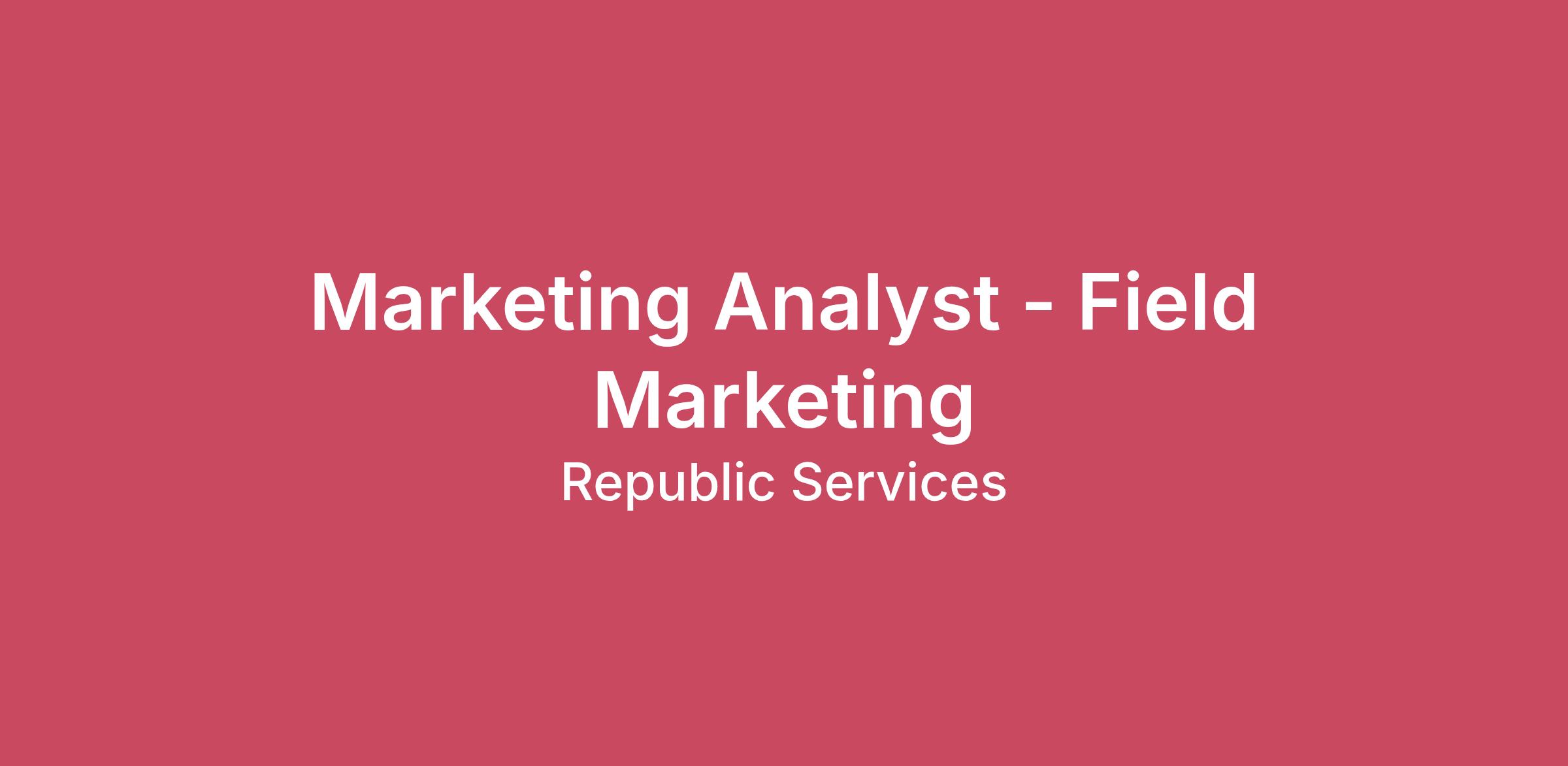 POSITION SUMMARY: The Marketing Analyst - Field Marketing is responsible for supporting the development and execution of field marketing plans and activities for the Republic Services marketing team. Working closely with senior marketing leaders, the position is a project-driven role that focuses on managing incoming print, digital and broadcast marketing and advertising requests from field leaders; coordinating field market-specific marketing campaigns; and supporting special projects such as field-driven conferences and trade shows and field customer events, all to drive customer acquisition and retention. The Marketing Analyst - Field Marketing also works costly with the operations Area leadership teams to execute customer growth and retention strategies.PRINCIPAL RESPONSIBLITIES:Partner with internal and external stakeholders to develop and execute field marketing and advertising materials. This position will serve as the hub for field print and digital marketing project development.Coordinate the execution and measurement of tactical field marketing plans, including acquisition customer communications, leveraging external vendors and resources and internal functional teams and workstreams to deliver results.Liaise with creative teams develop branding ideas, graphic designs, promotional materials and advertising content.Develop and maintain a playbook of field marketing campaign best practices.Provide support with special projects such as field-driven conferences and trade shows and field customer events.Conduct market research, when needed.Perform other job-related duties as assigned or apparent. QUALIFICATIONS:Experience working with ad agencies, working in account or project management or planning. Business to business marketing experience. Experience managing creative projects and marketing campaigns.Good communication and interpersonal skillsAttention to detail for precise analysis of dataCritical thinking and problem-solving skillsStrong collaboration skillsMINIMUM REQUIREMENTS:Minimum of 4 years of business marketing experience.Rewarding Compensation and BenefitsEligible employees can elect to participate in:• Comprehensive medical benefits coverage, dental plans and vision coverage.• Health care and dependent care spending accounts. • Short- and long-term disability.• Life insurance and accidental death & dismemberment insurance.• Employee and Family Assistance Program (EAP).• Employee discount programs.• Retirement plan with a generous company match.• Employee Stock Purchase Plan (ESPP).• Paid Time Off (PTO)• Benefits https://jobs.republicservices.com/us/en/about-us/benefits• Washington PTO: https://www.republicservices.com/sites/default/files/legacy_documents/Washington-PTO-Table.pdfThe statements used herein are intended to describe the general nature and level of the work being performed by an employee in this position, and are not intended to be construed as an exhaustive list of responsibilities, duties and skills required by an incumbent so classified. Furthermore, they do not establish a contract for employment and are subject to change at the discretion of the Company.EEO STATEMENT:Republic Services is an equal opportunity employer. All qualified applicants will receive consideration for employment without regard to race, color, religion, gender, sexual orientation, gender identity or expression, national origin, age, disability, protected veteran status, relationship or association with a protected veteran (spouses or other family members), genetic information, or any other characteristic protected by applicable law.ABOUT THE COMPANYRepublic Services, Inc. (NYSE: RSG) is a leader in the environmental services industry. We provide customers with the most complete set of products and services, including recycling, waste, special waste, hazardous waste and field services. Our industry-leading commitments to advance circularity and support decarbonization are helping deliver on our vision to partner with customers to create a more sustainable world.In 2023, Republic’s total company revenue was $14.9 billion, and adjusted EBITDA was $4.4 billion. We serve 13 million customers and operate more than 1,000 locations, including collection and transfer stations, recycling and polymer centers, treatment facilities, and landfills.Although we operate across North America, the collection, recycling, treatment, or disposal of materials is a local business, and the dynamics and opportunities differ in each market we serve. By combining local operational management with standardized business practices, we drive greater operating efficiencies across the company while maintaining day-to-day operational decisions at the local level, closest to the customer.Our customers, including small businesses, major corporations and municipalities, want a partner with the expertise and capabilities to effectively manage their multiple recycling and waste streams. They choose Republic Services because we are committed to exceeding their expectations and helping them achieve their sustainability goals. Our 41,000 team members understand that it's not just what we do that matters, but how we do it.Our company values guide our daily actions:Safe: We protect the livelihoods of our colleagues and communities.Committed to Serve: We go above and beyond to exceed our customers’ expectations.Environmentally Responsible: We take action to improve our environment.Driven: We deliver results in the right way.Human-Centered: We respect the dignity and unique potential of every person.We are proud of our high employee engagement score of 86. We have an inclusive and diverse culture where every voice counts. In addition, our team positively impacted 4.6 million people in 2023 through the Republic Services Charitable Foundation and local community grants. These projects are designed to meet the specific needs of the communities we serve, with a focus on building sustainable neighborhoods. 