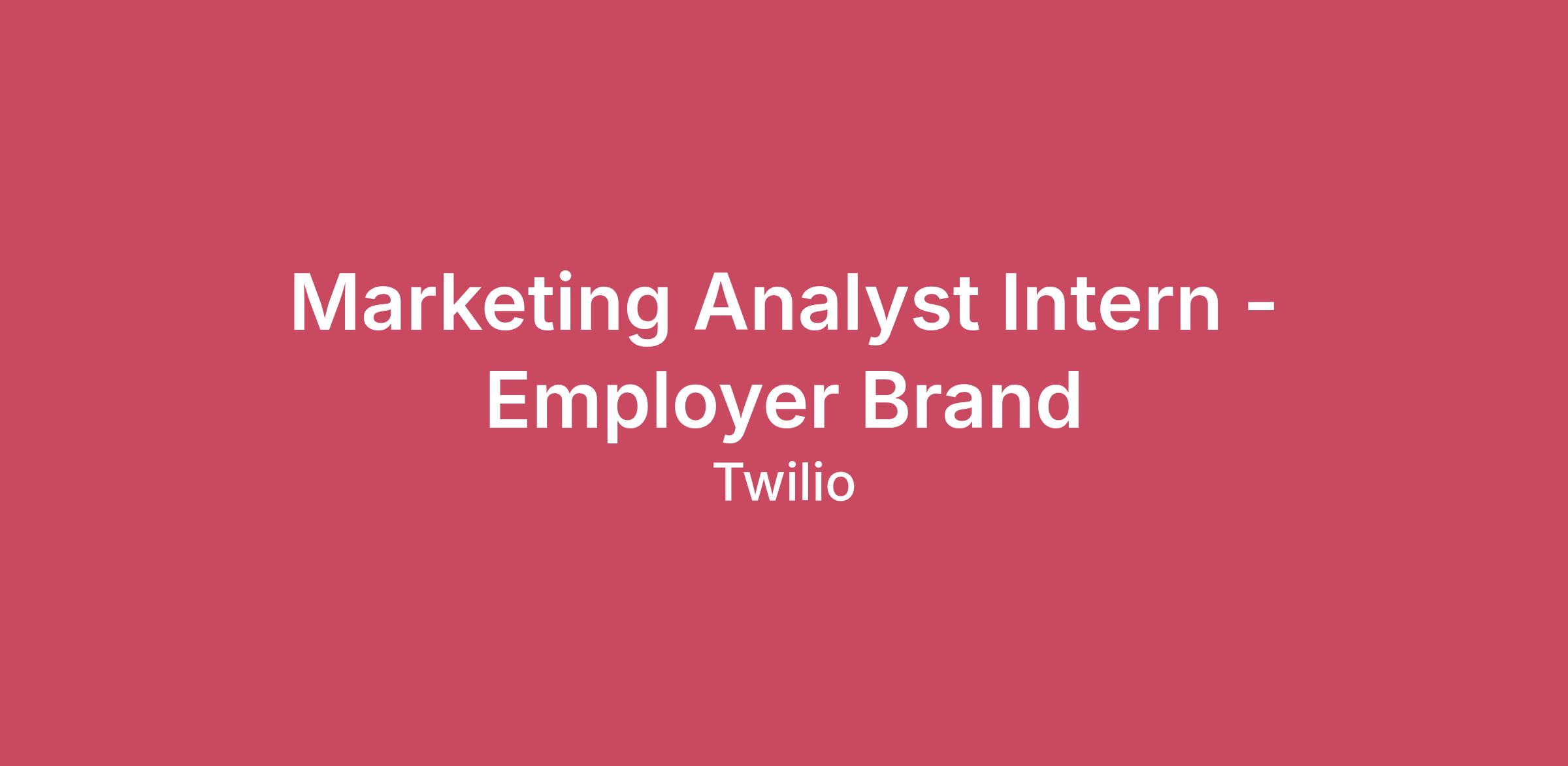 Who we are At Twilio, we’re shaping the future of communications, all from the comfort of our homes. We deliver innovative solutions to hundreds of thousands of businesses and empower millions of developers worldwide to craft personalized customer experiences. Our dedication to remote-first work, and strong culture of connection and global inclusion means that no matter your location, you’re part of a vibrant team with diverse experiences making a global impact each day. As we continue to revolutionize how the world interacts, we’re acquiring new skills and experiences that make work feel truly rewarding. Your career at Twilio is in your hands.We use Artificial Intelligence (AI) to help make our hiring process efficient, fair, and transparent, but automation never makes the final call. Every hiring decision is made by real Twilions, ensuring a human touch at every step. .See yourself at Twilio Join the team as Twilio’s next Marketing Analyst Intern, Employer Brand! About the job Employer Brand sits at the intersection of marketing, storytelling, and talent strategy. Our mission is simple: help the right people discover Twilio, understand our culture, and imagine themselves building here. But powerful stories need proof. That’s where you come in. You’ll transform data into direction. Tracking performance across channels, identifying what resonates most with candidates, and building the reporting foundation that shapes our strategy. You won’t just observe the work, you’ll help define how we measure success across the entire function. If you’re excited by analytics, love organizing chaos into clarity, and want your work to influence real business decisions, you will be a great fit for this role. Responsibilities In this role, you’ll gain experience in: Channel Assessment Evaluate the data generated from each channel and define a structured methodology for data collection. Define and document Employer Brand metrics and data sources Metrics & Tracking Infrastructure Build and maintain a sustainable tracking system (ie Airtable, Excel) Build leadership-ready outputs that can be reused in EB and TA forums Ensure data consistency and reporting hygiene Measurement & Analysis Establish a baseline view of Employer Brand performance across priority channels Track awareness, engagement, and behavior signals and roll up insights Identify top-performing channels, formats, and content themes Analyze trends and directional performance Partner with Employer Brand and TA team members to validate insights Cross-Team Support Act as an ambassador of the Twilio intern program and support intern community engagement. Support employer brand operations across projects as needed. Qualifications Twilio values diverse experiences from all kinds of industries, and we encourage everyone who meets the required qualifications to apply. If your career is just starting or hasn't followed a traditional path, don't let that stop you from considering Twilio. We are always looking for people who will bring something new to the table! Required Currently pursuing or recently completed a degree in Data Analytics, Marketing or a related field Strong analytical and organizational skills with attention to detail Comfortable collecting and manipulating with data in spreadsheets (Excel, Google Sheets) Ability to synthesize data into clear, concise insights Strong written communication skills Self-starter who can manage weekly project tracking and deadlines independently Ability to build presentation materials (Google Slides, Canva) Desired Familiarity with Google Analytics, or similar platforms Interest in Employer Brand, Recruitment Marketing, or Talent Analytics Experience with Airtable or dashboard-style tracking tools Location This role will be remote, but is not eligible to be hired in CA, CT, NJ, NY, PA, or WA. What We Offer There are many benefits to working at Twilio, including, in addition to competitive pay, things like generous time-off, ample parental and wellness leave, healthcare, a retirement savings program, and much more. Offerings vary by location. Compensation *Please note the salary range information provided applies only to candidates residing in California, Colorado, Hawaii, Illinois, Maryland, Massachusetts, Minnesota, New Jersey, New York, Vermont, Washington D.C., and Washington State due to local requirements. Compensation for candidates in other locations will be discussed during the hiring process. Please note that hiring for this role is not restricted to the locations listed above. The estimated pay ranges for this role are as follows: Based in Colorado, Hawaii, Illinois, Maryland, Massachusetts, Minnesota, Vermont, or Washington D.C.: $24.00/hourly Based in New York, New Jersey, Washington State, or California (outside of the San Francisco Bay area): $26.00/hourly Based in the San Francisco Bay area, California: $29.00/hourly The successful candidate’s starting salary will be determined based on permissible, non-discriminatory factors such as skills, experience, and geographic location within the state. Applications for the role will be accepted on an ongoing basis. Twilio thinks big. Do you? We like to solve problems, take initiative, pitch in when needed, and are always up for trying new things. That's why we seek out colleagues who embody our values — something we call Twilio Magic. Additionally, we empower employees to build positive change in their communities by supporting their volunteering and donation efforts. So, if you're ready to unleash your full potential, do your best work, and be the best version of yourself, apply now! If this role isn't what you're looking for, please consider other open positions. Twilio is proud to be an equal opportunity employer. We do not discriminate based upon race, religion, color, national origin, sex (including pregnancy, childbirth, reproductive health decisions, or related medical conditions), sexual orientation, gender identity, gen