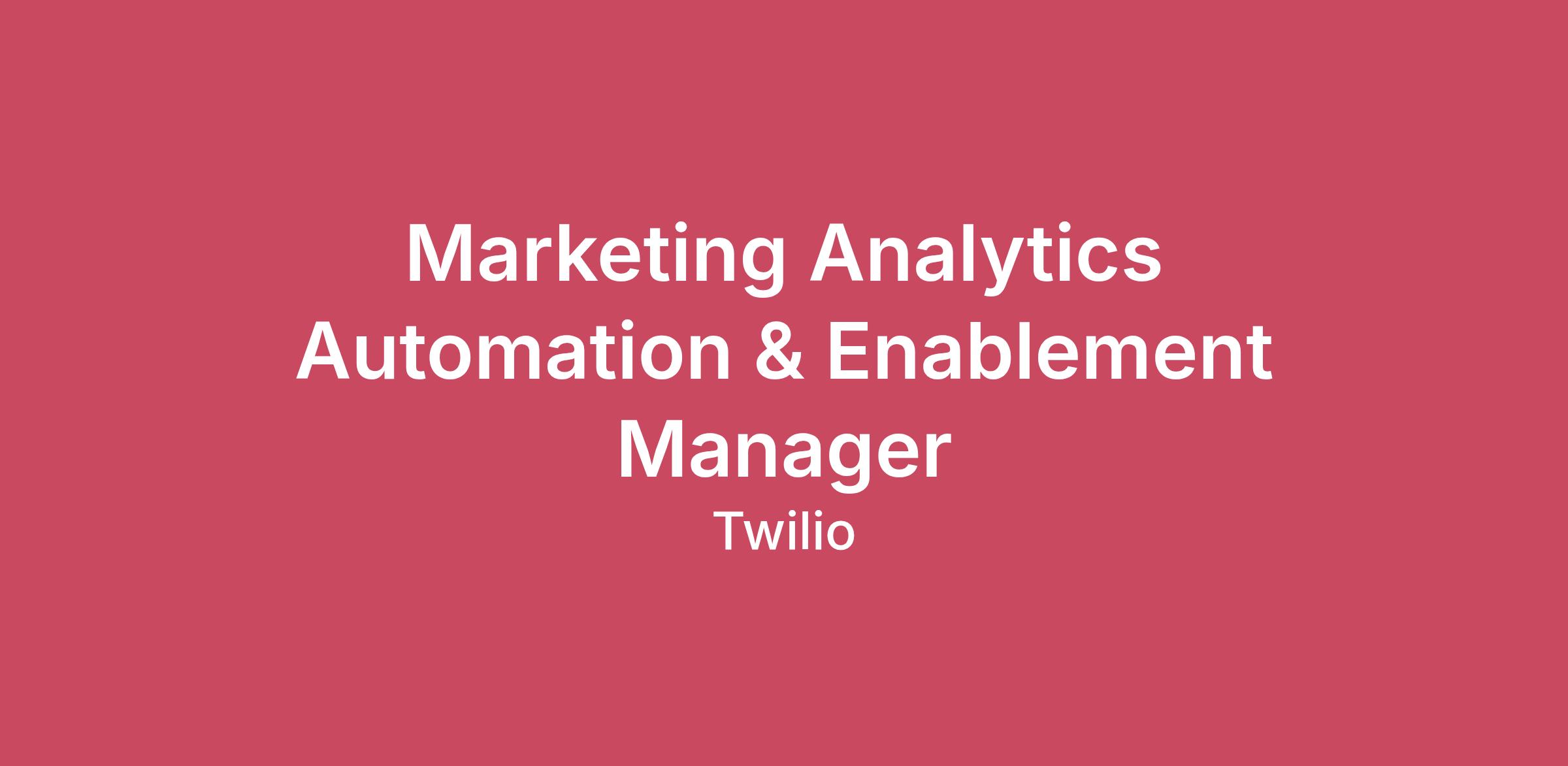 Who we are At Twilio, we’re shaping the future of communications, all from the comfort of our homes. We deliver innovative solutions to hundreds of thousands of businesses and empower millions of developers worldwide to craft personalized customer experiences. Our dedication to remote-first work, and strong culture of connection and global inclusion means that no matter your location, you’re part of a vibrant team with diverse experiences making a global impact each day. As we continue to revolutionize how the world interacts, we’re acquiring new skills and experiences that make work feel truly rewarding. Your career at Twilio is in your hands.We use Artificial Intelligence (AI) to help make our hiring process efficient. That said, every hiring decision is made by real Twilions! .See yourself at Twilio Join the team as Twilio’s next Marketing Analytics Automation & Enablement Manager. About the job This position is needed to serve as architect of the marketing organization’s automated intelligence engine, unifying disparate data ecosystems into a cohesive, high-velocity growth platform. You will ensure the integrity of our underlying data architecture, implementing sophisticated automation that transforms reporting and analytics velocity, and establish a "best-in-class" work ecosystem through advanced generative AI systems. As the internal automation champion, you will drive the strategic scaling of the entire marketing analytics organization, institutionalizing efficiency and dramatically accelerating the 'velocity to value' for global stakeholders." Responsibilities In this role, you’ll: Architect automated frameworks for reporting & analytics to drive weekly executive cadences, replacing manual effort with high-velocity, real-time insights Consult with cross-functional team members to identify workflow bottlenecks and architect automated systems that maximize departmental throughput. Conduct comprehensive audits of analytics and reporting workflows to design and implement optimized, automated processes that eliminate structural inefficiencies and maximize team output. 3P Enrichment: Drive enhanced capability and automation for third-party data enrichment tools. Design and govern a shared AI foundation within the marketing strategy & analytics team, including a centralized repository of optimized skills, prompts, "gems," and automated scripts. You will turn individual expertise into institutional knowledge, ensuring the entire marketing organization benefits from a unified, high-performance AI toolkit. Act as the lead architect for AI-driven workflows - leveraging OpenAI, Claude, and Gemini - to automate Query optimization, Insights generation while actively training the broader team to institutionalize these efficiencies. Serve as the primary technical lead for collaboration with our Enterprise Tech (ET) teams, overseeing Segment integrations, BigQuery architecture, and overarching data governance to ensure a secure, scalable environment. Establish the automated data frameworks necessary to unify disparate top-of-funnel and bottom-of-funnel signals, providing a comprehensive, end-to-end view of marketing’s impact on pipeline and LTV. Qualifications Twilio values diverse experiences from all kinds of industries, and we encourage everyone who meets the required qualifications to apply. If your career is just starting or hasn't followed a traditional path, don't let that stop you from considering Twilio. We are always looking for people who will bring something new to the table! *Required: 5+ years of experience in analytics engineering or data operations, with a focus on building automated, high-velocity reporting frameworks and intelligence systems. Demonstrated experience applying Generative AI and LLM-driven solutions (OpenAI, Claude, Gemini) to automate complex analytics workflows and data synthesis at scale. Expert-level SQL proficiency (Presto/BigQuery, CTEs, window functions) and the ability to leverage Python for data automation and systems integration. Advanced experience in prompt engineering for complex data extraction, automated code generation, and sophisticated narrative analysis. Deep understanding of the data lifecycle, including ETL/ELT processes, data warehousing, and the integration of third-party enrichment tools into a centralized ecosystem A passion for "socializing" technical advancements and a proven ability to lead team-wide training to institutionalize new tools and workflows Proven track record of partnering with Data Engineering and Enterprise Tech teams to govern data architecture while successfully gathering requirements from non-technical stakeholders. Desired: Familiarity with Salesforce object structures (Leads, Contacts, Opportunities) and the logic required for complex pipeline and revenue attribution. Hands-on experience with the "technical plumbing" of web analytics, including GA4, Google Tag Manager (GTM), and Adobe Target, specifically regarding how they feed into downstream data warehouses. Advanced proficiency in Looker or Tableau, with a focus on building scalable, automated dashboards that empower stakeholders with self-service insights. Experience managing the data flow between CDPs (e.g., Segment), marketing automation platforms, and Business Intelligence layers to ensure a "single source of truth." Track record of translating vague business questions into technical data requirements and automated solutions. Location This role will be remote, but is not eligible to be hired in CA, CT, NJ, NY, PA, WA. Travel We prioritize connection and opportunities to build relationships with our customers and each other. For this role, approximately 15% travel is anticipated to help you connect in-person in a meaningful way. What We Offer Working at Twilio offers many benefits, including competitive pay, generous time off, ample parental and wellness leave, healthcare, a retirement savings program, and much more. Offerings vary by location. Co