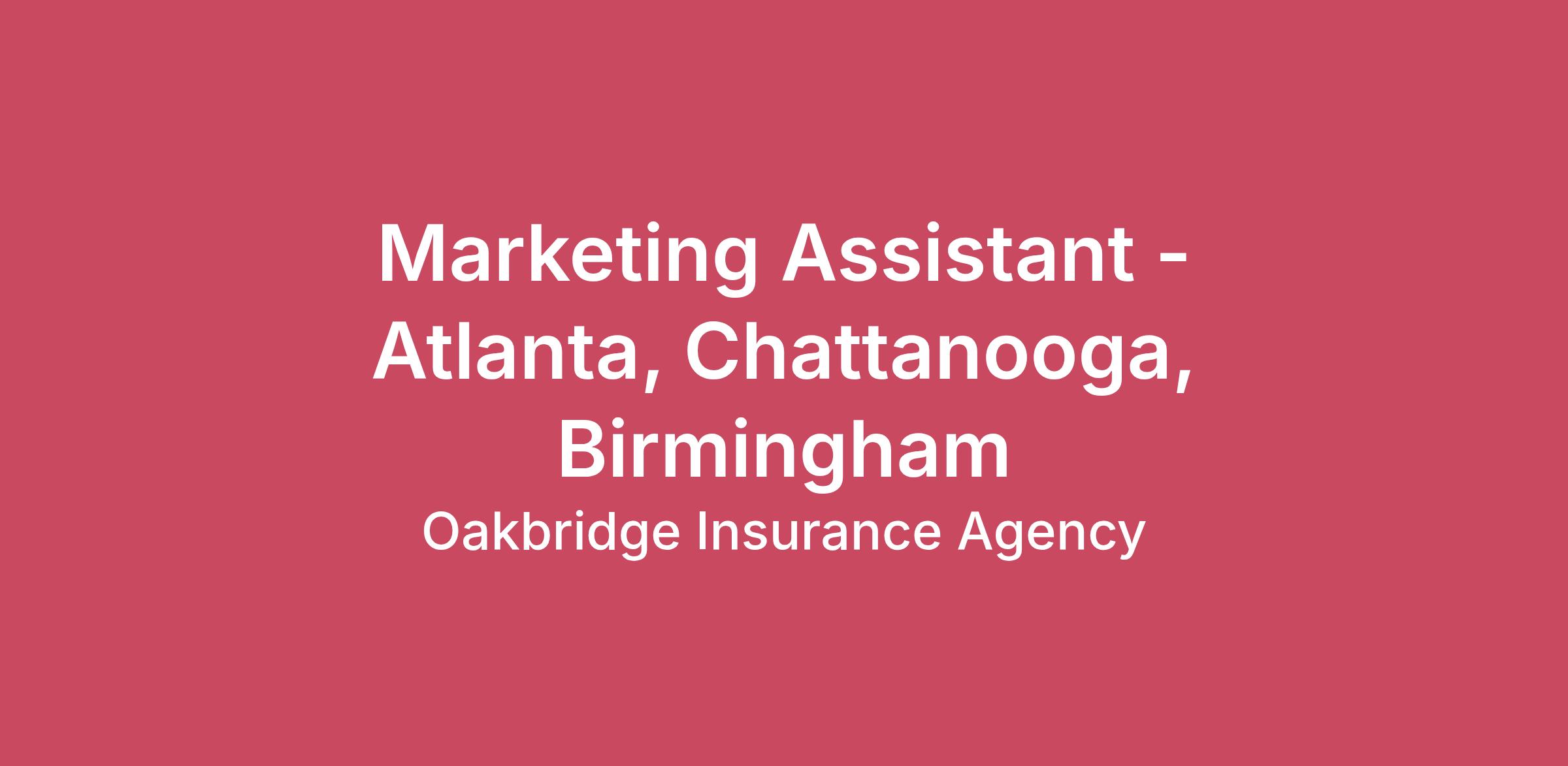 Marketing Assistant - Atlanta, Chattanooga, Birmingham Overview: We are seeking a dynamic, organized, and detail-oriented Marketing Assistant/Coordinator to join our team at Oakbridge Insurance. The ideal candidate will support our marketing efforts and contribute to the overall growth and success of our agency. Responsibilities: Administrative Support: Provide administrative support to the marketing team, including scheduling meetings, managing calendars, and maintaining marketing databases. Collaboration: Work closely with other departments to align marketing strategies with business goals. Content Creation: In collaboration with our external marketing firm partner, develop engaging content marketing materials. Market Research: Conduct market research to identify trends, competitor activities, and customer preferences. Event Management: Support Chief of Staff, as necessary, in coordinating and managing marketing events, company meetings and promotional activities. Analytics and Reporting: In combination with our external marketing firm partner, track and analyze our marketing performance, providing insights and recommendations for improvement. Brand Management: Ensure consistency in brand messaging and visual identity across all marketing materials. Qualifications: Education: Bachelor's degree in Marketing, Communications, Business, or a related field. Experience: 1-3 years of experience in marketing, preferably within the insurance industry. Skills: Strong written and verbal communication skills. Proficiency in marketing software and tools Excellent organizational and time management skills. Ability to work independently and as part of a team. Creative thinking and problem-solving abilities. Attention to detail and accuracy. Technical Proficiency: Familiarity with graphic design software. Expectations: Professionalism: Maintain a high level of professionalism and confidentiality. Adaptability: Be flexible and adaptable to changing priorities and deadlines. Initiative: Show initiative and proactively contribute ideas to improve marketing strategies. Team Player: Collaborate effectively with team members and other departments. Customer Focus: Understand and prioritize the needs of our customers in all marketing efforts. Continuous Learning: Stay updated with the latest marketing trends and best practices. Benefits: Competitive salary and benefits package. Opportunities for professional development and growth. Positive and collaborative work environment.