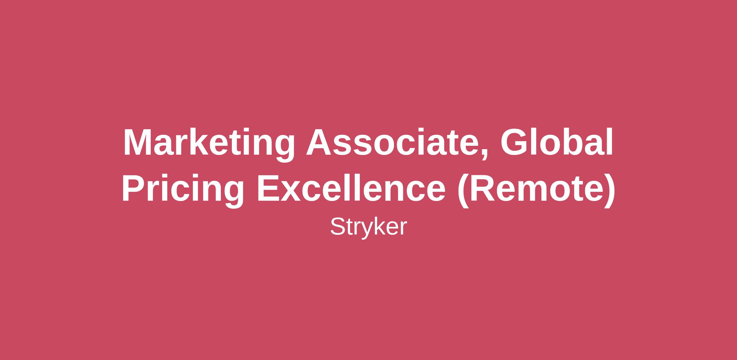 Work Flexibility: RemoteAs a Marketing Associate supporting our new Global Pricing Excellence team, you will play a key role in advancing pricing excellence initiatives across Stryker. You’ll support marketing execution, content development, analytics, and cross-functional collaboration to ensure the Global Pricing organization has the tools, insights, and storytelling needed to drive impact.WHAT YOU WILL DO:Create and manage marketing collateral including presentations, case studies, newsletters, and sales tools to communicate pricing strategies and program success.Assist in the planning and execution of global campaigns that promote pricing excellence tools, resources, and initiatives.Conduct market research on pricing trends, competitor strategies, and customer insights to inform marketing efforts. Track and analyze KPIs, engagement metrics, and ROI to report the effectiveness of pricing-related marketing activities.Serve as a subject matter expert (SME) for key pricing programs to support internal stakeholders with timely, accurate information.Coordinate webinars, workshops, and internal events designed to drive awareness, training, and engagement around pricing excellence.Partner with global and regional teams to ensure messaging is aligned with brand standards and adapted effectively for local markets. Support cross-functional teams including Pricing, Marketing, and Sales by providing insights, feedback, and materials that reflect customer needs and usage trends.WHAT YOU NEED:RequiredBachelor’s degreePreferred:Internship experience or relevant coursework with marketing, sales, or healthcareAt least a year of experience in marketing, sales, or related field$59,900 - $108,300 salary plus bonus eligible + benefits. Individual pay is based on skills, experience, and other relevant factorsTravel Percentage: 30%Stryker Corporation is an equal opportunity employer. Qualified applicants will receive consideration for employment without regard to race, ethnicity, color, religion, sex, gender identity, sexual orientation, national origin, disability, or protected veteran status. Stryker is an EO employer – M/F/Veteran/Disability.Stryker Corporation will not discharge or in any other manner discriminate against employees or applicants because they have inquired about, discussed, or disclosed their own pay or the pay of another employee or applicant. However, employees who have access to the compensation information of other employees or applicants as a part of their essential job functions cannot disclose the pay of other employees or applicants to individuals who do not otherwise have access to compensation information, unless the disclosure is (a) in response to a formal complaint or charge, (b) in furtherance of an investigation, proceeding, hearing, or action, including an investigation conducted by the employer, or (c) consistent with the contractor’s legal duty to furnish information.