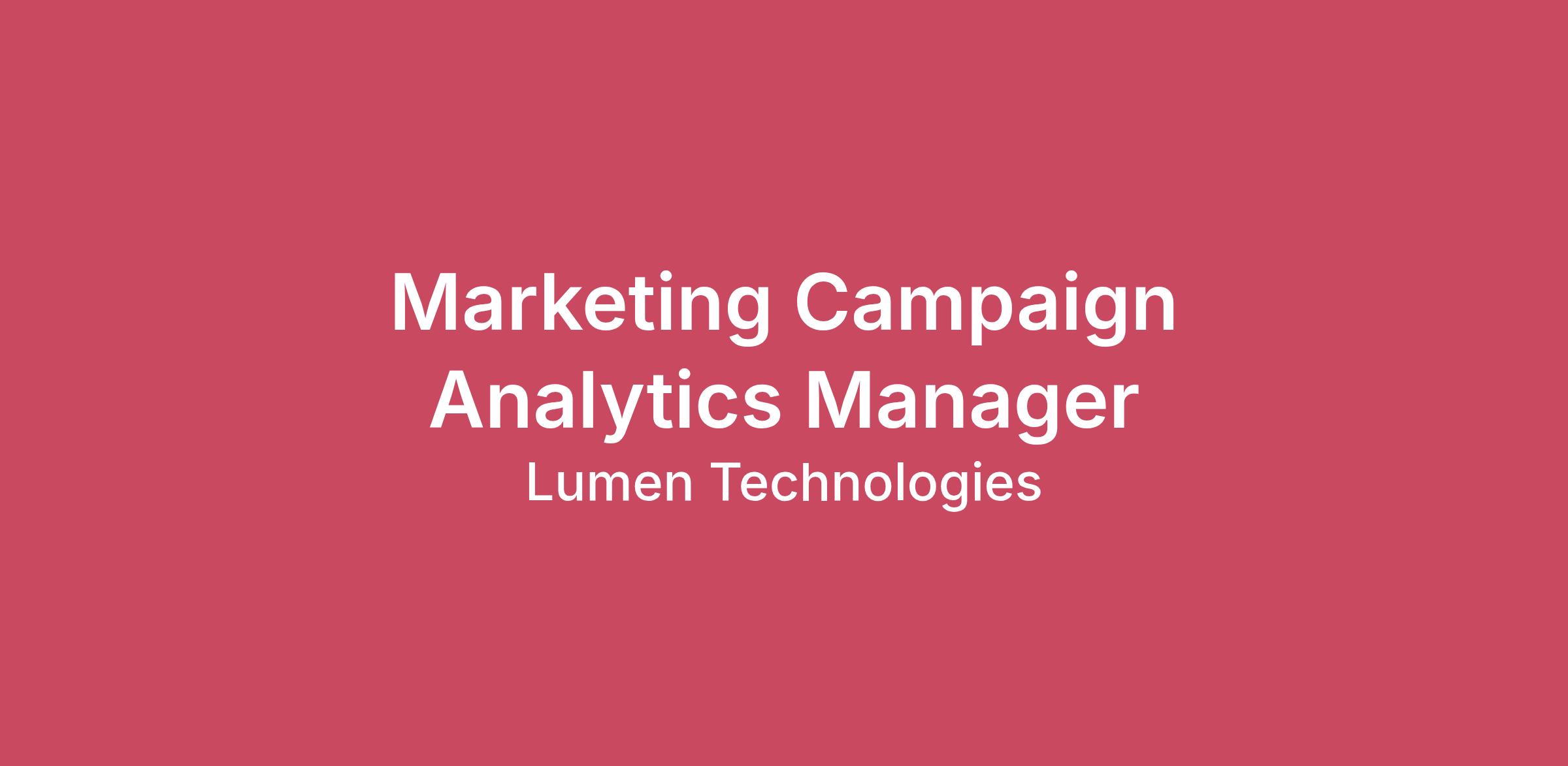 Lumen is the trusted network for AI. We’re transforming how businesses connect, secure, and scale in an AI-driven world.By connecting people, data, and applications quickly, securely, and effortlessly, we help organizations move faster and unlock what’s next.At Lumen, people power progress. Our culture is built on teamwork, trust, and transparency, giving you the flexibility, support, and opportunity to make a lasting impact. We’re looking for top-tier talent ready to take on the challenge. Join us in building the future.The Role The Marketing Campaign Analytics Manager resides within Campaigns & Programs and reports to the Analytics Team. Campaign Analytics delivers analysis, insights, and recommendations on campaign and program performance on both a proactive and reactive basis using a range of analysis techniques to inform and optimize our marketing tactics. This is a highly visible role that requires strong project management, reporting proficiency, and strategic data analysis. The ideal candidate will be a team player focused on data analytics and marketing campaign/program optimization to substantially impact pipeline, progression, and deal closure.The Main Responsibilities Provide business intelligence to help understand trends and patterns, identify gaps and opportunities, and make data-informed decisions. Provide campaign performance analysis by collecting and analyzing data, developing insights, creating visualizations, and delivering monthly analytic packages to stakeholders. Track proof of campaign performance/execution through Salesforce dashboards, PowerBI, Excel, and email readouts. Expert in Excel, able to manipulate large datasets, create pivot tables, review datasets, implement complex searches/formulas, and provide analytical recommendations based on the information gathered. Performance analysis based on statistical analysis. (Eg. descriptive analysis, inferential analysis, predictive analysis, prescriptive analysis, exploratory data analysis (EDA), and causal analysis, utilizing basic methods like mean, standard deviation, regression, hypothesis testing, and sample size determination. Work in an agile environment, make decisions, and complete reporting and ad hoc requests on time and without assistance. Requires a self-starter with strong experience in organization, communication, execution, and accuracy. What We Look For in a Candidate Bachelor’s degree in marketing, business, or related discipline (preferred) 6+ years’ experience in a marketing or sales role, planning and actioning multiple complex marketing programs, including budget management Data Analysis: Ability to manipulate and interpret large data sets to identify trends, insights, and actionable recommendations. Critical Thinking: Assess campaign performance and pinpoint areas of improvement. Data Analytics/Visualization Tools: Proficiency in platforms like Adobe Analytics, Salesforce, Marketo, Excel, PowerBI. Expert experience in Microsoft Excel is a must, and experience using various statistical analysis techniques. Campaign Metrics and KPIs: Deep understanding of metrics like ROI, LTV, Cost Per Sale, Conversion Rates, Lead Generation metrics, and Pipeline performance, etc. Strong interpersonal, facilitation, and project management skills Rapid learner who thrives in a fast-paced, high-growth environment Strong written and verbal communication skills Data-driven mindset with attention to detail, producing accurate and creative work Strong collaborative and problem-solving skills to execute marketing programs in support of achieving SMART business objectives while keeping a positive attitude Experience building reports and dashboards in Salesforce.com and experience using Power BI Strong project management and organizational skills; ability to successfully juggle multiple projects and effectively prioritize tasks Compensation This information reflects the anticipated base salary range for this position based on current national data. Minimums and maximums may vary based on location. Individual pay is based on skills, experience and other relevant factors.Location Based Pay Ranges$103,711 - $138,281 in these states: AL AR AZ FL GA IA ID IN KS KY LA ME MO MS MT ND NE NM OH OK PA SC SD TN UT VT WI WV WY $108,896 - $145,195 in these states: CO HI MI MN NC NH NV OR RI $114,082 - $152,109 in these states: AK CA CT DC DE IL MA MD NJ NY TX VA WA Lumen offers a comprehensive package featuring a broad range of Health, Life, Voluntary Lifestyle benefits and other perks that enhance your physical, mental, emotional and financial wellbeing. We're able to answer any additional questions you may have about our bonus structure (short-term incentives, long-term incentives and/or sales compensation) as you move through the selection process. Learn more about Lumen's:BenefitsBonus Structure #LI-RemoteRequisition #: 341390Background ScreeningIf you are selected for a position, there will be a background screen, which may include checks for criminal records and/or motor vehicle reports and/or drug screening, depending on the position requirements. For more information on these checks, please refer to the Post Offer section of our FAQ page. Job-related concerns identified during the background screening may disqualify you from the new position or your current role. Background results will be evaluated on a case-by-case basis.Pursuant to the San Francisco Fair Chance Ordinance, we will consider for employment qualified applicants with arrest and conviction records. Equal Employment OpportunitiesWe are committed to providing equal employment opportunities to all persons regardless of race, color, ancestry, citizenship, national origin, religion, veteran status, disability, genetic characteristic or information, age, gender, sexual orientation, gender identity, gender expression, marital status, family status, pregnancy, or other legally protected status (collectively, “protected statuses”). We do not tolerate unla