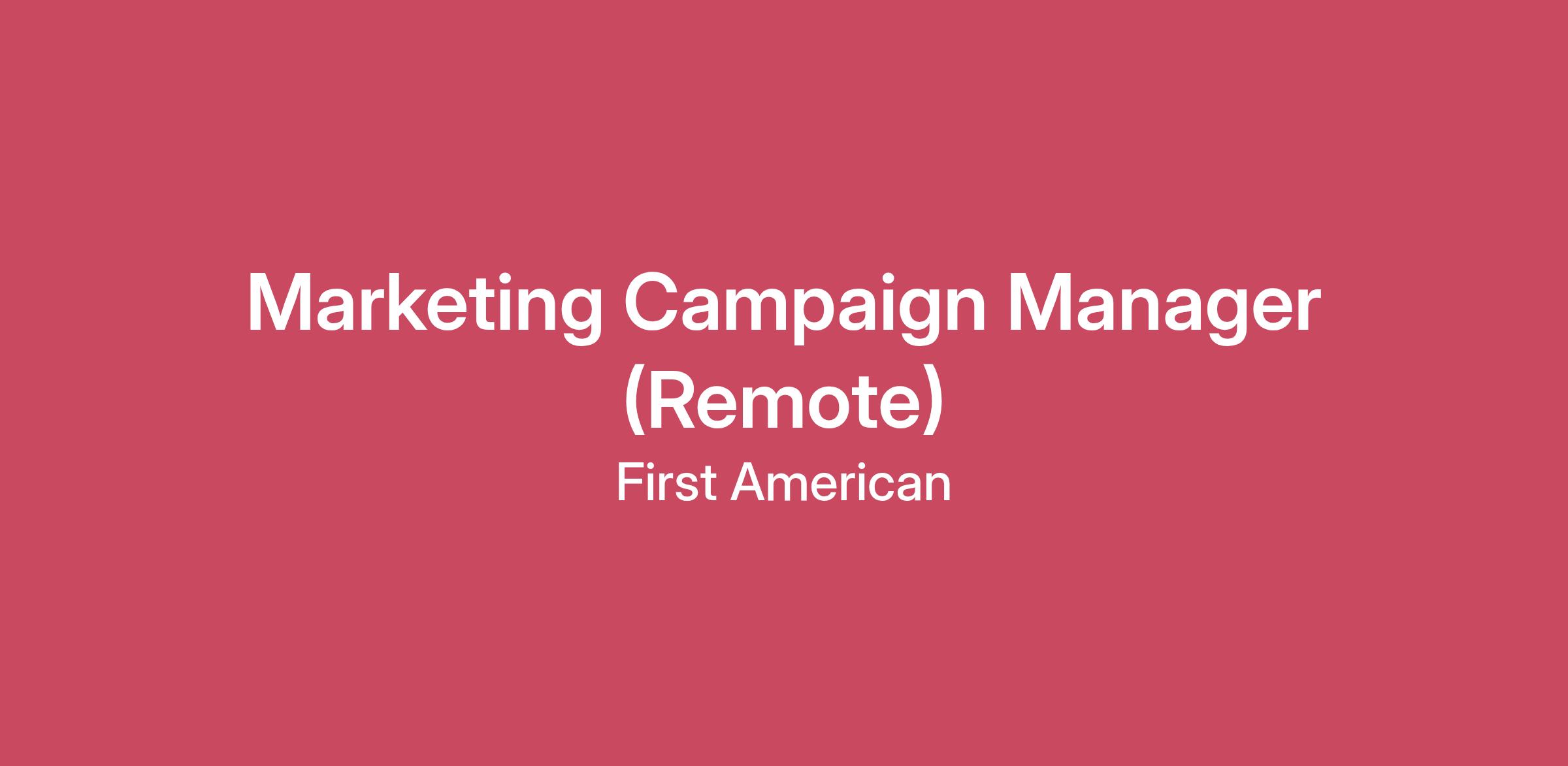 Who We AreJoin a team that puts its People First! Since 1889, First American (NYSE: FAF) has held an unwavering belief in its people. They are passionate about what they do, and we are equally passionate about fostering an environment where all feel welcome, supported, and empowered to be innovative and reach their full potential. Our inclusive, people-first culture has earned our company numerous accolades, including being named to the Fortune 100 Best Companies to Work For® list for ten consecutive years. We have also earned awards as a best place to work for women, diversity and LGBTQ+ employees, and have been included on more than 50 regional best places to work lists. First American will always strive to be a great place to work, for all. For more information, please visit www.careers.firstam.com.What We DoFirst American Title is seeking an experienced Marketing Campaign Manager to lead and execute strategic initiatives that generate demand, drive leads, and grow revenue. This role owns the development, execution and optimization of integrated programs – new and existing – across digital, email, social, paid media and events. They will work closely with product marketing, sales, operations and creative teams to develop and implement campaigns and supporting sales materials, and track and optimize performance to achieve measurable results. The ideal candidate is a data-driven marketer, experienced in goal setting and KPI management, with a passion for innovation and collaboration, and the ability to craft and deliver effective campaigns targeting key customer segments.Marketing Campaign Manager will run cross-channel campaigns that move the needle on pipeline and brand awareness.What You’ll DoPlan, execute and measure integrated campaigns (web, email, social, paid, events), leveraging marketing automation platforms to design, execute, and optimize, driving lead generation, nurturing prospects, improving conversion rates, and growing wallet share with existing customersWork closely and collaboratively with product, sales, operations, business leadership, and design teamsManage external vendors / agencies as neededTrack KPIs and report campaign effectiveness to leadershipWhat You’ll BringBachelor’s degree and 7-10 years marketing experienceExperience running B2B campaigns across multiple audiencesReal estate, title insurance, or underwriting experience preferredExperience with Salesforce, MarketingCloud, HubSpot and Google AnalyticsStrong project management skillsData-first mindset; ability to set up tracking and attributionExcellent writing, communication, and presentation skillsAbility to influence without authority and collaborate with othersEstablished history of effective, ROI-driven marketing and sales support, and lead generationKnowledge and understanding of media and media buyingPay Range: $97,700.00 - $130,300.00 Annually This hiring range is a reasonable estimate of the base pay range for this position at the time of posting. Pay is based on a number of factors which may include job-related knowledge, skills, experience, business requirements and geographic location. What We OfferBy choice, we don’t simply accept individuality – we embrace it, we support it, and we thrive on it! Our People First Culture celebrates diversity, equity and inclusion not simply because it’s the right thing to do, but also because it’s the key to our success. We are proud to foster an authentic and inclusive workplace For All. You are free and encouraged to bring your entire, unique self to work. First American is an equal opportunity employer in every sense of the term.Based on eligibility, First American offers a comprehensive benefits package including medical, dental, vision, 401k, PTO/paid sick leave and other great benefits like an employee stock purchase plan.