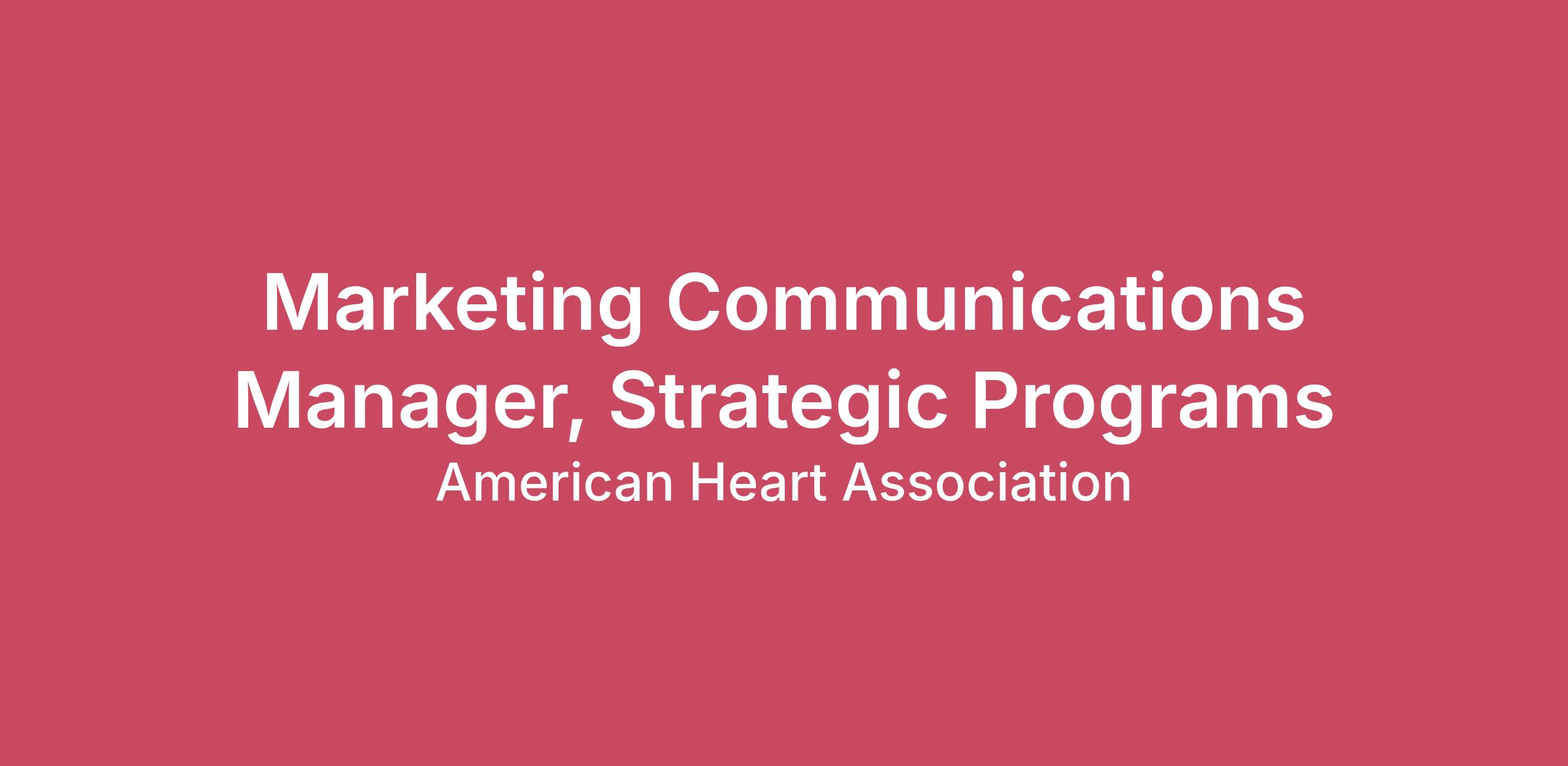 Overview Since our founding in 1924, we've cut cardiovascular disease deaths in half, but there is still so much more to do. To overcome today’s biggest health challenges and accelerate this progress, we need passionate individuals like you. Join our movement, be part of the progress, and help ensure a healthier future for all. You matter, and so does the impact you can make with us. The American Heart Association is seeking an experienced Marketing Communications Manager - Strategic Programs in our National Center office located in Dallas, TX. The location for this position is remote. This is a full time, benefits eligible, grant funded opportunity, with current funding through 1/30/2029. The Manager, Marketing & Communications – Strategic Programs is responsible for supporting the development and execution of integrated marketing and communications strategies for high-priority, externally supported, or enterprise-level initiatives. This role partners closely with the Senior Marketing Communications Manager to translate program objectives into actionable marketing plans that drive measurable engagement, adoption, and impact across professional audiences. The position requires strong project management, cross-functional coordination, and performance optimization skills, along with the ability to manage complex initiatives with defined metrics and timelines. The Association offers many resources to help you maintain work-life harmonization through your changing needs and life situations. To help you be successful, you will have access to Heart U, our award-winning corporate university, as well as additional training and support, locally. #TheAHALife is more than a company culture; it is our way of life. It embodies our commitment to work-life harmonization and is guided by our core values where our employees can thrive both personally and professionally. Discover why you will Be Seen. Be Heard. Be Valued at the American Heart Association by following us on LinkedIn, Instagram, Facebook, X, and at heart.jobs. Responsibilities Strategic Marketing Execution Support development and execution of integrated marketing and communications plans aligned to program objectives and defined performance metrics. Collaborate with Science, Business Units, Communications, Digital, Social, and external vendor teams to ensure coordinated go-to-market execution. Develop campaign briefs, timelines, messaging frameworks, and content calendars to support program deliverables. Align marketing strategies to audience needs, including healthcare professionals, specialty groups, and other defined target segments. Campaign & Channel Management Coordinate implementation of campaigns across paid, owned, and earned channels. Partner with paid media, digital marketing, and social teams to support cohesive channel strategy execution. Manage vendor relationships and marketing deliverables to ensure quality, timeliness, and alignment with objectives. Monitor campaign performance, analyze results, and recommend optimizations based on data insights. Support testing and experimentation efforts to improve reach, engagement, and performance. Project Management & Cross-Functional Collaboration Lead day-to-day marketing project management for assigned programs, ensuring milestones, approvals, and deliverables remain on track. Facilitate communication across cross-functional stakeholders to maintain alignment and clarity of roles. Support budget tracking and ensure marketing activities remain within approved funding parameters. Prepare performance reports, dashboards, and presentations for internal stakeholders and leadership. Qualifications Bachelor’s degree in Marketing, Communications, Business, Public Health, or related field, or equivalent experience. 3 years of experience in marketing, marketing communications, or campaign management. 5 years of experience is preferred. Experience executing integrated marketing campaigns across multiple channels. Strong project management skills with ability to manage multiple priorities and deadlines. Experience working with internal teams and external vendors under strict timelines. Working knowledge of marketing performance metrics and reporting. Strong written, verbal, and presentation communication skills. Preferred Experience in healthcare, scientific meetings, professional education, or nonprofit environments. Experience supporting externally funded or grant-supported initiatives. Experience supporting marketing efforts targeting healthcare professionals. Compensation & Benefits The expected pay range is $75,000 - $85,000. Pay is commensurate with experience; geographic differentials to the pay range may apply. The American Heart Association reserves the right to pay more or less than the posted range. The American Heart Association invests in its people. Here are the main components of our total rewards package. Visit Rewards & Benefits to see more details. Compensation – Our goal is to ensure you have a competitive base salary. That’s why we regularly review the market value of jobs and make adjustments, as needed. Performance and Recognition – You are rewarded for achieving success through annual salary planning and incentive programs; eligibility for an incentive program is based on the type of position. Benefits – We offer a wide array of benefits including medical, dental, vision, disability, and life insurance, along with a robust retirement program that includes an employer match and automatic contribution. As a mark of our commitment to employee well-being, we also offer an employee assistance program, employee wellness program and telemedicine, and medical consultation. Professional Development – You can join one of our many Employee Resource Groups (ERG) or be a mentor/mentee in our professional mentoring program. Heart U is the Association’s national online university, with more than 100,000 resources designed to meet your needs and busy schedule. Work-Life