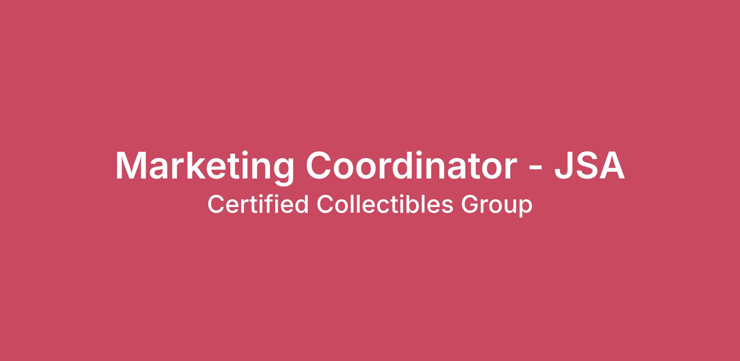 Marketing Coordinator – JSA Full-Time, Monday to Friday, On-site or Remote The Certified Collectibles Group is seeking a Marketing Coordinator to join our fast-paced, highly collaborative marketing team! Certified Collectibles Group is the world’s leading provider of expert and impartial services for collectibles, including coins, banknotes, comic books, magazines, TCGs, sports cards, video games, home video, autographs, and more. This role owns marketing execution for the leading brand on autograph authentication, JSA. As a Marketing Coordinator for JSA, you will help drive our brand growth through compelling, customer-focused strategies. We’re looking for a skilled marketing specialist that is creative, self-motivated, proactive, and detail-oriented; have strong organizational; and possess the ability to work in a fast-paced environment. Primary Responsibilities Execute marketing activations for events, ensuring seamless coordination and maximum engagement with target audiences. This includes the timely request of graphics or copy needed to execute. Post approved events on the JSA website events - show tracker Generate email campaigns for all the events and new services we offer at them. Coordinate social media collabs Request and publish articles featured on the home page and blog section. Publish JSA Authorized Dealers on the website once confirmed by sales Support the execution of marketing plans Monitor and analyze marketing activations, providing insights and recommendations for continuous improvement based on key performance metrics Maintain and organize marketing materials, including images, templates, and past campaign assets, ensuring easy access and reference Ensure all promotional materials are accurate, reflecting current submission protocols, pricing, and brand guidelines Coordinate with JSA Authorized Auction Houses and Dealers to help promote their upcoming auctions. This is an on-site or remote position, with occasional opportunities for travel to main events, which may include weekends as well as to Headquarters in Florida or New Jersey. Education And Experience Requirements: 2+ years of experience as a marketing coordinator for an advertising, PR agency or other large company with multiple concurrent projects Great verbal and written communication skills Strong organizational, writing, editing, and proofreading skills Detail-oriented, organized, collaborative, and flexible Familiarity with or a passion for memorabilia and collectibles is definitely a plus. Ability to work and manage projects both independently and collaboratively with diverse teams, marketing department, grading team, and preshow team Excellent time management skills Ability to work under tight deadlines and handle multiple assignments concurrently Strong problem-solving and innovative thinking abilities Key stakeholders: Reports to the Sr. Manager, Marketing Peers on Marketing team Graphic Design and Video production teams