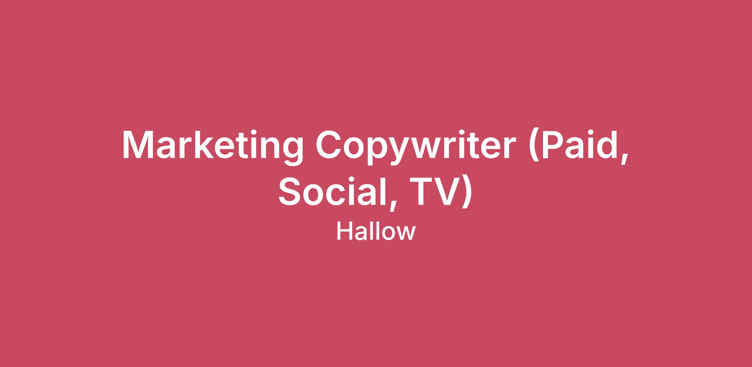 TL;DR: We’re looking for a Marketing Copywriter to help bring Hallow’s message to life across paid ads, social, and TV—writing high-performing scripts and creative that invite people into prayer.What You'll DoOwn Ad Creative Copy (Paid, Social, TV): You’ll write scripts and copy for ads across channels—from paid social and UGC to influencer partnerships and TV commercials. Your work will help millions of people discover Hallow and take their first step into prayer.Turn Performance into Creative: You’ll dig into ad performance—what’s working, what’s not—and turn those insights into better hooks, better scripts, and better storytelling. You know how to spot patterns and iterate quickly.Write for Real People (and Real Voices): You’ll create scripts for a wide range of voices—from everyday users and UGC creators to influencers and celebrity partners. You’ll adapt tone and messaging while staying true to Hallow’s voice.Collaborate Cross-Functionally: You’ll work closely with Design, Content, and Partnerships teams to bring campaigns to life—from initial concept to final execution.Test, Learn, Repeat: You’ll constantly test new hooks, formats, angles, and messaging. You’re excited by experimentation and motivated by seeing your ideas translate into real impact.What You'll LoveMission: This work is incredibly humbling. Everyday we hear amazing stories and we get the pleasure of working on something that’s impacting lives. One of our favorite user quotes: “I hate quoting an old, overused cliche, but I’ve been very lost. And I think for the first time in a while I may be found.”Ownership: When a company is this small, every employee is a core team member with an outsized impact. You'll be the face of Hallow as you build creative that is seen by millions around the world and directly impacts growth.Growth: From day 1, you’ll be a part of the startup journey. We're growing quickly, and we’ll need your help to create a world-class team and get individuals praying in more countries around the world.Flexibility: HQ is in Chicago (USA); this position is remote. We’re super flexible with location/hours; we don’t care when you work, just that it gets done.Comp: We will pay competitive market rates for this hourly, part-time contract position. What We're Looking ForPassion: First and foremost, we’re looking for someone excited and passionate about our mission. It makes it a lot more fun to actually care about what you’re working on!Experience: You have strong experience writing high-performing marketing copy, especially for paid ads, UGC, influencer content, or TV. You know how to hook attention and drive action. You must have specific examples of scripts, videos, commercials, or ads that you've worked on the past.Performance Mindset: You don’t just write—you learn. You’re comfortable digging into performance data and using it to improve your work.Creative Range: You can write for different formats, audiences, and voices—from short-form social hooks to longer storytelling scripts.Speed + Hustle: You can move quickly, iterate often, and keep up in a fast-paced environment.Attention to Detail: You care about the little things—word choice, tone, clarity—and hold a high bar for quality.Compensation Range$25-50 USD per hour dependent on experienceThis position is a part-time, contract role with no additional benefits offered. The actual amounts could be anywhere within the stated range, dependent on experience.