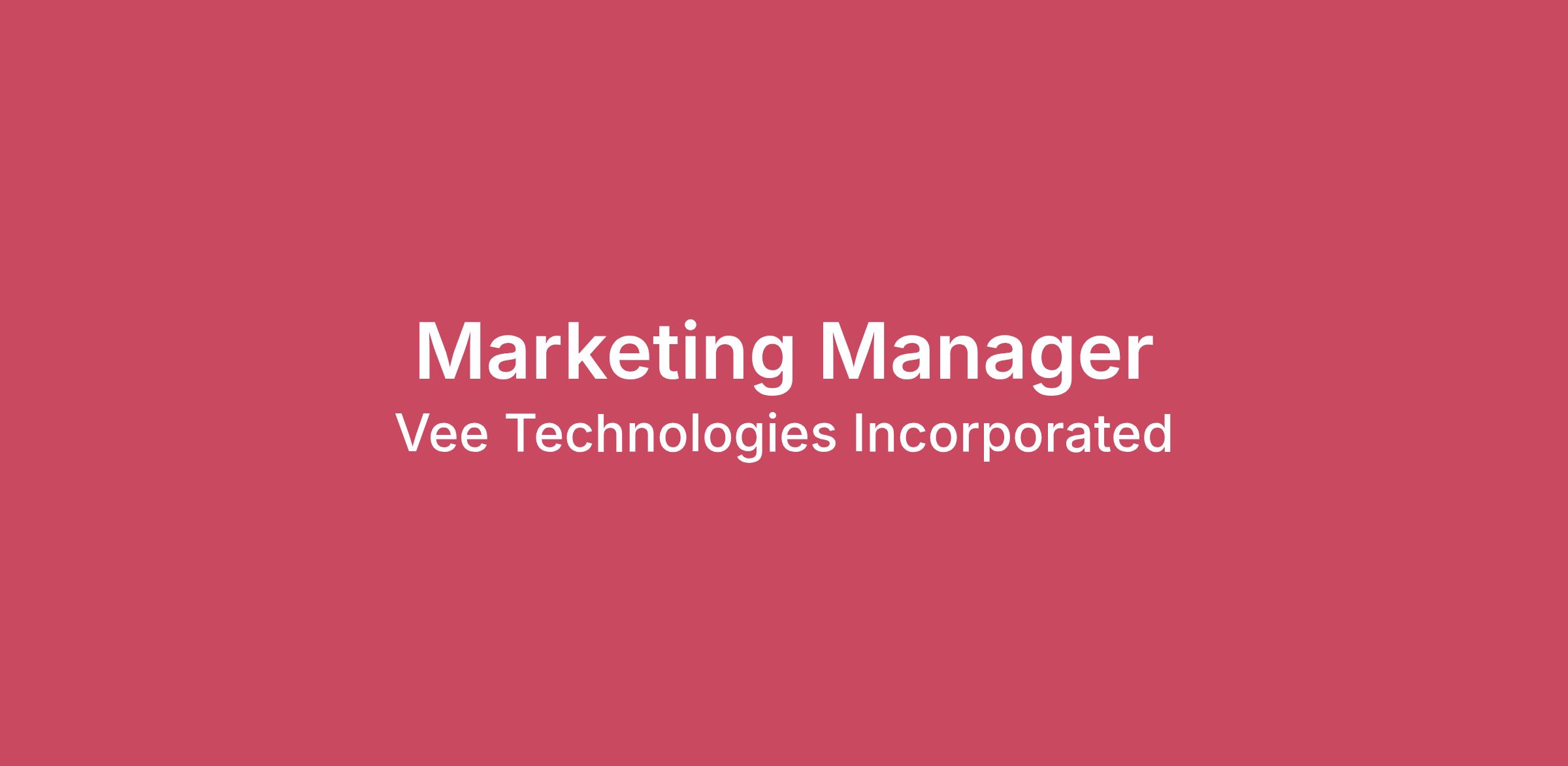 We are seeking a highly motivated Marketing Manager to join our growing team. This is a fully remote position. In this role, you will be responsible for supporting the marketing team by collecting, analyzing, and reporting on marketing data to help improve campaign performance and decision‑making in a B2B professional services environment.Key Responsibilities:Marketing Analytics & Reporting:Track and analyze basic marketing performance metrics such as leads, website traffic, email engagement, and campaign resultsAssist with creating regular reports and dashboards for the marketing teamHelp maintain data accuracy across marketing and CRM systemsCompile and organize data from multiple sources for analysisMarket & Customer Insights:Assist with basic market and competitor researchHelp organize customer and prospect data for segmentation and targetingSupport analysis of buyer behavior and engagement patternsCampaign Support:Support marketing campaigns by monitoring performance and identifying trends or areas for improvementAssist with email, digital, website, and content performance analysisHelp track leads and marketing activity through the sales funnelSupport A/B testing and simple marketing experiments Collaboration & Learning:Work closely with marketing team members to support day‑to‑day marketing activitiesPartner with sales or operations teams to share insights and reportsLearn and apply best practices in marketing analytics and reporting toolsQualifications & Skills:Bachelor’s degree in Marketing, Business, Analytics, Communications, or a related field 2-4 years of relevant experience in a marketing environment Proficiency in Excel or Google Sheets, with the ability to organize, analyze, and interpret data Experience working with CRM systems (e.g., Salesforce, HubSpot, or similar) to track leads, campaigns, and marketing activityBasic understanding of digital marketing concepts including email, website, social media, and integrated campaigns Graphic design skills, with experience creating and updating basic marketing assets (e.g., presentations, email graphics, one-pagers, or social visuals) using Canva or similar platformsStrong attention to detail, organization, and data accuracyAbility to manage multiple priorities and collaborate effectively across teamsCuriosity, adaptability, and a willingness to learn new tools, platforms, and best practicesCompensation & Benefits:Competitive base salary $80K - $100K + bonus structureHealth, dental, and vision insurance401(k) with company matchPaid time off and holidaysProfessional development opportunitiesVee Technologies is an equal opportunity employer committed to diversity and valuing the ways in which we are different. All qualified applicants will receive consideration for employment without regard to race, color, religion, sex, sexual orientation, gender identity, national origin, disability, veteran status, or other characteristics protected by applicable law.
