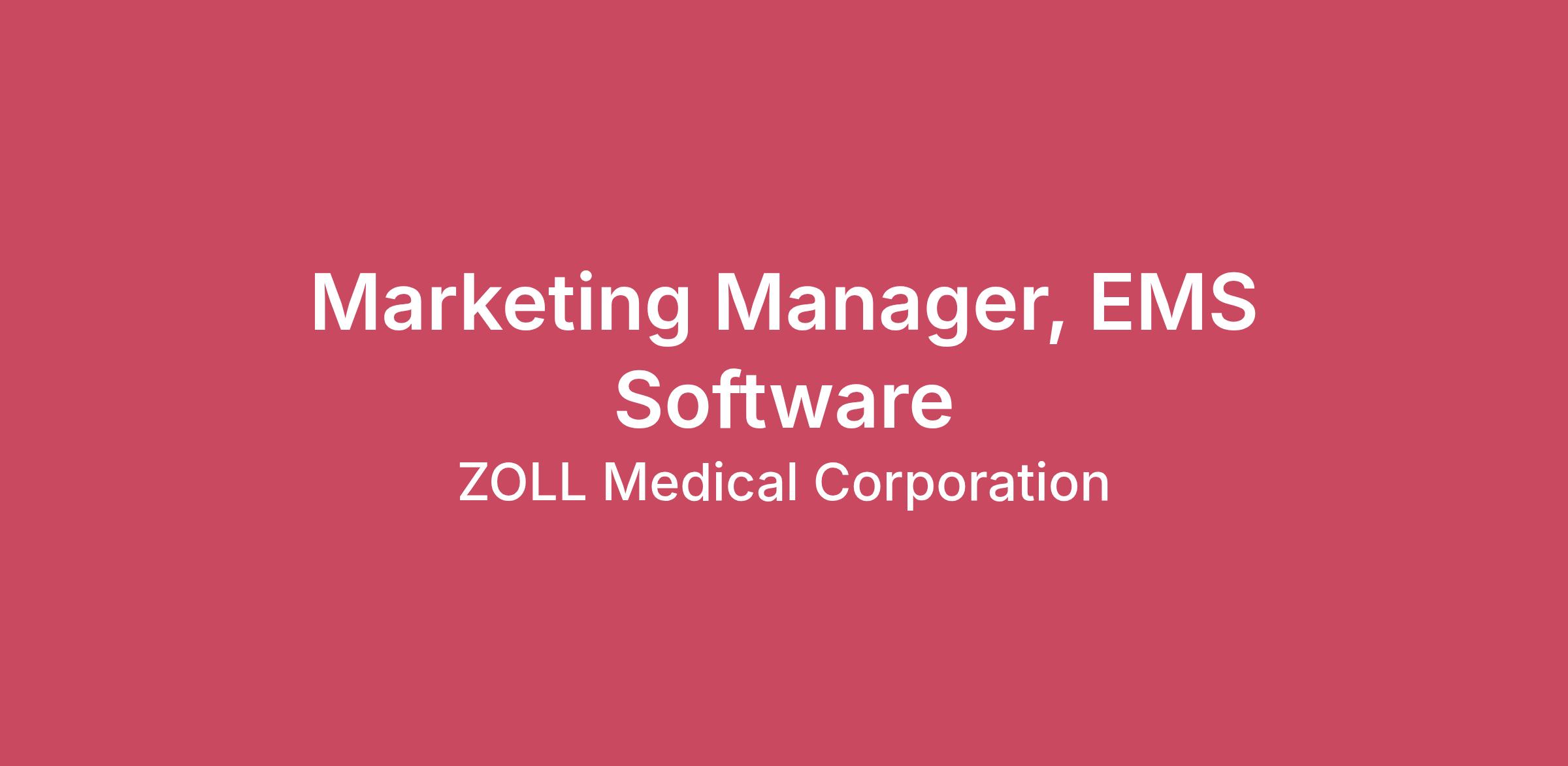 Acute Care TechnologyJob Description: Marketing Manager, EMS SoftwareThe Marketing Manager, EMS Software is responsible for executing marketing initiatives that drive adoption, retention, and growth of ZOLL’s EMS software solutions across North America.This role focuses on developing and supporting marketing strategies, product positioning, and go-to-market activities for EMS software, including clinical documentation, QA/QI, billing, dispatch, analytics, and extended system-of-care solutions.The Marketing Manager works closely with Marketing Communications, Sales, and Product Management to ensure marketing programs, messaging, and campaigns are delivered effectively. This includes creating and maintaining product guides, sales tools, presentations, digital content, and marketing collaterals to support the EMS software portfolio.Additionally, the Marketing Manager serves as a subject matter expert on EMS software, competitive solutions, and market trends, providing guidance and support to field teams, Sales, and internal stakeholders.Key Responsibilities• Support the execution of marketing strategies, product positioning, and commercialization activities for ZOLL’s EMS software solutions.• Partner with Sales leadership, Regional, and Territory Managers to drive adoption, including the development of sales tools, training materials, presentations, and marketing collateral.• Develop and maintain product guides, talking points, digital content, and other sales enablement materials to support the EMS software portfolio.• Provide strategic support and guidance to field teams to ensure effective customer engagement and adoption of EMS software solutions.• Conduct and leverage market research and competitive intelligence to inform marketing strategies, product positioning, and messaging.• Partner with the North America EMS Marketing team to drive alignment of messaging and campaigns across ZOLL’s EMS hardware and software portfolios, ensuring consistent, clear, and effective communication.• Contribute to the development and execution of go-to-market plans for software launches, upgrades, and marketing campaigns.• Manage trade show and industry event planning and execution, representing EMS software solutions and ensuring maximum impact.Required / Preferred Education and Experience• Bachelor’s degree in business, marketing, or a related discipline required• 4+ years of experience in medical software marketing, medical device or B2B marketing experience• Experience in EMS, hospital resuscitation, or cardiology preferredKnowledge, Skills and Abilities• Demonstrated ability to take complex information and make it useful to customers and sales teams.• Demonstrated written and oral communications skills including strong presentation skills.• Excellent analytical, organizational, negotiation and project management skills.• Up to date on current marketing channels and trends.• Excellent project management skills with proven ability to successfully manage and report out on multiple initiatives, marketing metrics, and campaigns.• Detail oriented and analytical, able to maintain organization, prioritize, and multi-task.• Proactive and creative problem-solver with a desire for continuous learning.• Willing to travel up to 25%At ZOLL, we're passionate about improving patient outcomes and helping save lives. We provide innovative technologies that make a meaningful difference in people's lives. Our medical devices, software and related services are used worldwide to diagnose and treat patients suffering from serious cardiopulmonary and respiratory conditions.The Acute Care Technology division of ZOLL Medical Corporation develops and delivers innovative lifesaving products and software solutions to EMS, hospital, public safety, and military customers globally. Products include AEDs, trauma kits, ventilators, temperature management solutions, and more. Our dedicated employees take pride in their commitment to improving patient outcomes while delivering world-class customer service.At ZOLL, you won’t just have a job. You'll have a career—and a purpose.Join our team. It’s a great time to be a part of ZOLL!Job SummaryThe Marketing Manager, EMS Software is responsible for executing marketing initiatives that drive adoption, retention, and growth of ZOLL’s EMS software solutions across North America.This role focuses on developing and supporting marketing strategies, product positioning, and go-to-market activities for EMS software, including clinical documentation, QA/QI, billing, dispatch, analytics, and extended system-of-care solutions.The Marketing Manager works closely with Marketing Communications, Sales, and Product Management to ensure marketing programs, messaging, and campaigns are delivered effectively. This includes creating and maintaining product guides, sales tools, presentations, digital content, and marketing collaterals to support the EMS software portfolio.Additionally, the Marketing Manager serves as a subject matter expert on EMS software, competitive solutions, and market trends, providing guidance and support to field teams, Sales, and internal stakeholders.Key ResponsibilitiesSupport the execution of marketing strategies, product positioning, and commercialization activities for ZOLL’s EMS software solutions.Partner with Sales leadership, Regional, and Territory Managers to drive adoption, including the development of sales tools, training materials, presentations, and marketing collateral.Develop and maintain product guides, talking points, digital content, and other sales enablement materials to support the EMS software portfolio.Provide strategic support and guidance to field teams to ensure effective customer engagement and adoption of EMS software solutions.Conduct and leverage market research and competitive intelligence to inform marketing strategies, product positioning, and messaging.Partner with the North America EMS Marketin