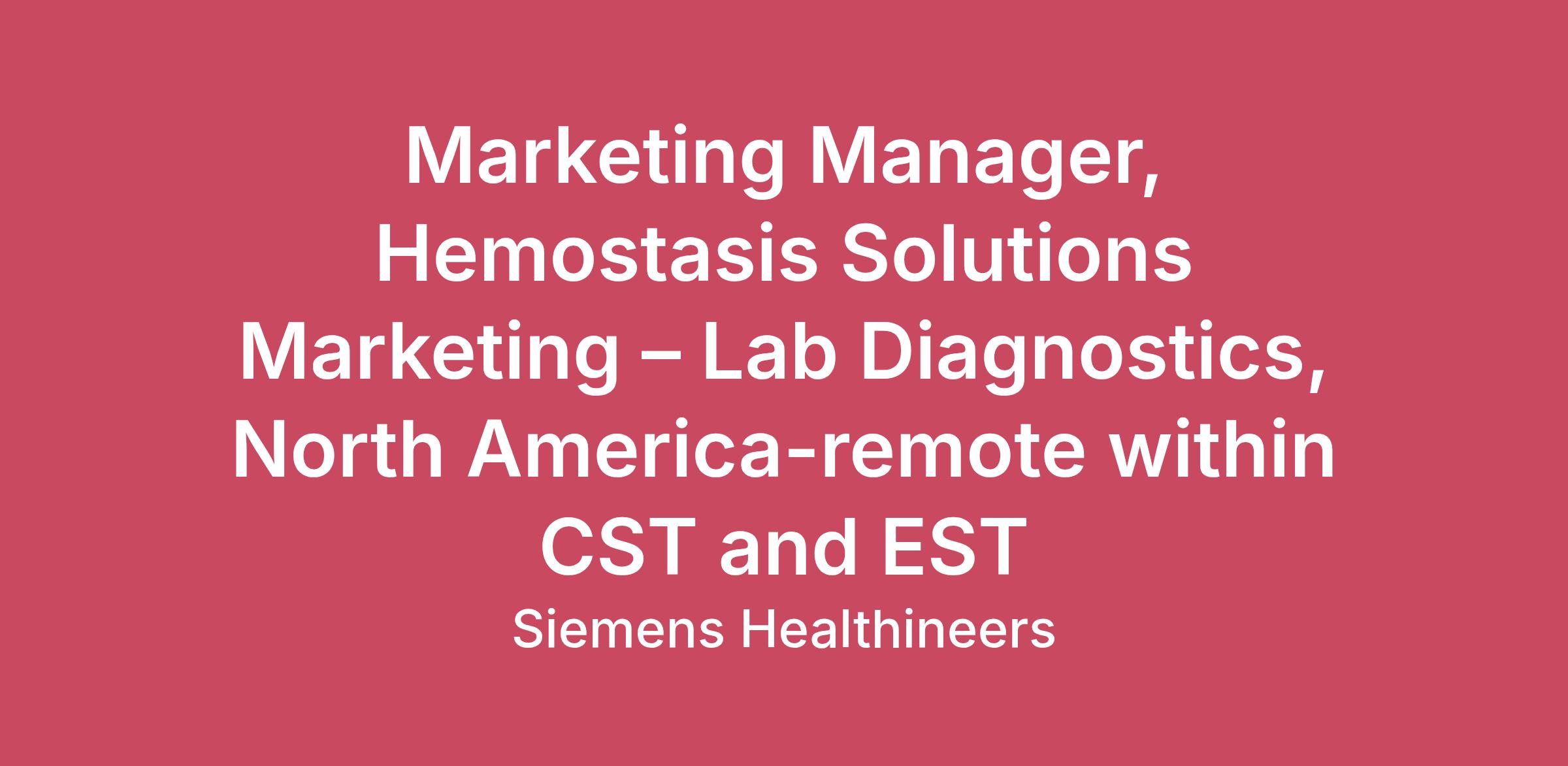 Join us in pioneering breakthroughs in healthcare. For everyone. Everywhere. Sustainably.Our inspiring and caring environment forms a global community that celebrates diversity and individuality. We encourage you to step beyond your comfort zone, offering resources and flexibility to foster your professional and personal growth, all while valuing your unique contributions.Shape the strategy. Elevate diagnostics. Impact patient care.At Siemens Healthineers, your work helps clinicians make critical decisions every day. As the Marketing Manager, Hemostasis Solutions, you will lead North America marketing strategy and commercialization for a growing diagnostics portfolio—driving product positioning, pricing, and go-to-market execution that fuels long-term growth.This role sits at the intersection of science, strategy, and storytelling, partnering closely with Global Marketing, Sales, and Clinical teams to bring innovative Hemostasis solutions to market while representing the voice of the North American customer.What You’ll DoLead U.S. strategic marketing plans and multi-year product roadmapsOwn product positioning, pricing strategy, and lifecycle managementServe as the Hemostasis subject-matter expert for Sales and cross-functional teamsTranslate complex technology into compelling clinical and commercial valueDrive demand-generation programs and sales enablement toolsInfluence global product decisions as the voice of U.S. customersBuild relationships with Key Opinion Leaders and clinical partnersDevelop and deliver impactful training for specialist sales teamsWhat You’ll BringBachelor’s degree in life sciences, business, or marketing (MBA preferred)4+ years of experience in medical device or diagnostics marketingHemostasis market experience preferredStrong business acumen with analytical and financial forecasting skillsAbility to thrive in a fast-paced, cross-functional environmentComfort presenting to internal leaders and external customersWhy Siemens Healthineers?You will join a global leader where innovation meets purpose—and where your work directly influences the future of healthcare diagnostics.#LI-BH1Who we are: We are a team of more than 72,000 highly dedicated Healthineers in more than 70 countries. As a leader in medical technology, we constantly push the boundaries to create better outcomes and experiences for patients, no matter where they live or what health issues they are facing. Our portfolio is crucial for clinical decision-making and treatment pathways.How we work: When you join Siemens Healthineers, you become one in a global team of scientists, clinicians, developers, researchers, professionals, and skilled specialists, who believe in each individual’s potential to contribute with diverse ideas. We are from different backgrounds, cultures, religions, political and/or sexual orientations, and work together, to fight the world’s most threatening diseases and enable access to care, united by one purpose: to pioneer breakthroughs in healthcare. For everyone. Everywhere. Sustainably.To find out more about Siemens Healthineers businesses, please visit our company page here.The base pay range for this position is:$117,770 - $161,931Factors which may affect starting pay within this range may include geography/market, skills, education, experience, and other qualifications of the successful candidate.If this is a commission eligible position the commission eligibility will be in accordance with the terms of the Company's plan. Commissions are based on individual performance and/or company performance. The Company offers the following benefits for this position, subject to applicable eligibility requirements: medical insurance, dental insurance, vision insurance, 401(k) retirement plan. life insurance, long-term and short-term disability insurance, paid parking/public transportation, paid time off, paid sick and safe time.Equal Employment Opportunity Statement: Siemens Healthineers is an Equal Opportunity and Affirmative Action Employer encouraging diversity in the workplace. All qualified applicants will receive consideration for employment without regard to their race, color, creed, religion, national origin, citizenship status, ancestry, sex, age, physical or mental disability unrelated to ability, marital status, family responsibilities, pregnancy, genetic information, sexual orientation, gender expression, gender identity, transgender, sex stereotyping, order of protection status, protected veteran or military status, or an unfavorable discharge from military service, and other categories protected by federal, state or local law.EEO is the Law: Applicants and employees are protected under Federal law from discrimination. To learn more, click here.Reasonable Accommodations: Siemens Healthineers is committed to equal employment opportunity. As part of this commitment, we will ensure that persons with disabilities are provided reasonable accommodations.If you require a reasonable accommodation in completing a job application, interviewing, completing any pre-employment testing, or otherwise participating in the employee selection process, please fill out the accommodations form here. If you’re unable to complete the form, you can reach out to our HR People Connect People Contact Center for support at peopleconnectvendorsnam.func@siemens-healthineers.com. Please note HR People Connect People Contact Center will not have visibility of your application or interview status. California Privacy Notice: California residents have the right to receive additional notices about their personal information. To learn more, click here.Export Control: “A successful candidate must be able to work with controlled technology in accordance with US export control law.” “It is Siemens Healthineers’ policy to comply fully and completely with all United States export control laws and regulations, including those implemented by the Department of Commerce through the Export Adminis