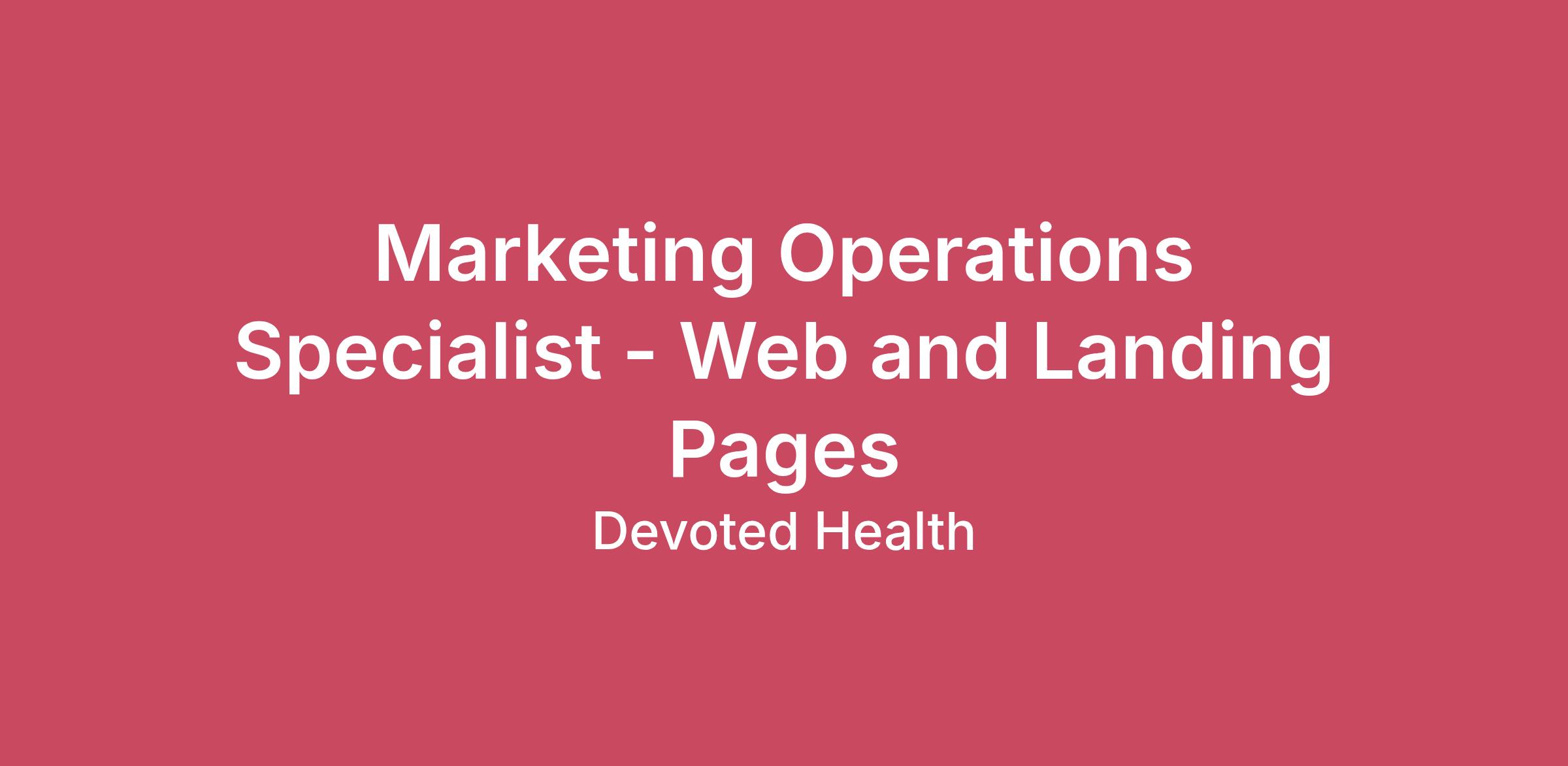 Job DescriptionA bit about this role: Growth marketing at Devoted sits at the intersection of technology, analytics, and consumer psychology. We take a data-driven approach to acquiring new Medicare Advantage members digitally—and the landing page and core website is where that work comes to life.As the Operations Specialist for Web & Landing Pages, you’ll own the end-to-end performance of our marketing landing pages — from initial build and ad-to-page connectivity, through CRM integration and tracking implementation, to ongoing A/B testing and conversion optimization. Outside marketing pages, you’ll work on improvements to the company’s website and shopping experience.You’ll also have a role in improving the system with which we customize marketing assets across our product portfolio, which is a critical process with high visibility across the marketing team. You’ll lean on your comfort with detail, process, and leveraging AI to drive wins here.This is a hands-on, detail-intensive role in a regulated industry. You need to be comfortable toggling between creative conversations about page design and deep-in-the-weeds, technical problem-solving on UTM parameters, pixel implementation, and CRM field mapping. The ideal candidate can communicate with both left and right brained colleagues, and is excited about making numbers go up. You’re a master of the details, and can also talk about the big picture with senior stakeholders.Your Responsibilities and Impact will include: Own the build, maintenance, and QA of all marketing landing pages — ensuring every page is properly connected from ad click through to CRM entry with correct tracking parameters (UTMs, pixels, conversion events) firing at every stepDesign and run a structured A/B testing program, spanning headlines, layouts, CTAs, form fields, creative concepts; generate new hypotheses from performance data, competitive research, and consumer insight; put forth the key metrics that define success for each test; and run the testing implementationPartner with copy and design colleagues to develop high-performing, compliant pages and new test creative to drive your testing program success; partner with digital growth channel managers on shaping overall funnel successBuild and maintain reporting dashboards that track key landing page metrics, present performance updates and recommendations to marketing leadershipCoordinate with engineering and data teams on CRM integrations and data flows, and with compliance to ensure all pages meet CMS regulatory requirementsSupport general web operations by managing content for the company’s website, including homepage, educational, and high-intent shopping pages – and track and report on the metrics that tell us if the pages are successfulLeverage AI tools to accelerate content versioning, QA workflows, and testing velocityDrive ongoing improvements to our versioning system that customizes marketing assets across 100+ markets to match local product details and messagingRequired skills and experience:2+ years in digital marketing, marketing operations, or growth marketing with hands-on landing page management and working knowledge of the martech stack (tag managers, analytics platforms, conversion tracking, CRM systems, landing page builders)Proven track record running A/B testing programs and using data to drive optimization — strong analytical skills, comfortable in Excel/Sheets and web analytics tools, able to translate numbers into business recommendationsTechnical-enough to implement tracking tags, UTM parameters, troubleshoot pixel fires, configure form-to-CRM integrations, and file a precise ticket for an engineerAttention to detail in a high-volume, multi-market environment where a misplaced parameter can throw off attribution for an entire campaign — and comfort operating in a regulated space where marketing materials require layers of compliance reviewIntellectual curiosity and consumer centricity — you’re always asking “what if we tried…” and you think about the 65-year-old on the other side of the screen, not just the conversion rateDesired skills and experience: UI/UX sensibility (you may not be a designer, but you know when a page feels right)familiarity with SQL or SnowflakeHTML/CSS literacycomfort with Google Analytics (GA4)experience with CRO tools (Optimizely, VWO, Unbounce)Salary range: $82,000 - $110,000 annually#LI-RemoteThe pay range listed for this position is the range the organization reasonably and in good faith expects to pay for this position at the time of the posting. Once the interview process begins, your talent partner will provide additional information on the compensation for the role, along with additional information on our total rewards package. The actual base salary offered will depend on a variety of factors, including the qualifications of the individual applicant for the position, years of relevant experience, specific and unique skills, level of education attained, certifications or other professional licenses held, and the location in which the applicant lives and/or from which they will be performing the job.Our Total Rewards package includes:Employer sponsored health, dental and vision plan with low or no premiumGenerous paid time off$100 monthly mobile or internet stipendStock options for all employeesBonus eligibility for all roles excluding Director and above; Commission eligibility for Sales rolesParental leave program401K programAnd more....*Our total rewards package is for full time employees only. Intern and Contract positions are not eligible.Healthcare equality is at the center of Devoted’s mission to treat our members like family. We are committed to a diverse and vibrant workforce. At Devoted Health, we’re on a mission to dramatically improve the health and well-being of older Americans by caring for every person like family. That’s why we’re gathering smart, diverse, and big-hearted people to create a new k