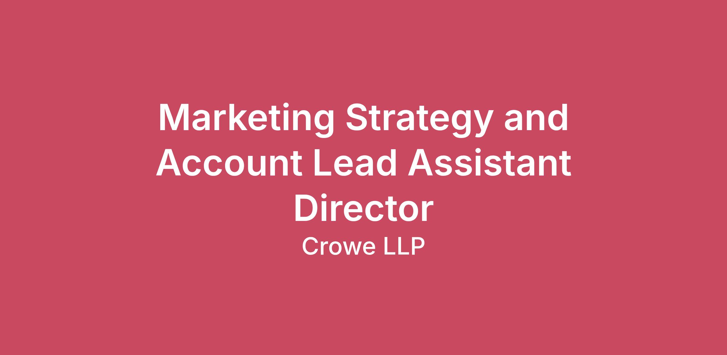 Your Journey at Crowe Starts Here:At Crowe, you can build a meaningful and rewarding career. With real flexibility to balance work with life moments, you’re trusted to deliver results and make an impact. We embrace you for who you are, care for your well-being, and nurture your career. Everyone has equitable access to opportunities for career growth and leadership. Over our 80-year history, delivering excellent service through innovation has been a core part of our DNA across our audit, tax, and consulting groups. That’s why we continuously invest in innovative ideas, such as AI-enabled insights and technology-powered solutions, to enhance our services. Join us at Crowe and embark on a career where you can help shape the future of our industry.Job Description:The Marketing Strategy and Account Lead (Assistant Director) leads buyer-centric marketing strategy and execution across assignedaccounts and/or segments. This role serves as a trusted advisor to business and account leaders and is accountable for driving integratedmarketing programs that support growth, brand relevance, and demand generation. Working within enterprise strategy frameworks, theAssistant Director adapts and applies those strategies to complex account environments, orchestrating internal teams and partners to deliverconsistent, high-quality buyer experiences. This role also plays a key part in surfacing market insights, performance data, and executionlearnings to inform broader strategy and continuous improvement.Core Responsibilities:Account & Segment Leadership• Lead buyer-centric marketing strategy for assigned accounts and/or segments, aligned to firm and segment priorities.• Serve as a strategic advisor to account and business leaders, accountable for marketing outcomes and performance.• Navigate complex stakeholder environments to align priorities and drive forward momentum. Buyer-Centric Strategy Application• Apply enterprise buyer strategies, value propositions, and engagement models to account- and segment-level plans.• Ensure marketing approaches reflect buyer needs, decision journeys, and market demand.• Adapt strategy to account complexity while maintaining consistency with firm direction. Market & Buyer Intelligence• Develop deep understanding of assigned markets, buyers, competitors, and growth opportunities.• Apply insights and data to inform positioning, messaging, and go-to-market execution.• Feed buyer signals, market feedback, and performance insights back into the Strategy team. Campaign Strategy, Execution & Optimization• Lead integrated campaign strategy, planning, execution and optimization across channels and buyer stages.• Partner with marketing teams, sales, product and external partners to ensure consistent delivery.• Use performance data to optimize programs and improve ROI. Network Orchestration• Orchestrate cross-functional teams and partner networks to deliver impactful marketing strategies and programs.• Manage stakeholder communication, resolve conflicts and problem solve. Performance & Accountability• Track and report on KPIs related to buyer engagement, demand contribution and account/segment performance.• Provide transparency on outcomes, risks and optimization opportunities.• Ensure marketing investments are aligned to business priorities and deliver measurable value. Team Leadership & Brand Stewardship• Lead and mentor team members aligned to accounts or segments.• Model strong collaboration, accountability, and firm values.• Ensure all marketing efforts reflect brand standards. #LI-SAW -LI-RemoteQualifications:• Bachelor's degree required in Marketing, Communications, or related field• Requires minimum of 10+ years’ experience in marketing strategy and account management (professional services and agency experience is a plus)• Proficient in all marketing channels, especially digital and social• Experience with Project Management software, Workfront and/or Cvent is a plus• Proficiency in Microsoft Office Suite including Word and PowerPoint required• High comfort level with AI tools and daily use of technologies like ChatGPT and Copilot to enhance productivity and innovation• Demonstrated influence leadership skills; ability to manage up, down and across• Excels at collaboration, with strong communication skills• Local focus; global mindset• Strong ability to interpret qualitative and quantitative data to create business implications• Strong ability to translate analysis into easily understood insights• Excellent problem solving and decision-making skills• Remote role with some domestic travel as needed• Intellectually curious, a creative thinker with high data aptitude• An ability to educate, to raise the marketing acumen of the firmWe expect the candidate to uphold Crowe’s values of Care, Trust, Courage, and Stewardship. These values define who we are. We expect all of our people to act ethically and with integrity at all times.The application deadline for this role is 06/30/2026.In compliance with federal law, all persons hired will be required to verify identity and eligibility to work in the United States and to complete the required employment eligibility verification form upon hire. Crowe is not sponsoring for work authorization at this time.The wage range for this role takes into account the wide range of factors that are considered in making compensation decisions including but not limited to skill sets; experience and training; licensure and certifications; and other business and organizational needs. The disclosed range estimate has not been adjusted for the applicable geographic differential associated with the location at which the position may be filled. At Crowe, it is not typical for an individual to be hired at or near the top of the range for their role and compensation decisions are dependent on the facts and circumstances of each case. A reasonable estimate of the current range is $103,