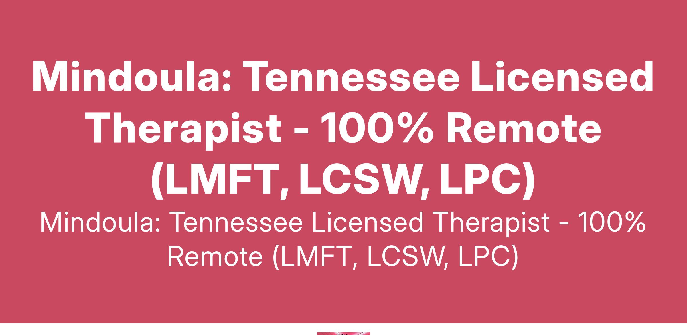 To apply: https://weworkremotely.com/remote-jobs/mindoula-tennessee-licensed-therapist-100-remote-lmft-lcsw-lpc