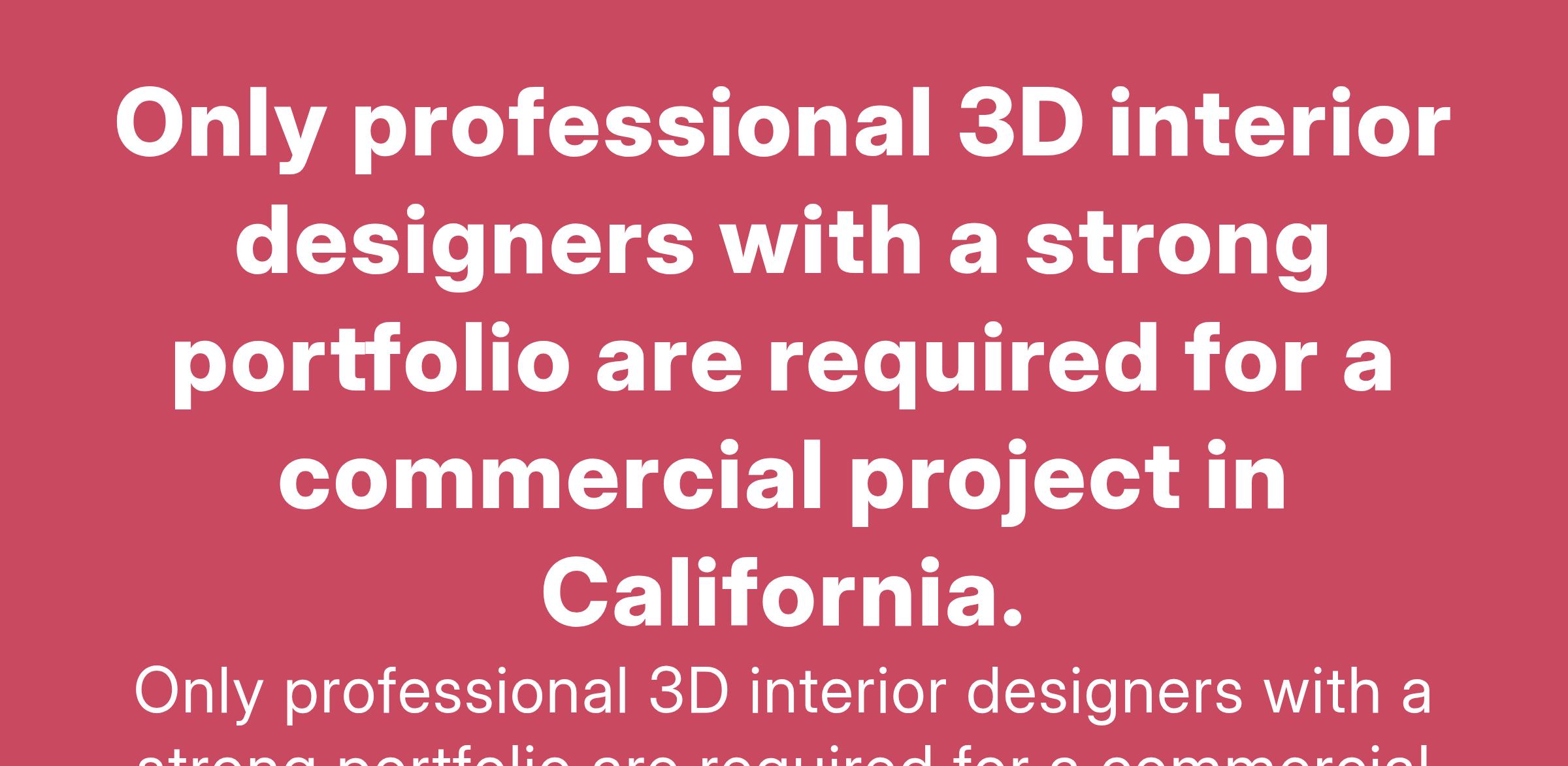 We are seeking a talented designer to create a contemporary Interior and exterior design for a newly built large residential hotel and commercial area in California. The ideal candidate should have experience... (Budget: $25 - $50 USD, Jobs: 3D Modelling, 3D Rendering, AutoCAD, Building Architecture, Interior Design)