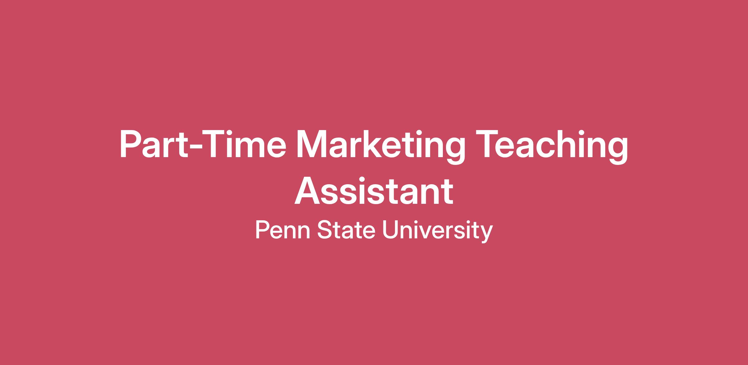APPLICATION INSTRUCTIONS:CURRENT PENN STATE EMPLOYEE (faculty, staff, technical service, or student), please login to Workday to complete the internal application process. Please do not apply here, apply internally through Workday. CURRENT PENN STATE STUDENT (not employed previously at the university) and seeking employment with Penn State, please login to Workday to complete the student application process. Please do not apply here, apply internally through Workday.If you are NOT a current employee or student, please click “Apply” and complete the application process for external applicants. Approval of remote and hybrid work is not guaranteed regardless of work location. For additional information on remote work at Penn State, see Notice to Out of State Applicants. JOB DESCRIPTION AND POSITION REQUIREMENTSThe Department of Marketing in the Smeal College of Business is seeking a teaching assistant for the online Masters degree course, MKTG 540 (Marketing Analytics) for spring 2026 (Jan 20 to May 1) taught by Professor Arvind Rangaswamy. Responsibilities include grading, monitoring discussion board, and answering queries related to course content.The ideal candidate will have the following background/experience: Good quantitative skills (e.g. Statistics, Mathematics, Economics, Computer Science), 3 - 5 years industry experience, successful completion of a previous offering of MKTG 540 or equivalent course, good knowledge of marketing, and good writing and communication skills. Flexible work schedule requiring 10 hours per week. This is a part-time position with hourly pay commensurate with background and experience. BACKGROUND CHECKS/CLEARANCESEmployment with the University will require successful completion of background check(s) in accordance with University policies. CAMPUS SECURITY CRIME STATISTICSPursuant to the Jeanne Clery Disclosure of Campus Security Policy and Campus Crime Statistics Act and the Pennsylvania Act of 1988, Penn State publishes a combined Annual Security and Annual Fire Safety Report (ASR). The ASR includes crime statistics and institutional policies concerning campus security, such as those concerning alcohol and drug use, crime prevention, the reporting of crimes, sexual assault, and other matters. The ASR is available for review here. EEO IS THE LAWPenn State is an equal opportunity employer and is committed to providing employment opportunities to all qualified applicants without regard to race, color, religion, age, sex, sexual orientation, gender identity, national origin, disability or protected veteran status. If you are unable to use our online application process due to an impairment or disability, please contact 814-865-1473. The Pennsylvania State University is committed to and accountable for advancing equity, respect, and belonging. We embrace individual uniqueness, as well as a culture of belonging that supports equity initiatives, leverages the educational and institutional benefits of inclusion in society, and provides opportunities for engagement intended to help all members of the community thrive. We value belonging as a core strength and an essential element of the university’s teaching, research, and service mission. Federal Contractors Labor Law PosterPA State Labor Law PosterPenn State PoliciesCopyright InformationHotlines