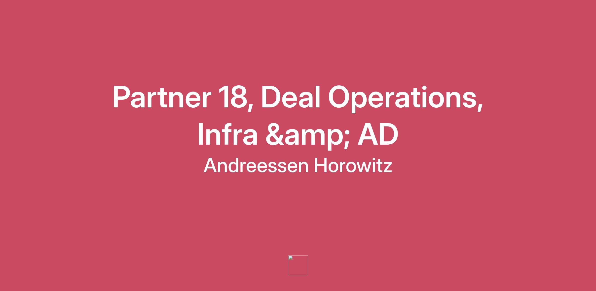 a16z is growing and we are looking to bring on a dynamic operations partner for our investing team. This team is on the front lines of our mission and innovation, managing the a16z deal process, from initial inbound deals to partnership meetings. In this role, you will be responsible for the program management of our deal process and working cross-functionally with one or more of our funds and the investing teams associated with them.