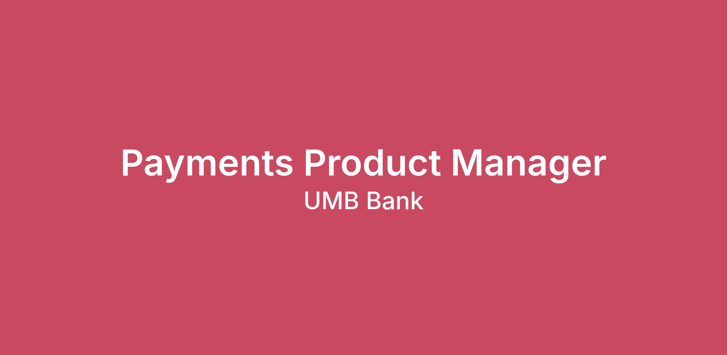 The Payments Product group manages and delivers payments products for the Bank’s clients, including consumers, small businesses, corporate and institutional.As the Payments Product Manager, you will be a thought leader around the execution of our payments strategy and responsible for prioritizing and managing the delivery of the Bank’s payment solutions, specifically focusing on wires and emerging payments (RTP, FedNow, Zelle).This role is hybrid (Mon through Thu on-site) for candidates in the Kansas City metropolitan area and open to qualified remote candidates outside of the Kansas City area but only within the US.How you’ll spend your time: Create product roadmaps for the Payments Products using industry trends, market research, Voice of Client feedback, and input from key stakeholders.Oversee planning, execution, and monitoring of strategic payment initiatives.Identify market trends, customer needs, and competitive landscape to drive product enhancements and innovations.Analyze and report on payments usage, trends and profitability.Serve as a Payments Subject Matter Expert for internal teams, including leading strategic planning for product direction and understanding the end-to-end customer experience for payments products.Work closely with Operations, IT and Digital Product Managers to deliver new functionality, enhancements and capabilities in the Payments space.Partner with product marketing and sales enablement to ensure market success for product launches and enhancements.Identify and partner with key vendors, fin-techs, etc. to develop and expand the go-to market offerings.Partner with internal departments (compliance, legal, audit, credit and risk) to ensure that all product features and functionality meet company and regulatory standards.Engage with internal stakeholders, including Senior Management, Sales, Implementation and Customer Support, to understand their needs and align development initiatives.Ensure all internal and external product documentation and due diligence is current.We’re excited to talk if you have: An undergraduate degree including 7+ years of product management experience and 5+ years treasury and payments experience OR any combination of education and experience that would provide an equivalent background.Experience gaining influence and cross functional consensus.Experience interpreting market and financial data to align strategies as well as build innovation around the products and features.Strong analytical and problem-solving abilities, with a data-driven approach to decision-making.A motivated and organized self-starter mindset with strong attention to detail and ability to manage multiple priorities.Experience and understanding of Treasury Payments product use cases and back-end functionality.A thorough understanding of emerging payment rails (RTP, FedNow, etc.) and/or have experience leading new payment rail initiatives.Bonus Points If:You have any of the following certifications: CTP, AAP, APRP, NCP, AFPP.Applicants must have legal authority to work in the United States. Work Visa sponsorship is not available for this position.Deadline to apply: April 28, 2026Compensation Range:$83,200.00 - $178,800.00The posted compensation range on this listing represents UMB’s standard for this role, but the actual compensation may vary by geographic location, experience level, and other job-related factors. In addition, this range does not encompass the full earning potential for this role. Please see the description of benefits included with this job posting for additional information.UMB offers competitive and varied benefits to eligible associates, such as Paid Time Off; a 401(k) matching program; annual incentive pay; paid holidays; a comprehensive company sponsored benefit plan including medical, dental, vision, and other insurance coverage; health savings, flexible spending, and dependent care accounts; adoption assistance; an employee assistance program; fitness reimbursement; tuition reimbursement; an associate wellbeing program; an associate emergency fund; and various associate banking benefits. Benefit offerings and eligibility requirements vary.Are you ready to be part of something more?You're more than a means to an end—a way to help us meet the bottom line. UMB isn't comprised of workers, but of people who care about their work, one another, and their community. Expect more than the status quo. At UMB, you can expect more heart. You'll be valued for exactly who you are and encouraged to support causes you care about. Expect more trust. We want you to do the right thing, no matter what. And, expect more opportunities. UMBers are known for having multiple careers here and having their voices heard.UMB and its affiliates are committed to inclusion and diversity and provide employment opportunities to all employees and applicants for employment without regard to race, color, religion, sex (including gender, pregnancy, sexual orientation, and gender identity), national origin, age, disability, military service, veteran status, genetic information, or any other status protected by applicable federal, state, or local law. If you need accommodation for any part of the employment process because of a disability, please send an e-mail to talentacquisition@umb.com to let us know the nature of your request.If you are a California resident, please visit our Privacy Notice for California Job Candidates to understand how we collect and use your personal information when you apply for employment with UMB.